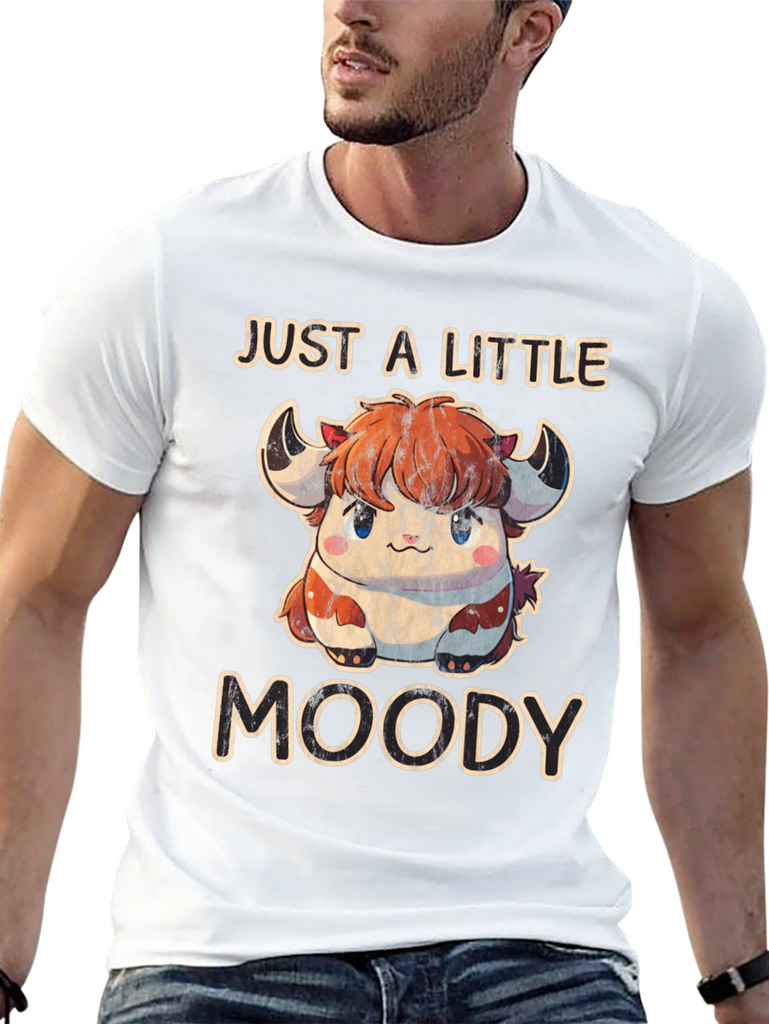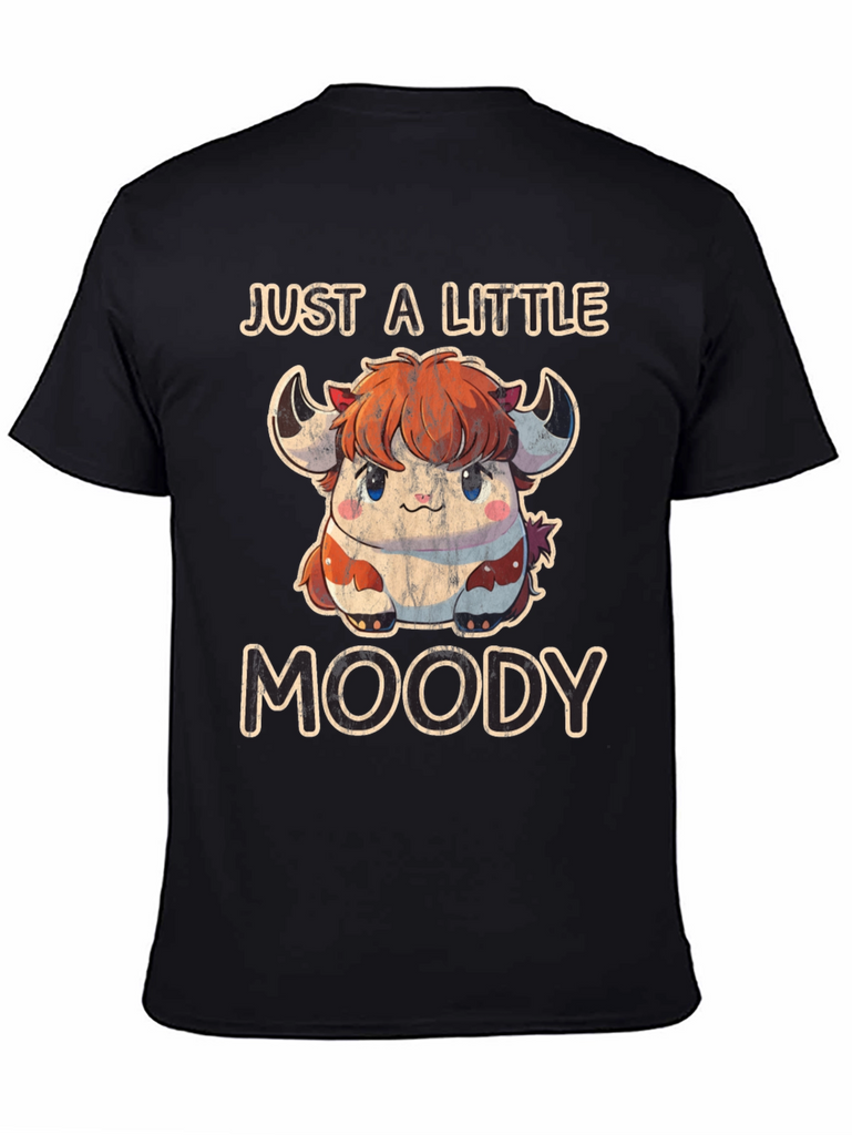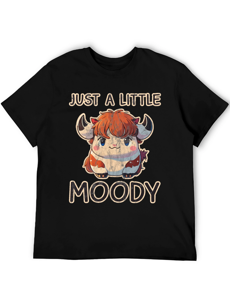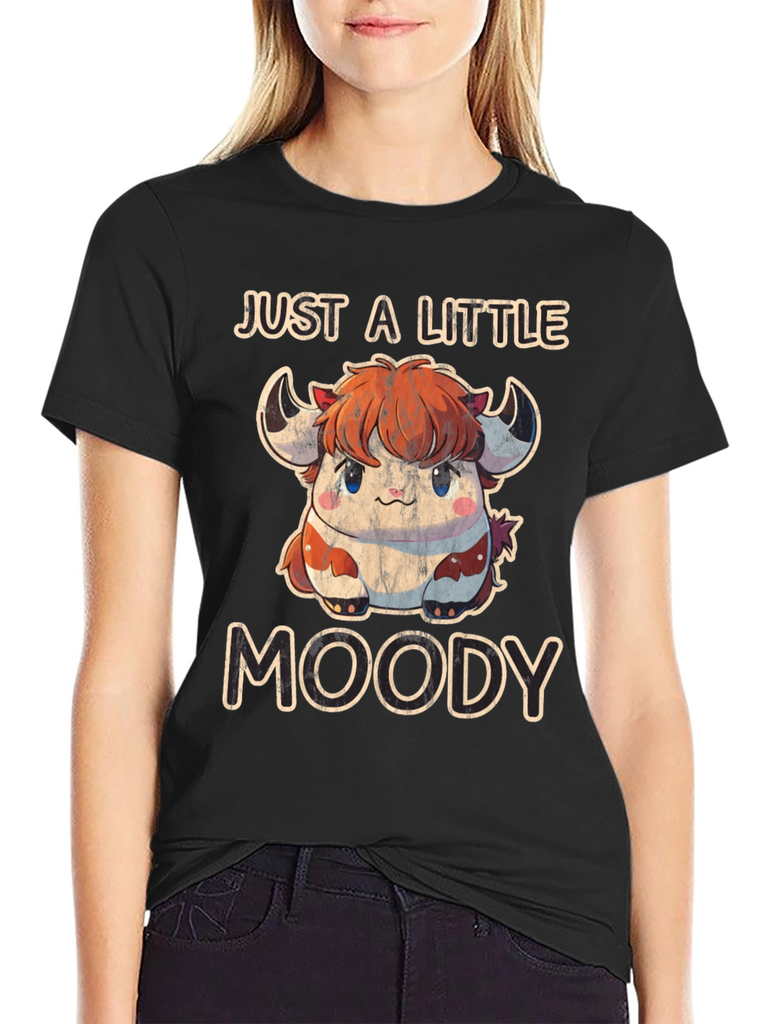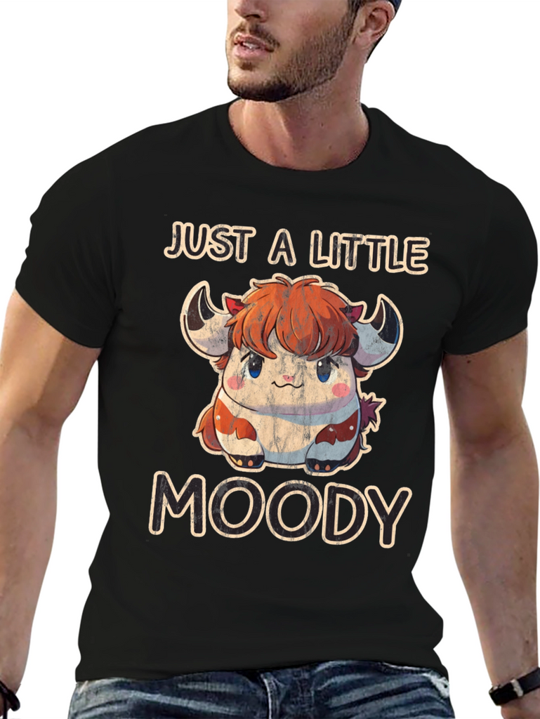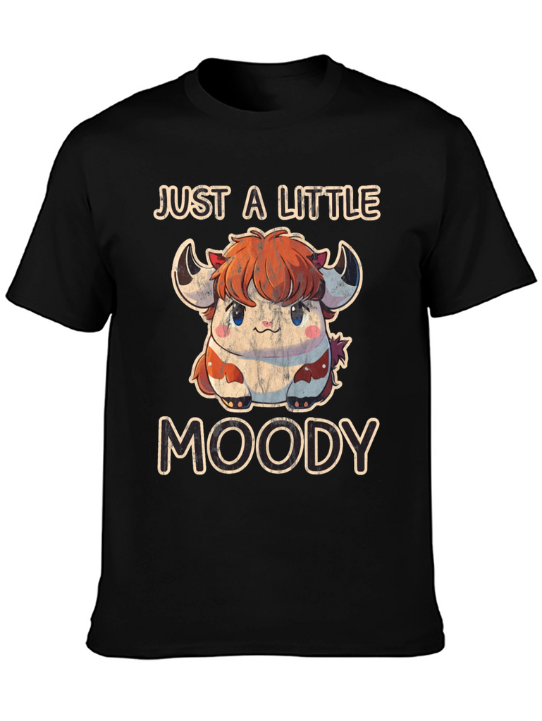 Express your personality with this unique black tee! Featuring a cute, cartoon-style cow graphic and the phrase "Just A Little Moody," this shirt is perfect for those who embrace their emotions. The vintage-inspired design adds a touch of character. Made from comfortable materials, this tee is ideal for everyday wear. Pair it with jeans or shorts for a casual look. A fun and expressive addition to your wardrobe!