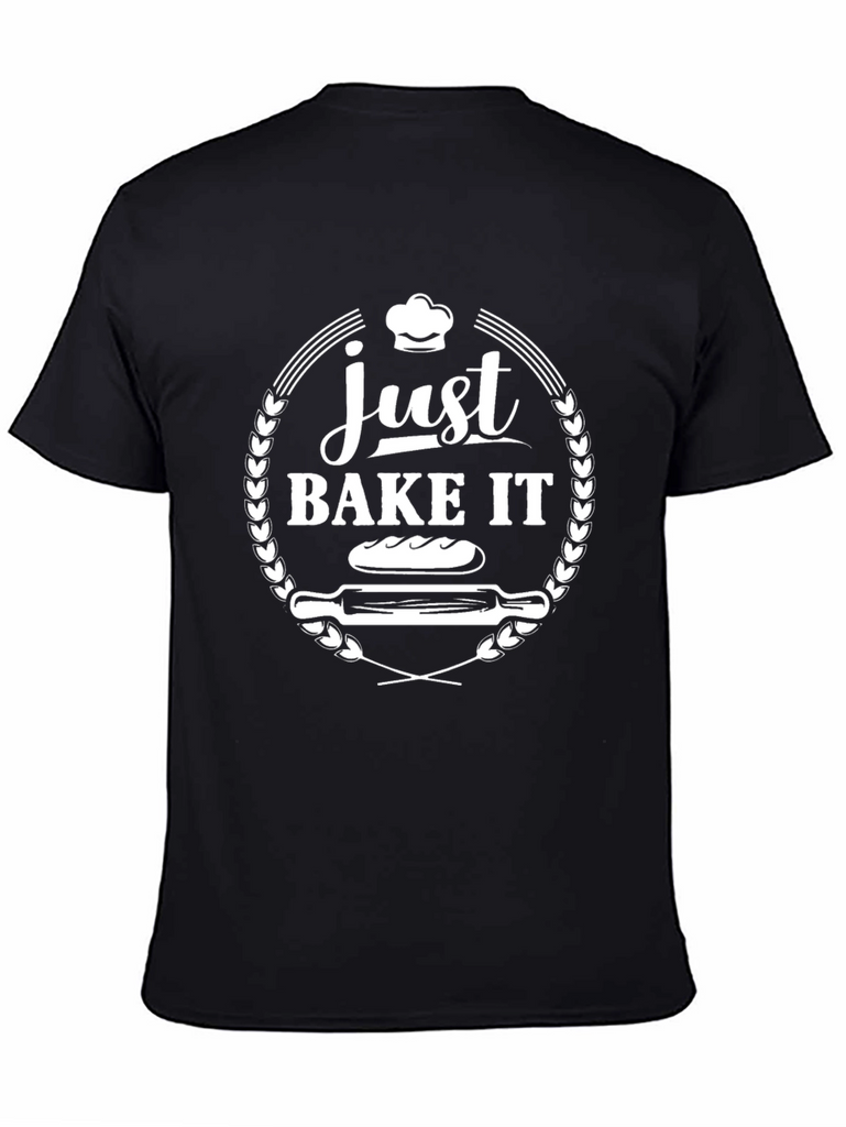This stylish black t-shirt is perfect for any baking enthusiast. Featuring a unique graphic design with the words "Just Bake It" encircled by a wreath of wheat, a chef's hat, a baguette, and a rolling pin, it's sure to be a conversation starter. The design is printed in white, offering a striking contrast against the dark fabric. Made from comfortable and durable material, this tee is perfect for everyday wear, whether you're whipping up treats in the kitchen or out and about. It's a great gift for bakers, pastry chefs, or anyone who loves to bake!