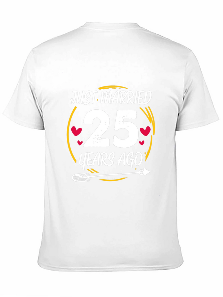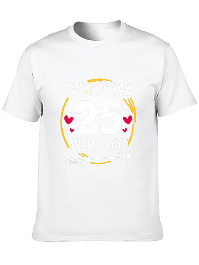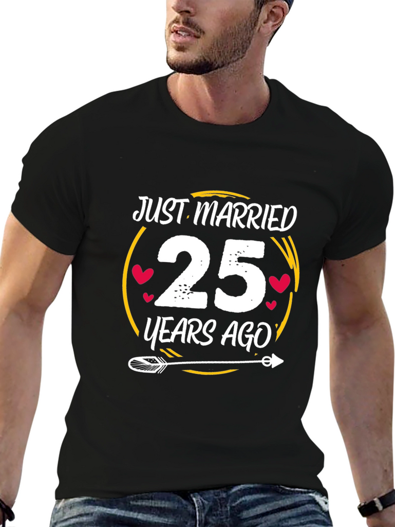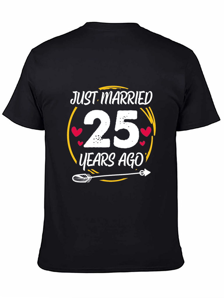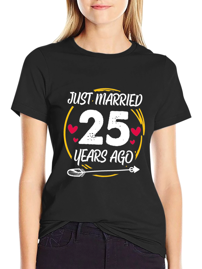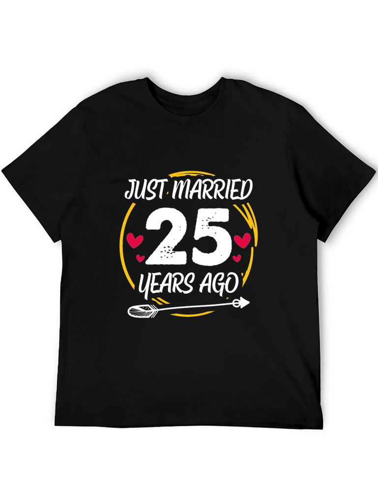 Celebrate a quarter-century of love with this charming "Just Married 25 Years Ago" T-shirt. Made from a comfortable, likely cotton blend, this black tee features a whimsical graphic design, perfect for an anniversary celebration or a fun way to commemorate 25 years of marriage. The design includes the words "Just Married," the number 25, "Years Ago", hearts, and an arrow accent. This shirt is a great gift for couples celebrating their silver anniversary, whether they are attending a party or enjoying a casual day out.