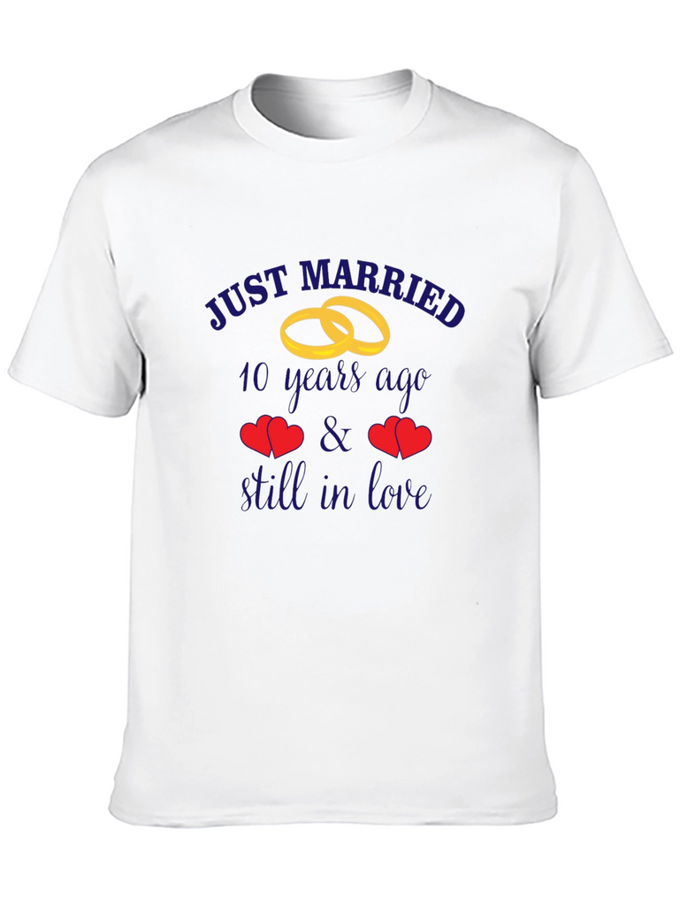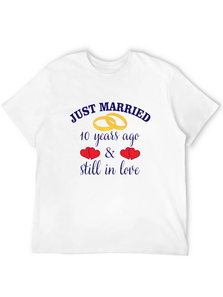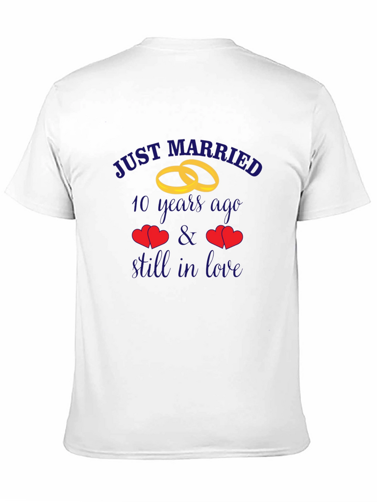Celebrate enduring love with this charming black t-shirt. The shirt features a delightful graphic print with the words "Just Married," accompanied by golden rings, and "10 years ago" with two red hearts and "still in love" written in stylish blue script. Perfect for couples celebrating their 10th wedding anniversary, this shirt is a fun and memorable way to express lasting affection. Made from comfortable fabric, it's ideal for casual wear, anniversary parties, or as a thoughtful gift for a special couple. Show off your love story with this unique and heartwarming tee!