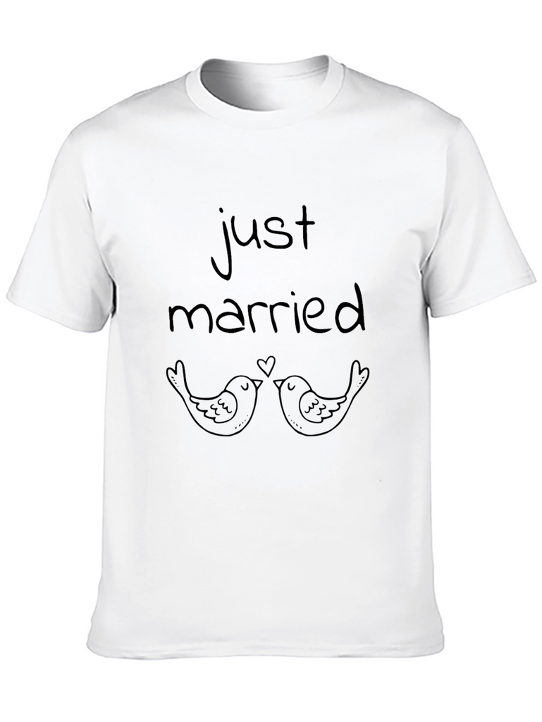 Celebrate your special day with this charming black t-shirt. Featuring the phrase 'Just Married' above two adorable cartoon birds facing each other with a small heart above them, this shirt is perfect for newlyweds. The design is simple yet sweet, making it a fun and comfortable way to announce your newlywed status. Made from a soft and breathable fabric, it's ideal for casual outings, honeymoon travels, or even as a cozy loungewear option. Show off your love with this delightful t-shirt!