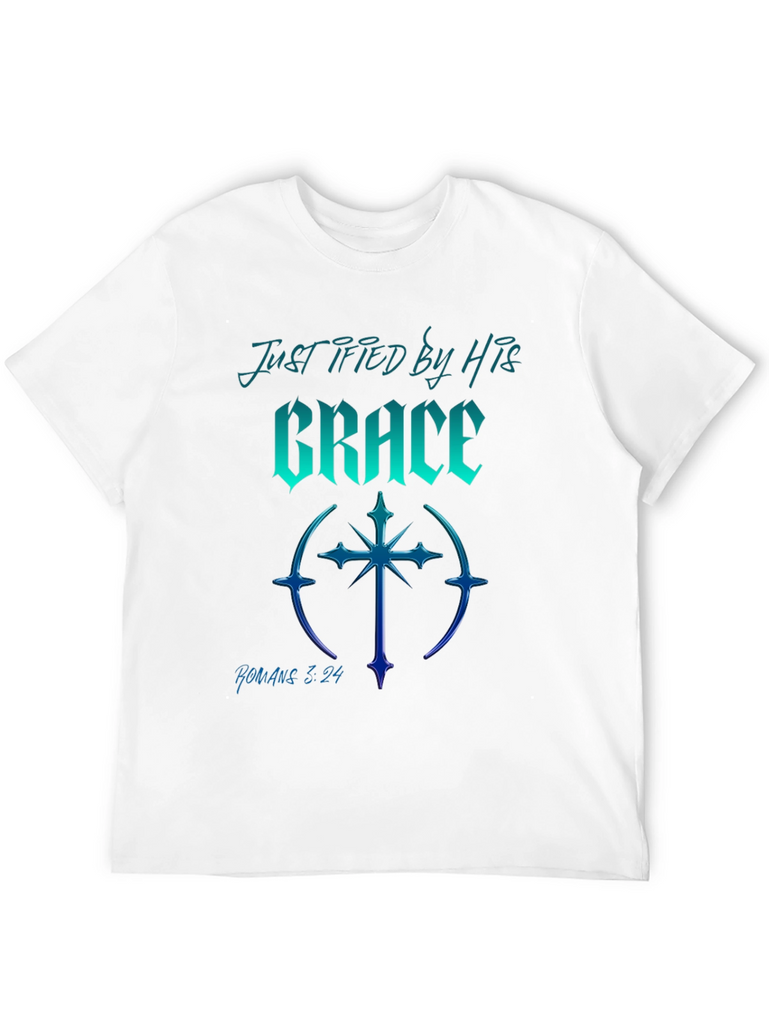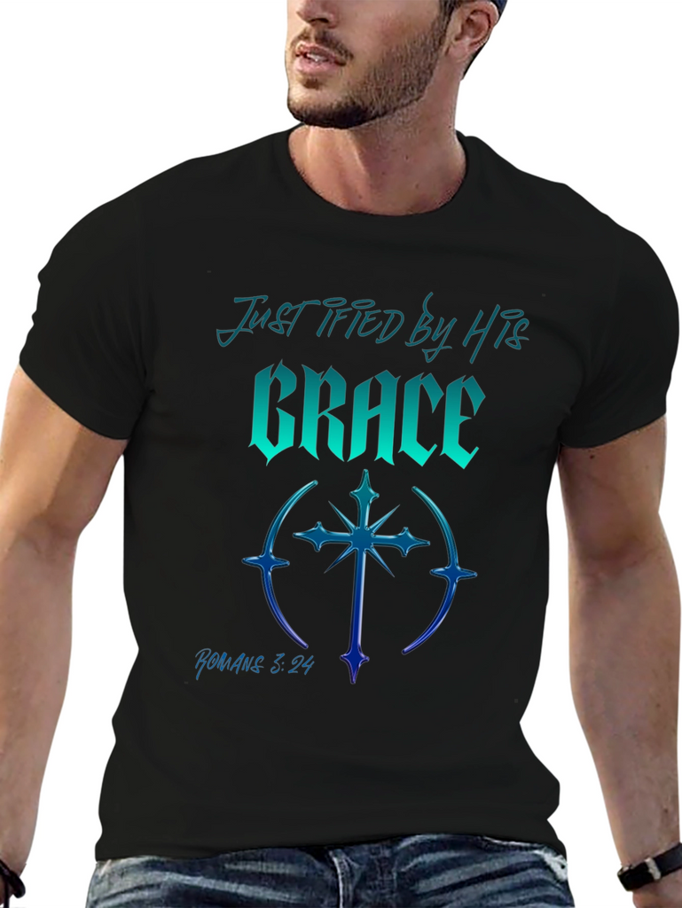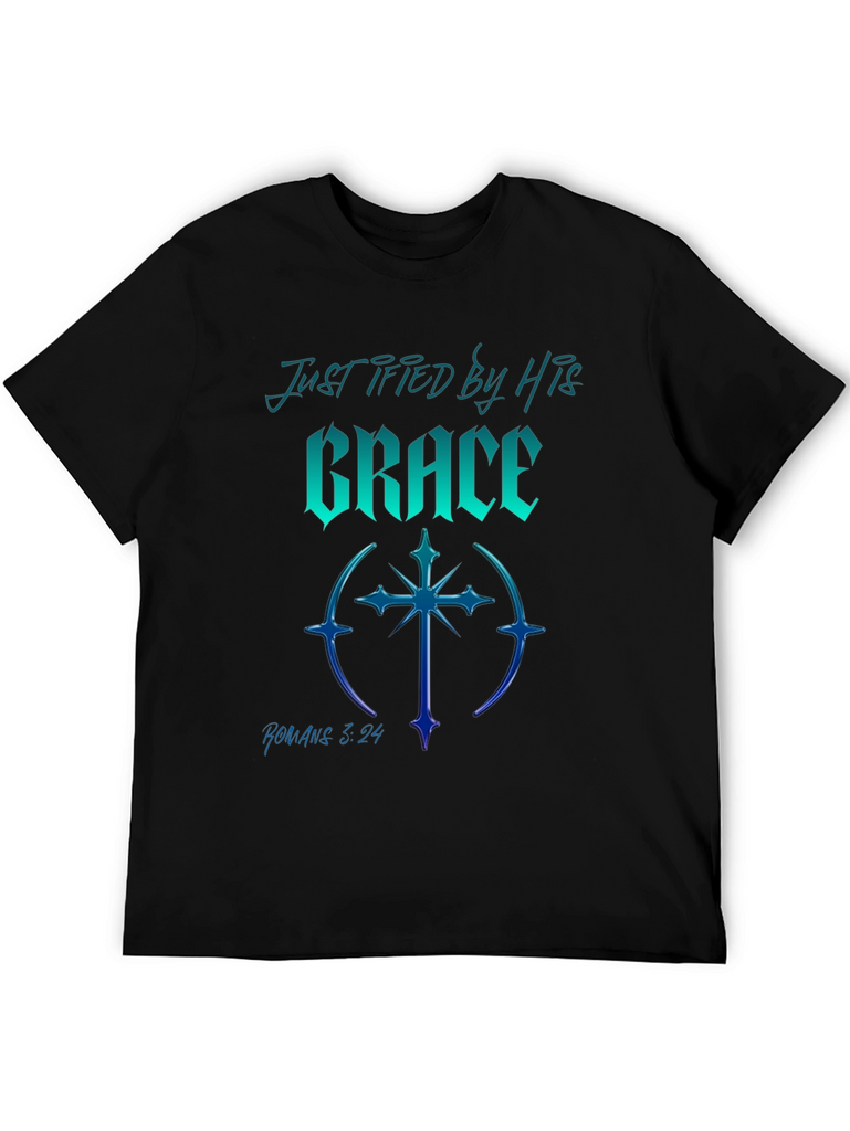 Embrace faith with this stylish black t-shirt featuring a striking design. The shirt showcases the words "Justified By His Grace" in an eye-catching blue gradient font, complemented by the scripture "Romans 3:24". A unique, stylized cross design adorns the center, adding a touch of spirituality and modern flair. Made from a comfortable-looking fabric, this t-shirt is perfect for casual wear, church events, or as a thoughtful gift for loved ones. Show your devotion with this unique and inspiring garment.