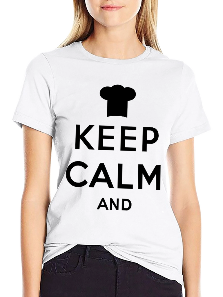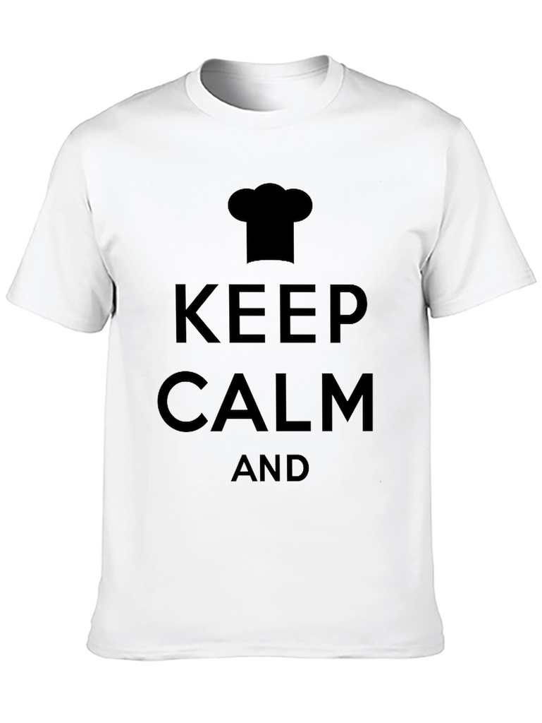 Show off your culinary passion with this stylish black T-shirt! The shirt features the iconic "Keep Calm" slogan, topped with a chef's hat graphic. Made from what appears to be soft, breathable cotton, this tee offers both comfort and durability. The classic fit makes it ideal for everyday wear, whether you're cooking up a storm in the kitchen, running errands, or simply relaxing at home. This versatile shirt is perfect for chefs, bakers, foodies, or anyone who enjoys a touch of humor in their wardrobe. A great gift for the cooking enthusiast in your life!