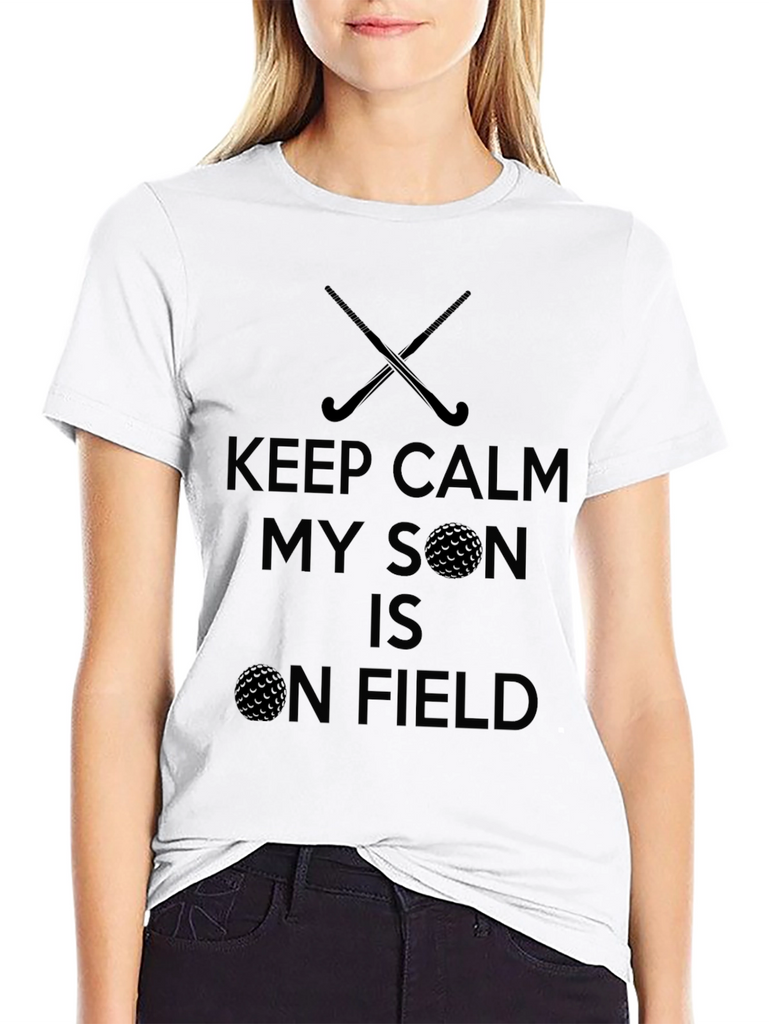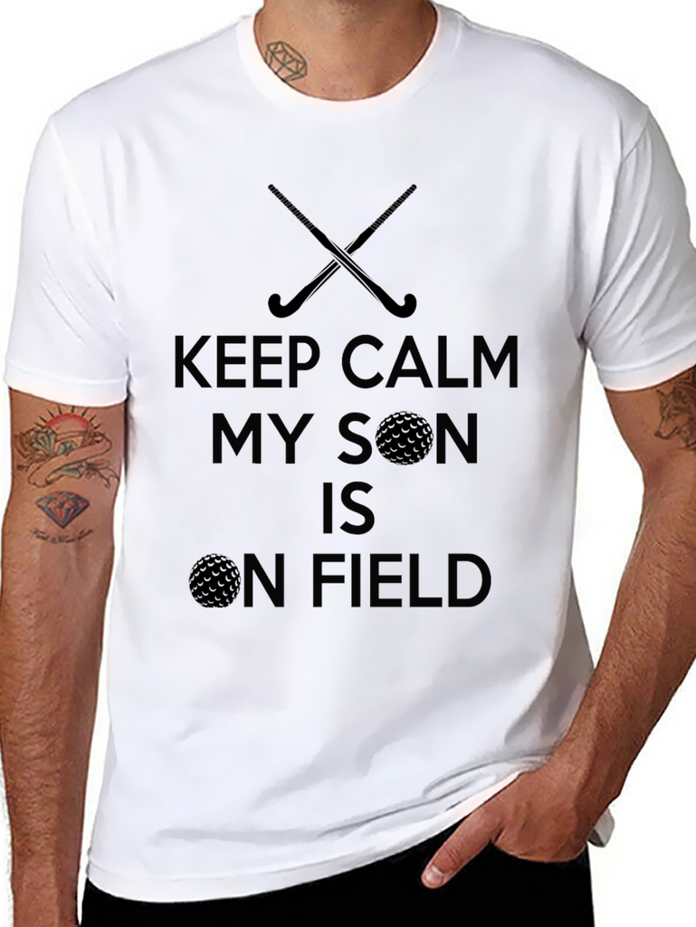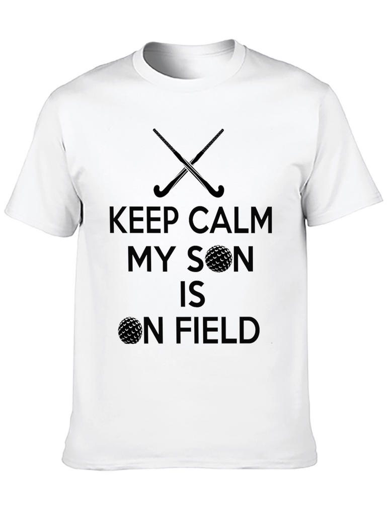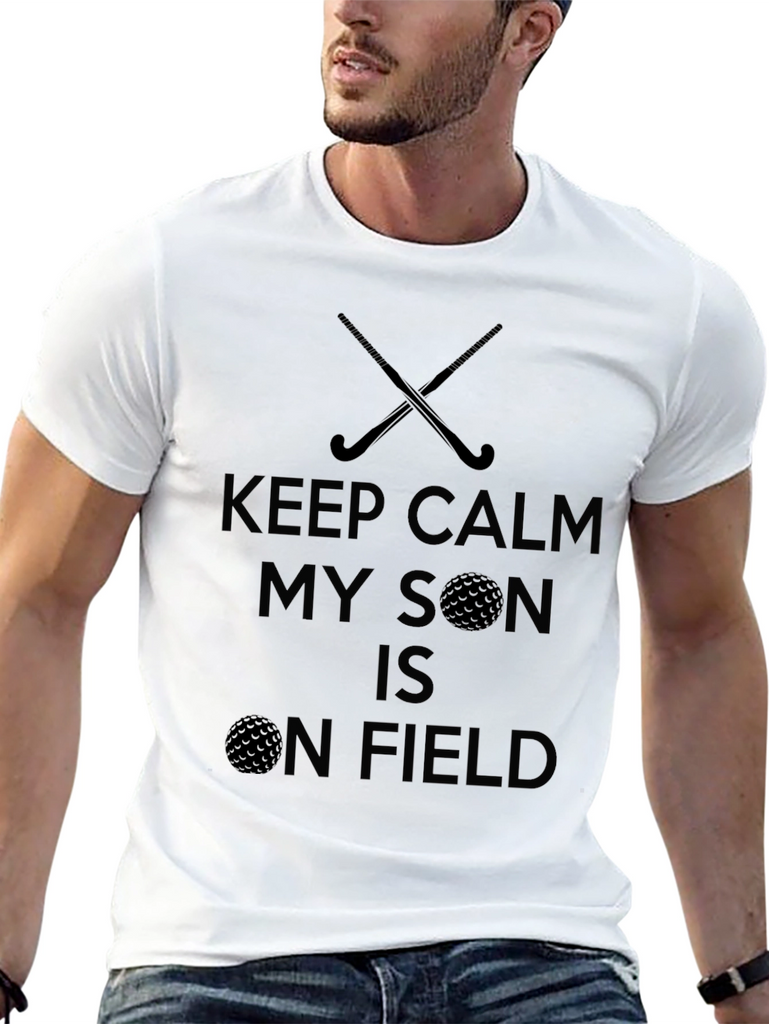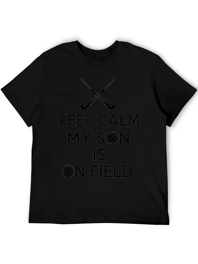 This black t-shirt features a fun graphic design. The design includes crossed hockey sticks and a golf ball. The text says "KEEP CALM MY SON IS ON FIELD". The dark print stands out well against the black background. This shirt is perfect for a parent who loves watching their son play field hockey or golf. It is ideal for casual wear, sporting events, or as a fun gift.
