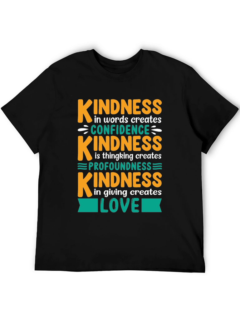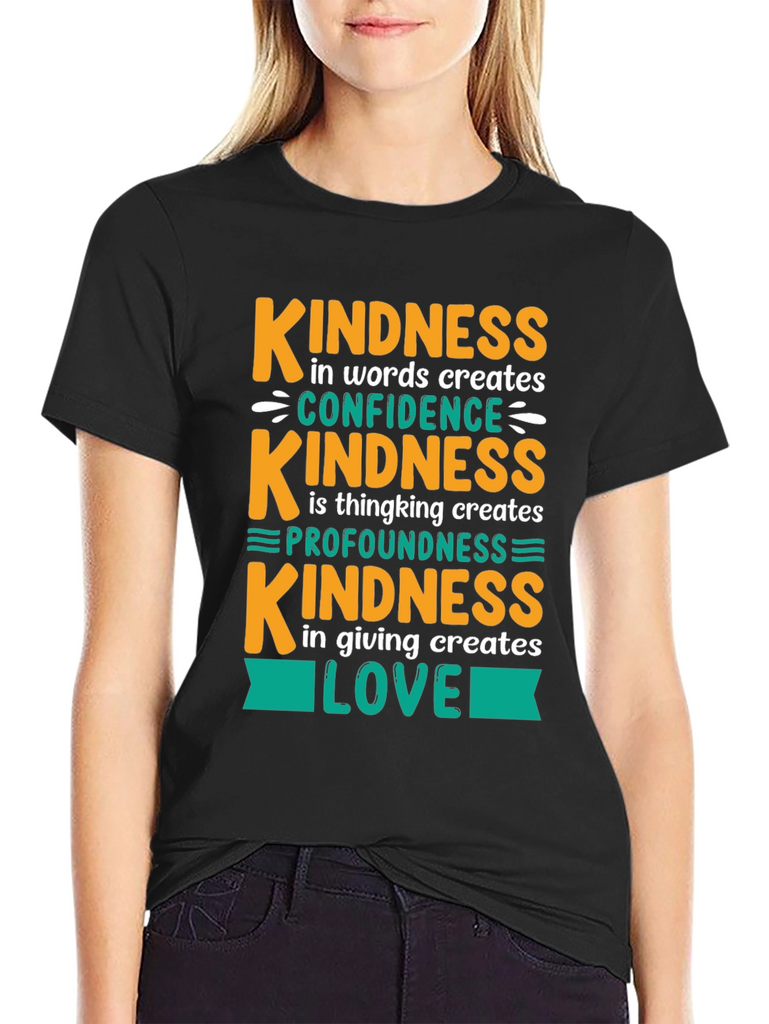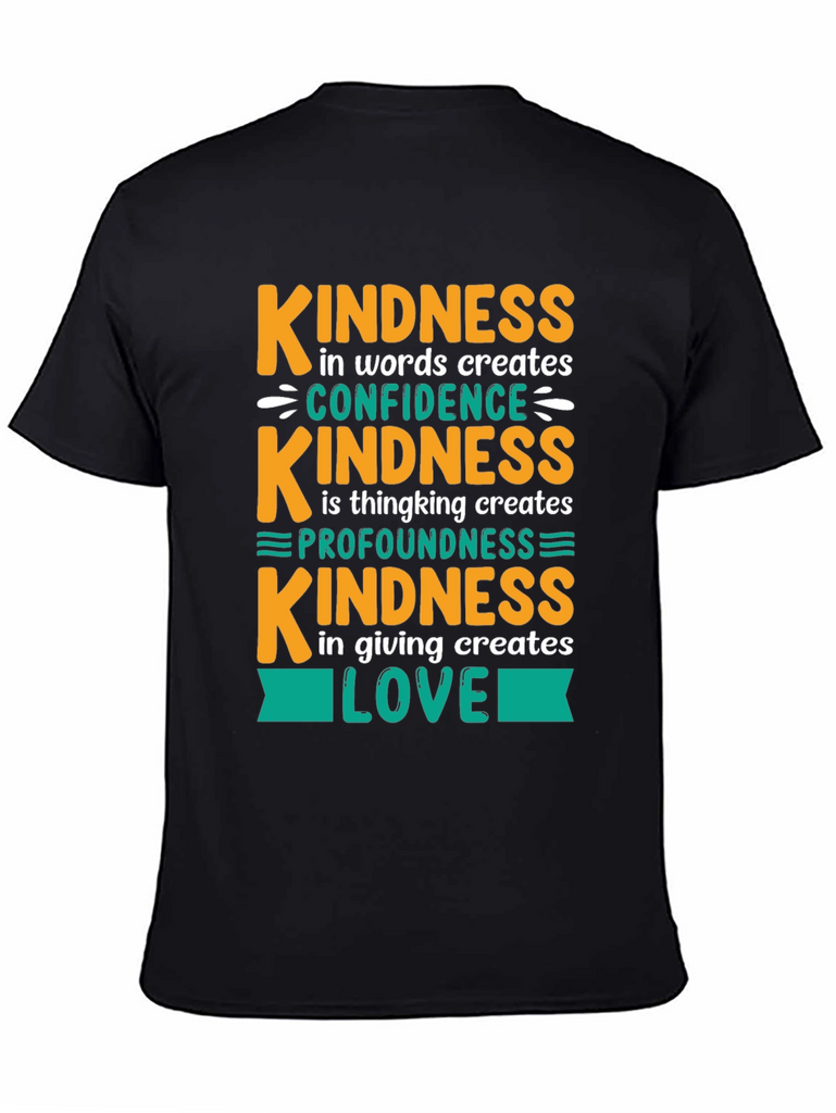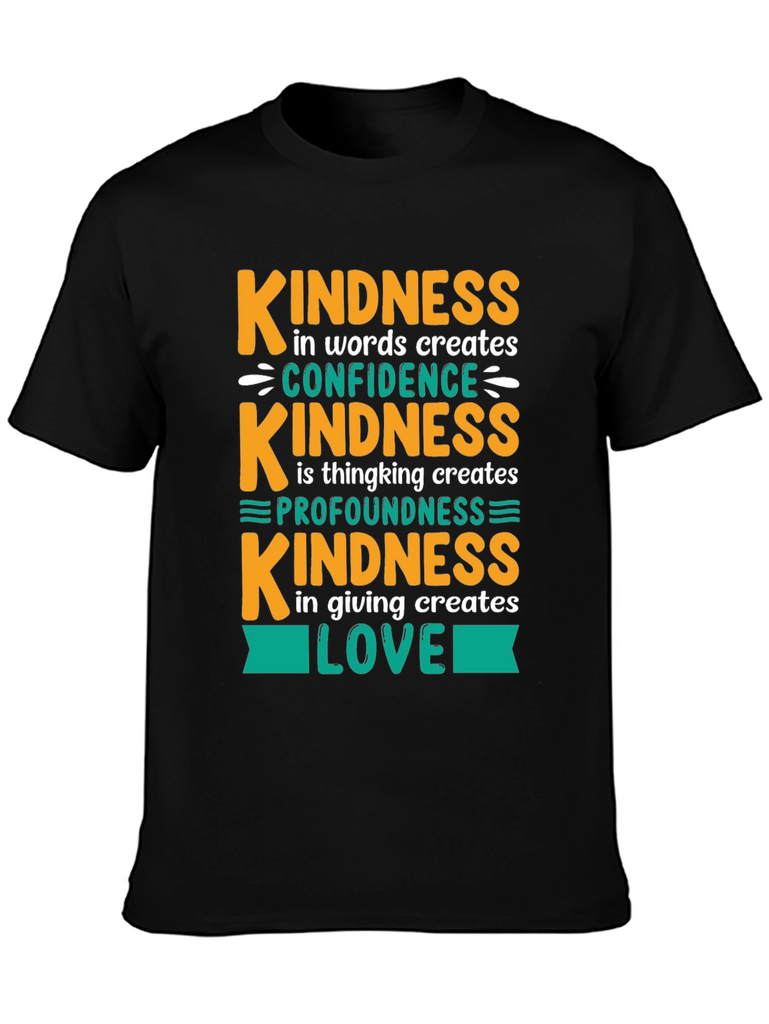 Show the power of kindness with this unique t-shirt! This black tee features a striking design with the word "KINDNESS" emphasized three times, each followed by a different inspiring phrase. The phrases, "in words creates CONFIDENCE", "is thinking creates PROFOUNDNESS", and "in giving creates LOVE" are arranged in a visually appealing stack. The word "KINDNESS" is a bold yellow-orange, contrasting nicely with the black shirt. The connecting phrases are in a teal-green color. Made from comfortable material, it's perfect for everyday wear. Spread positivity and make a statement with this kindness-inspired tee!