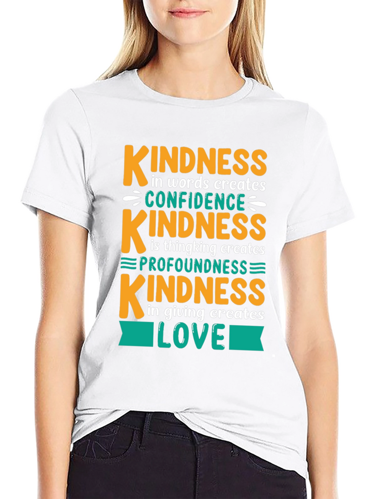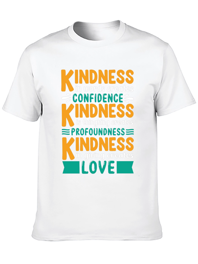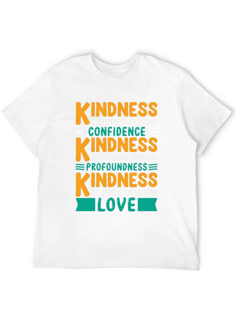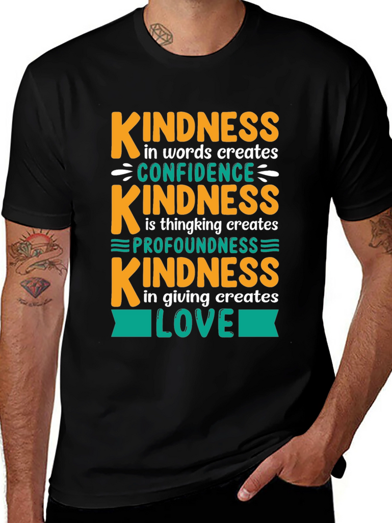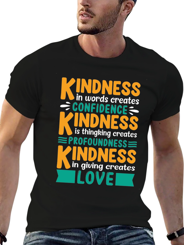 Show the power of kindness with this unique t-shirt! This black tee features a striking design with the word "KINDNESS" emphasized three times, each followed by a different inspiring phrase. The phrases, "in words creates CONFIDENCE", "is thinking creates PROFOUNDNESS", and "in giving creates LOVE" are arranged in a visually appealing stack. The word "KINDNESS" is a bold yellow-orange, contrasting nicely with the black shirt. The connecting phrases are in a teal-green color. Made from comfortable material, it's perfect for everyday wear. Spread positivity and make a statement with this kindness-inspired tee!
