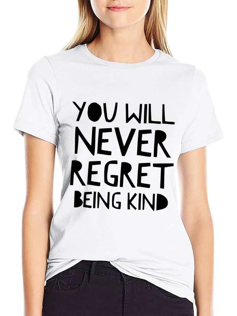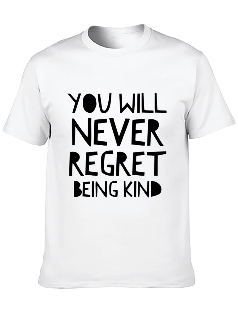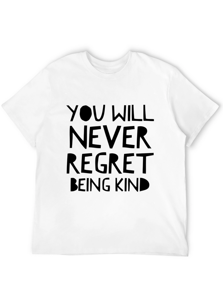 This black graphic tee features the powerful message: "You Will Never Regret Being Kind." The shirt's design is simple yet impactful, making it a versatile piece for everyday wear. The dark print contrasts nicely with the fabric, ensuring the message stands out. Made from a comfortable material, this tee is perfect for casual outings, social gatherings, or simply lounging at home. Wear this shirt as a reminder to spread kindness and positivity wherever you go. A great gift option for those who value compassion and making a difference.