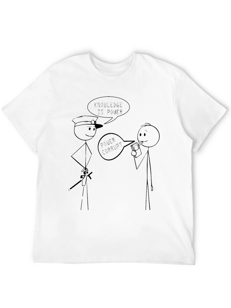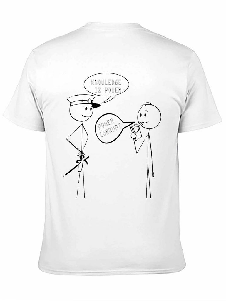 This black t-shirt features a unique graphic design. The graphic depicts a stick figure police officer saying "Knowledge is Power", and another stick figure drinking something from a flask and replying "Power Corrupt". The shirt appears to be made of a soft, comfortable material, perfect for casual wear. Show off your unique style with this tee, ideal for making a statement or sparking conversation. Its classic fit makes it versatile for everyday outings.