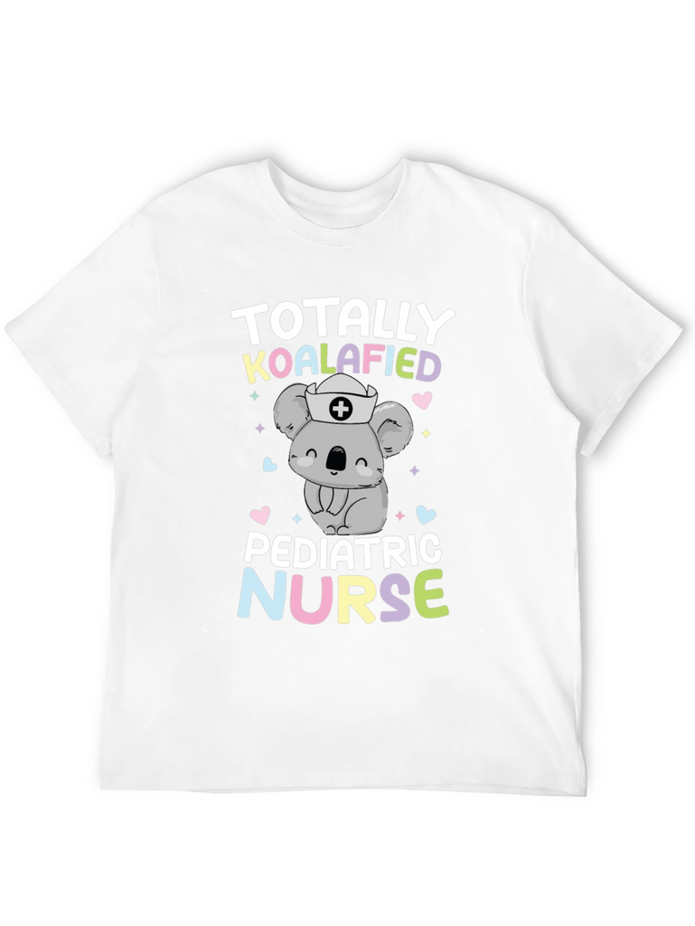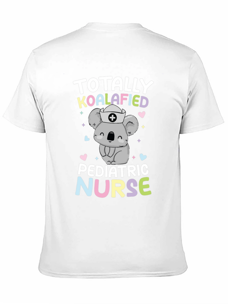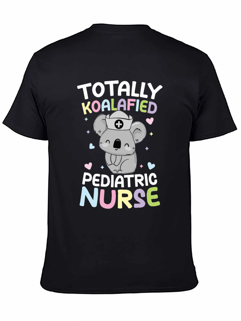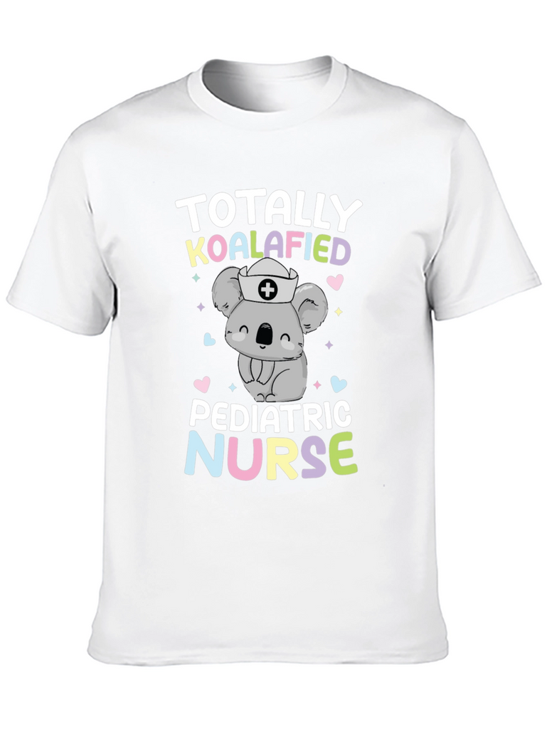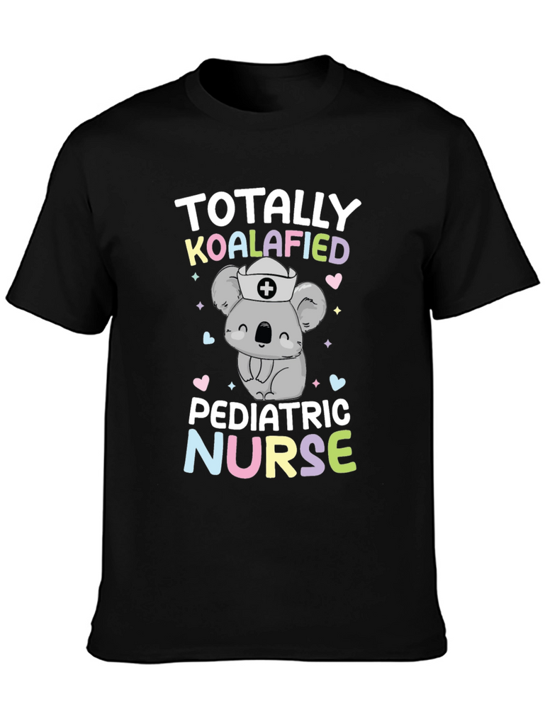 Show off your love for pediatric nursing with this adorable and humorous t-shirt! Made from what appears to be a soft, breathable cotton blend, this black tee features a cute, cartoon koala wearing a nurse's cap. The playful text "TOTALLY KOALIFIED PEDIATRIC NURSE" is displayed in a vibrant, multi-colored font, making it a fun and eye-catching design. Perfect for nurses, nursing students, or anyone who appreciates a bit of lighthearted medical humor. Wear it to work, school, casual outings, or any place you want to share your passion for caring for children. It is a great conversation starter and is sure to bring a smile to everyone's face!
