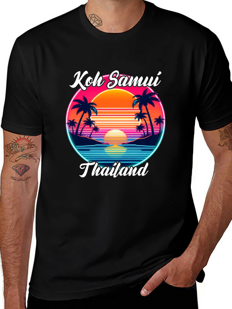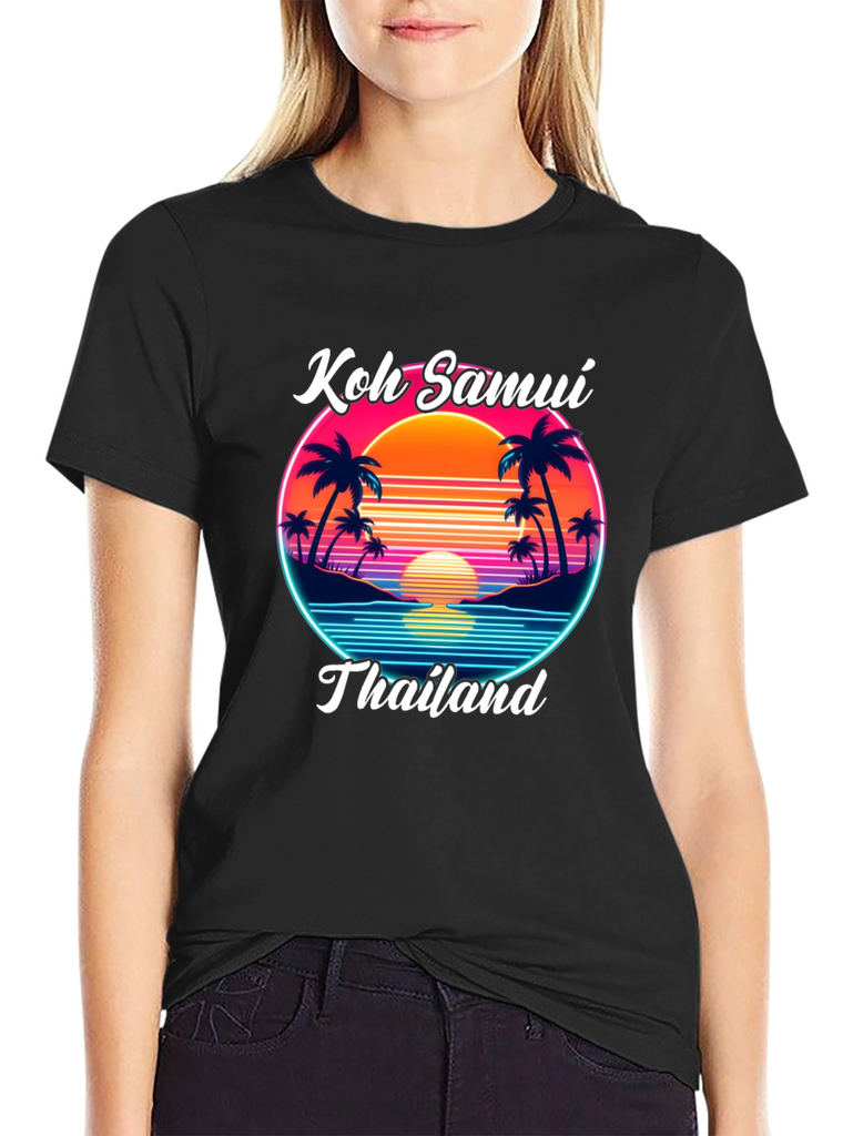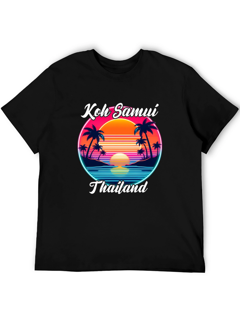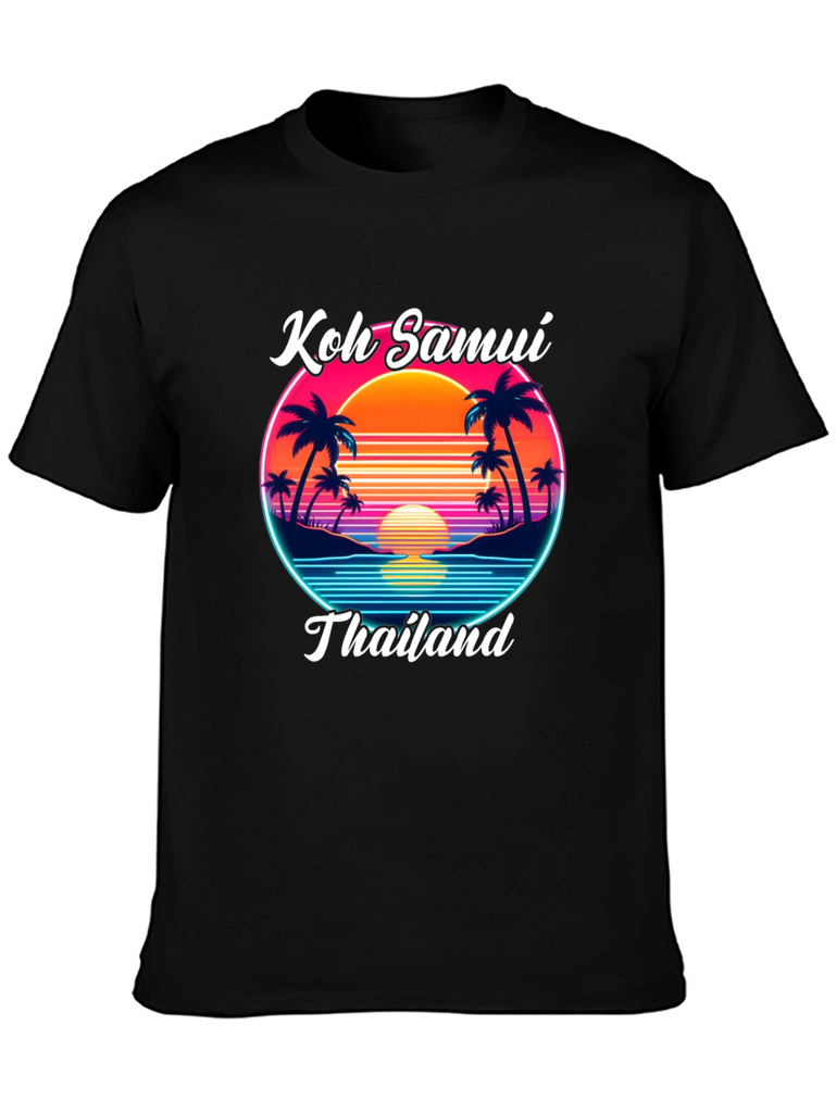 Embrace retro vibes with this black t-shirt featuring a vibrant Koh Samui, Thailand sunset graphic. The design showcases palm trees silhouetted against a sunset backdrop with the text "Koh Samui Thailand." Perfect for beach lovers, travelers, and anyone with a taste for vintage-inspired fashion. Made with comfortable fabric, this short-sleeved tee offers a relaxed fit for everyday wear. Wear it on your next vacation or as a casual statement piece. Add a touch of tropical nostalgia to your wardrobe with this eye-catching t-shirt.
