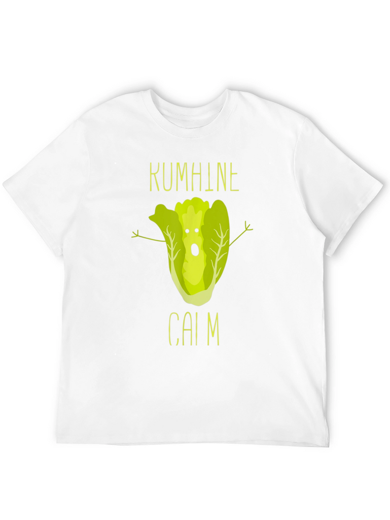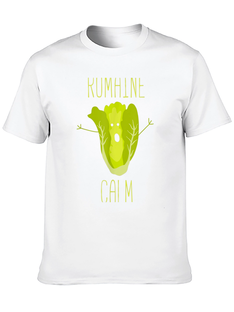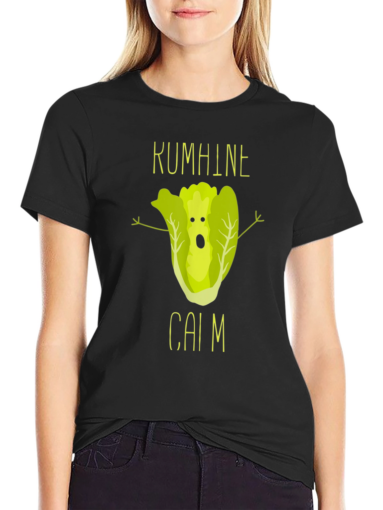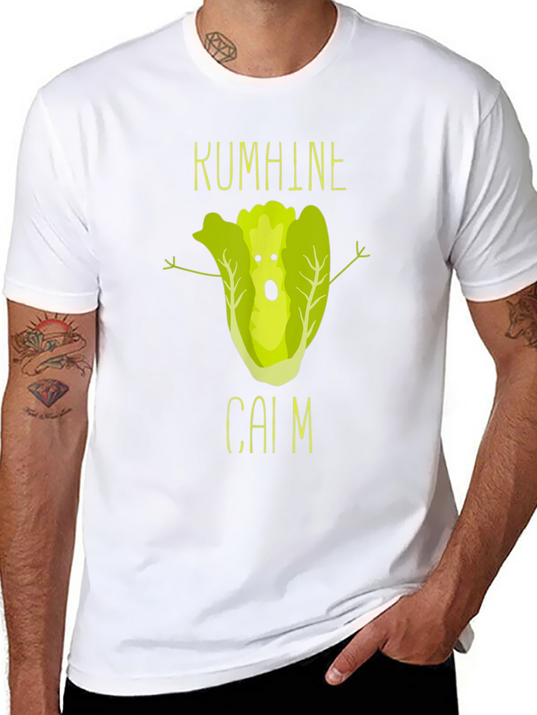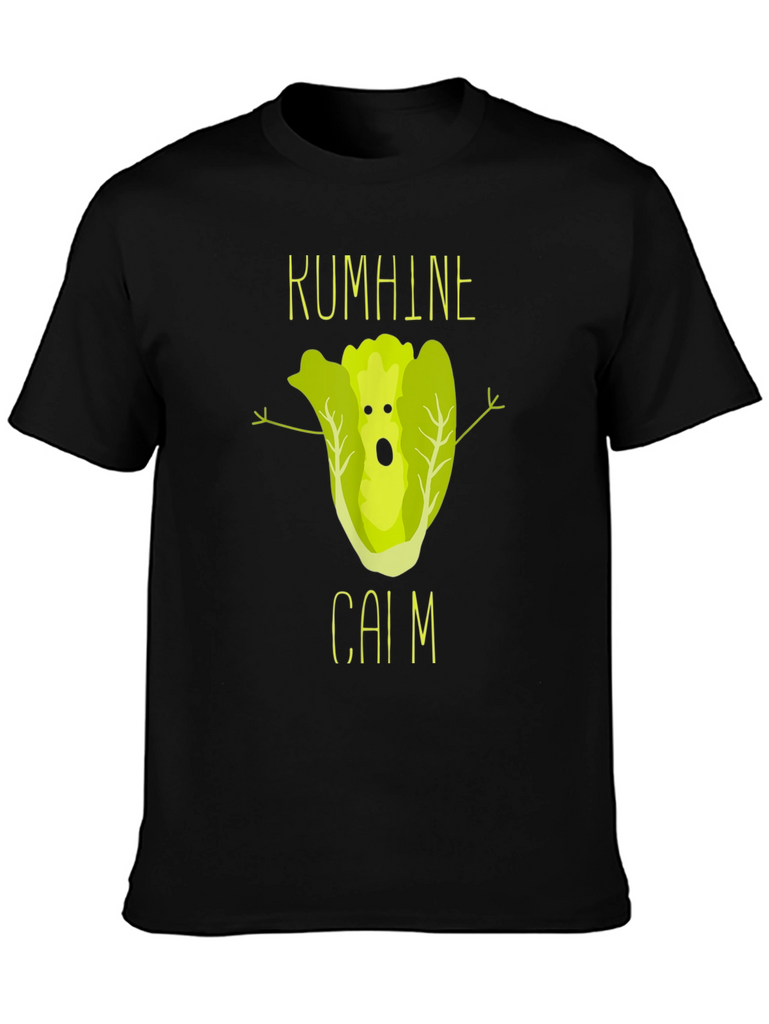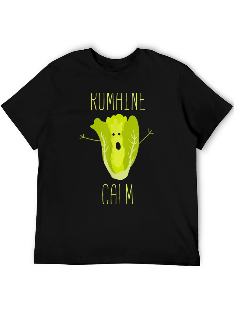 This black t-shirt features a unique and humorous graphic design. At the center, a cartoon lettuce character with a surprised expression and outstretched arms adds a playful touch. Above and below the lettuce are the words "KUMHINE" and "CAIM" in a matching font, enhancing the design's overall aesthetic. Made from comfortable fabric, this shirt is perfect for casual wear and expressing your sense of humor. The print quality looks sharp and vibrant. Ideal for those who love quirky and unique designs, this t-shirt is sure to be a conversation starter.