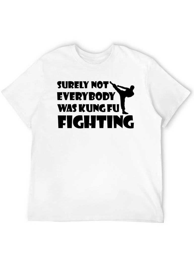 Make a statement with this black graphic t-shirt. The shirt features the phrase 'Surely Not Everybody Was Kung Fu Fighting' in bold lettering. A silhouette of a martial artist mid-kick is also incorporated in the design. This tee is perfect for casual wear, workouts, or making a statement. It's great for martial arts enthusiasts, or anyone who appreciates a touch of humor in their wardrobe. Made with a soft, comfortable fabric, this t-shirt is sure to become a wardrobe staple.