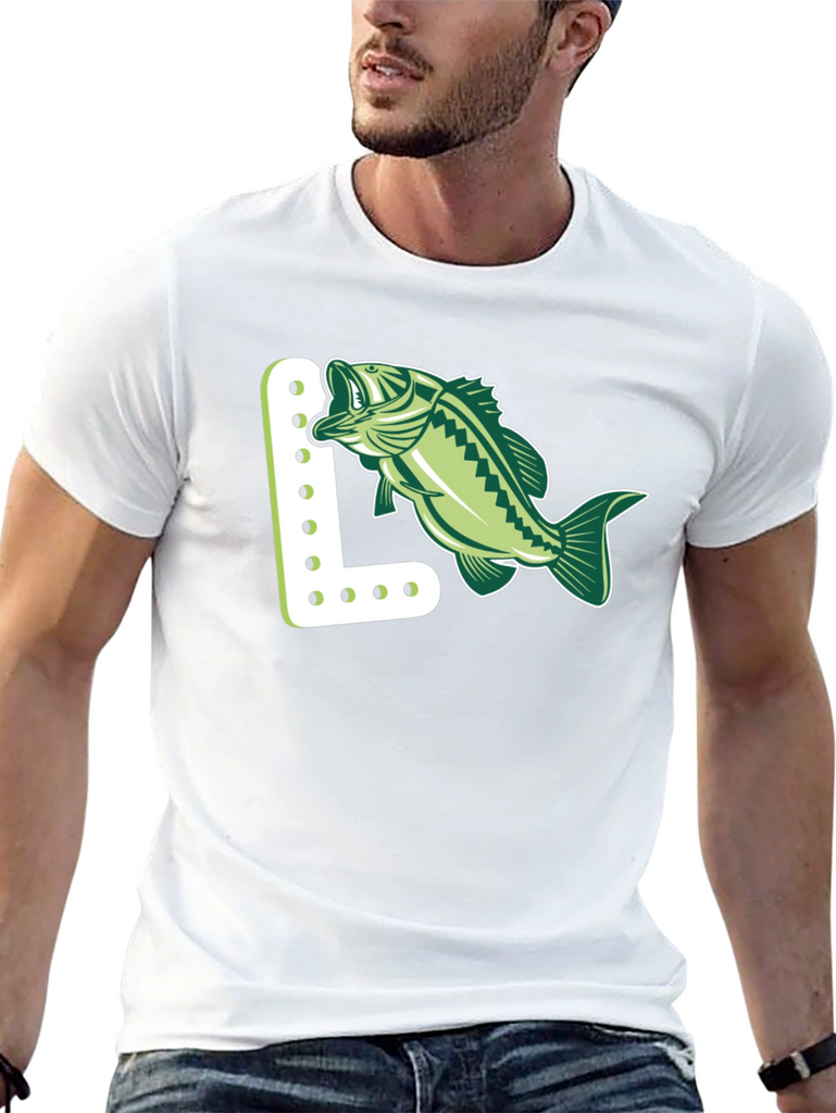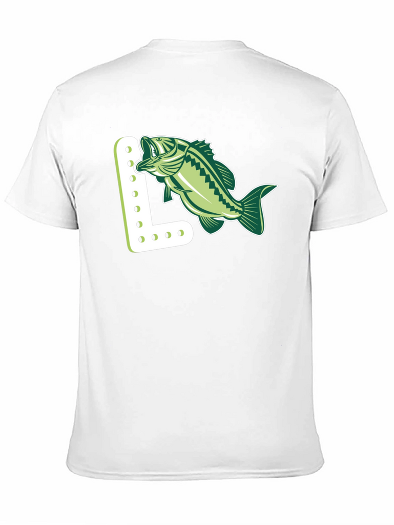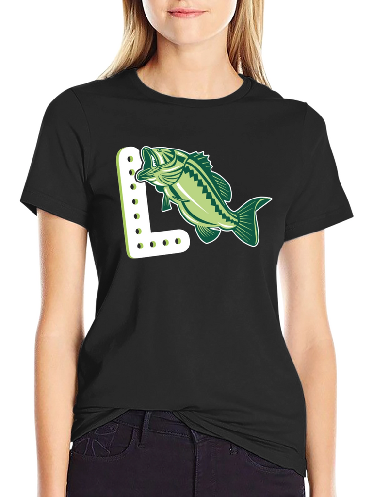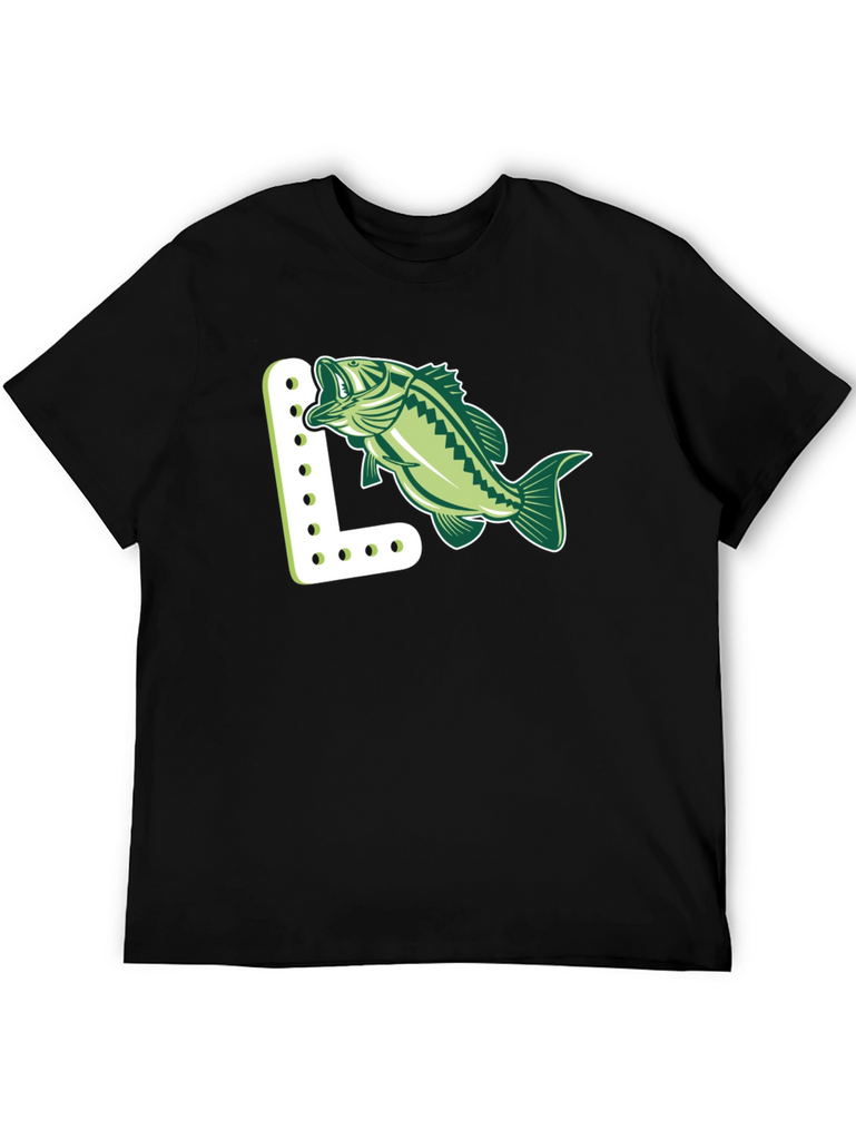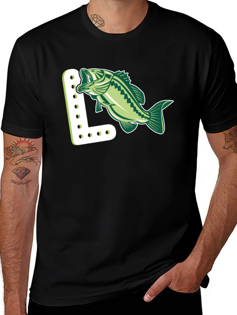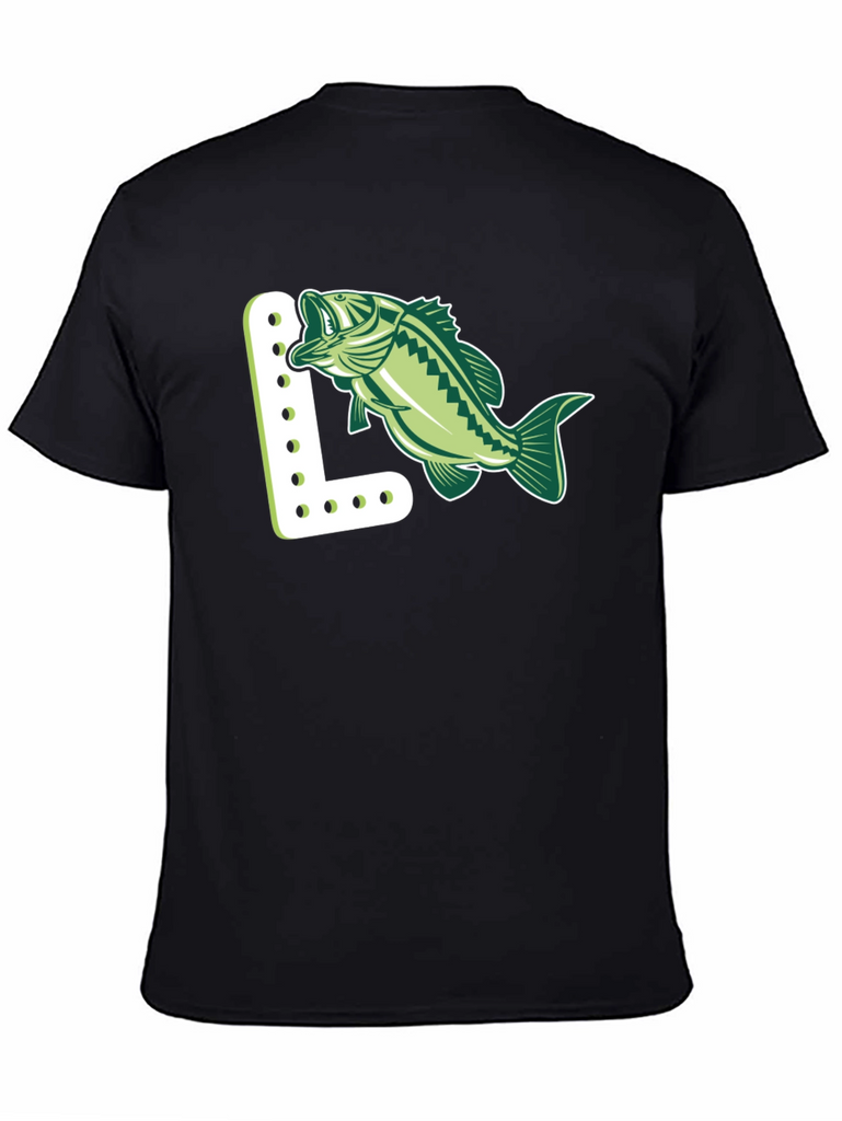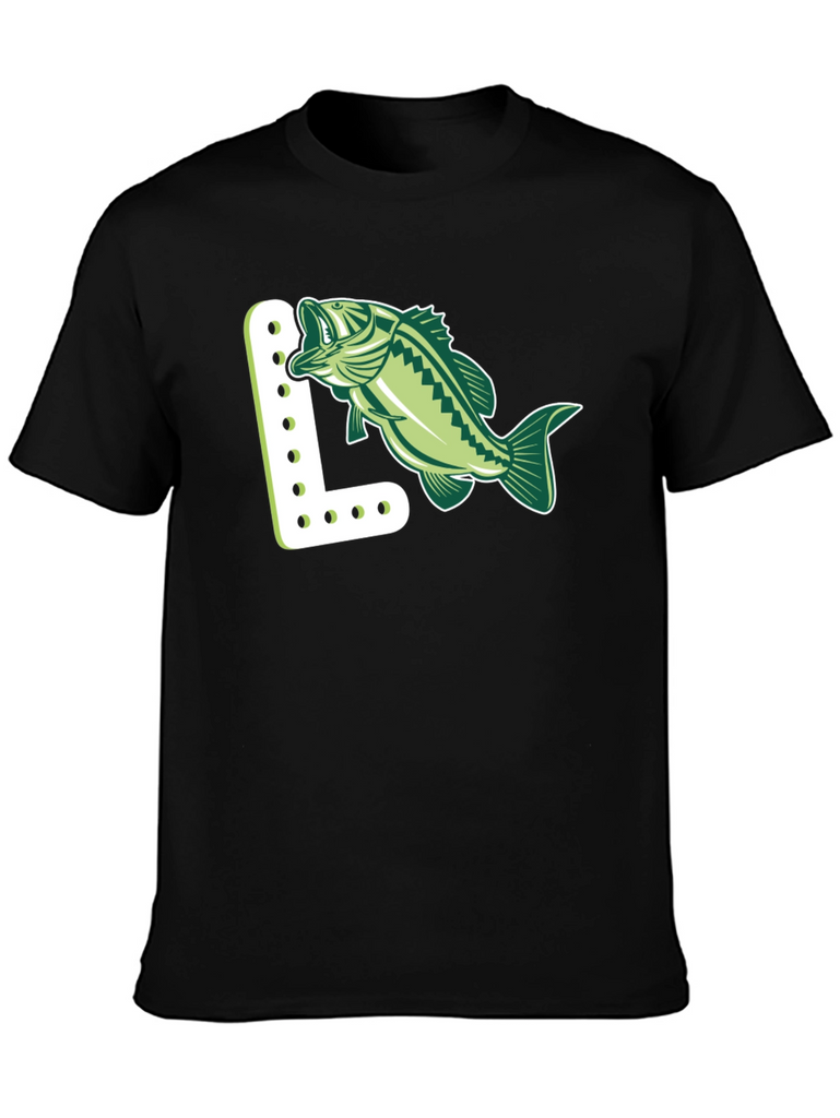 Show off your love for fishing with this unique t-shirt! This black tee features a bold design of a largemouth bass paired with the letter "L." The graphic is rendered in shades of green and white, creating a striking contrast against the dark background. Made from comfortable materials, this shirt is perfect for everyday wear, fishing trips, or casual outings. Makes a great gift for anglers and outdoor enthusiasts! Get yours today and reel in the compliments.