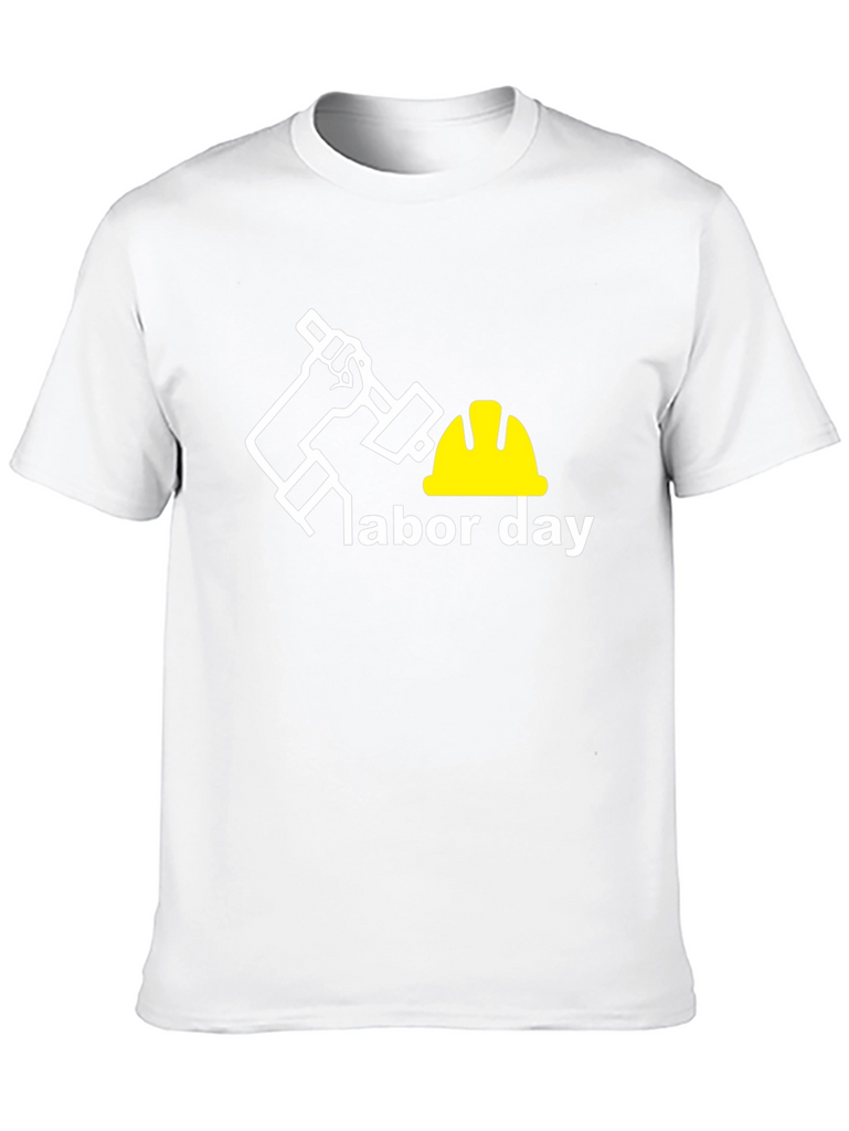 Celebrate Labor Day with this stylish black t-shirt. The design features a graphic of a hand holding a hammer alongside a yellow hard hat, symbolizing the hard work and dedication of laborers. The text 'labor day' is placed prominently under the graphic. Made from a comfortable-looking fabric, this tee is perfect for casual wear, holiday gatherings, or showing your support for the labor movement. A great addition to any wardrobe, it blends comfort with a meaningful message. Show your appreciation with this unique graphic tee.