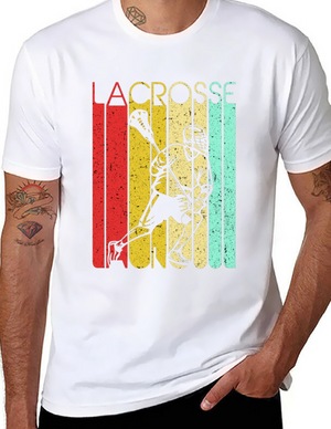 Show off your love for lacrosse and American pride with this unique graphic t-shirt. This eye-catching tee features a bold silhouette of a lacrosse player overlaid on a distressed American flag design. The vibrant red, white, and blue stripes combined with the dynamic lacrosse graphic make a powerful statement. Perfect for lacrosse players, coaches, fans, or anyone who wants to express their patriotic spirit. Wear it to games, practices, casual outings, or any occasion where you want to stand out with style and support. A great addition to your wardrobe!