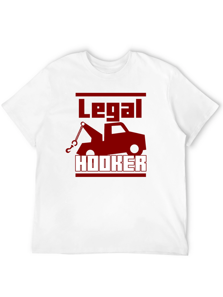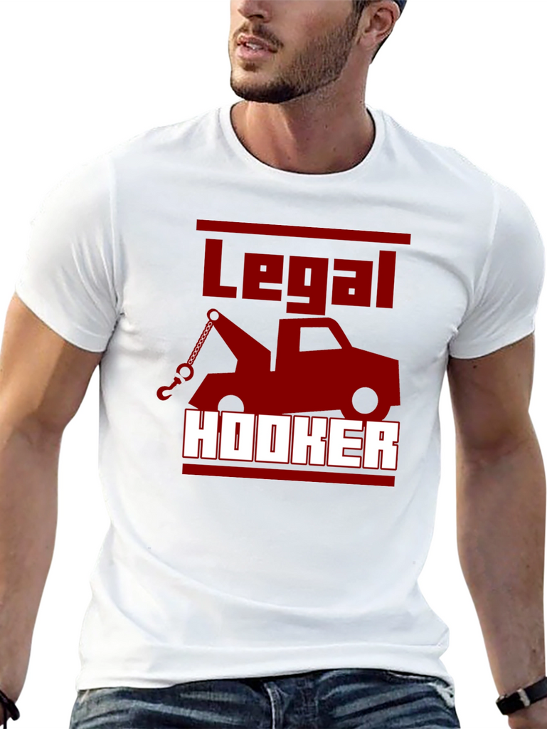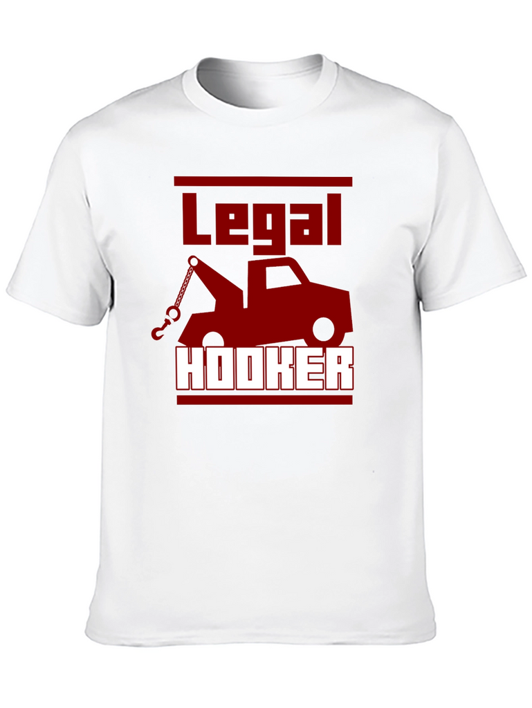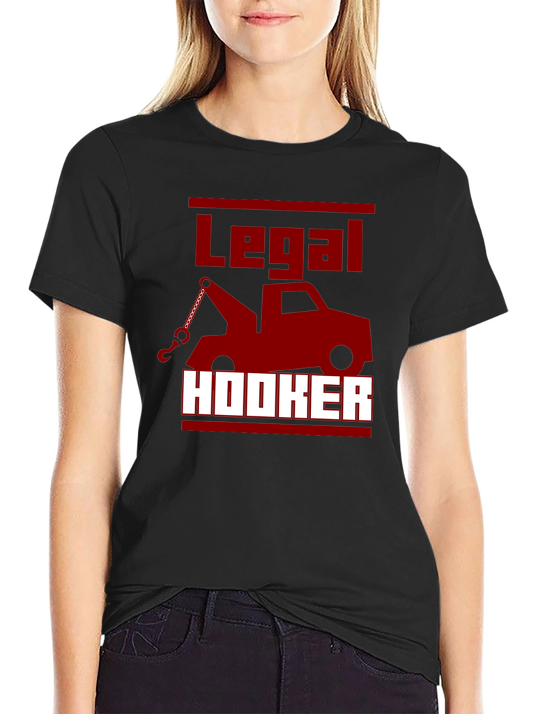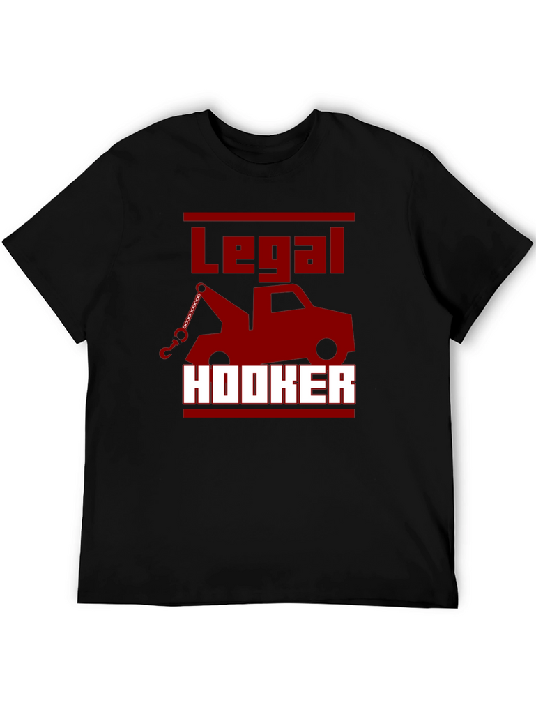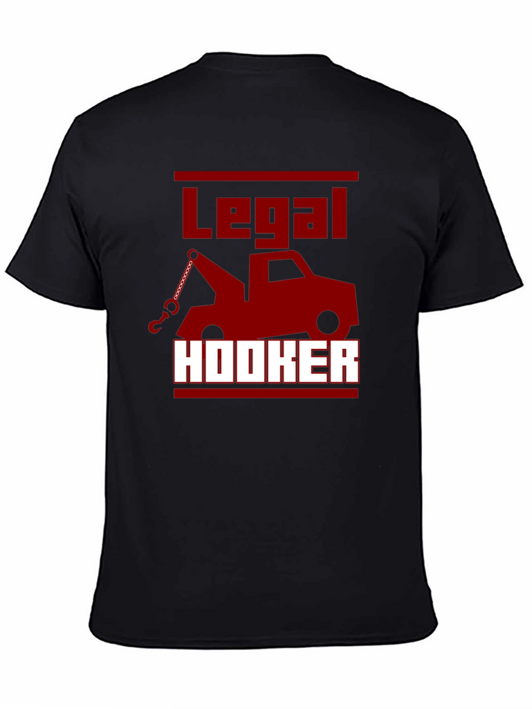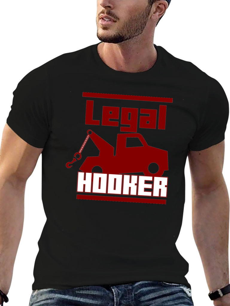 Show off your profession with this eye-catching t-shirt. This black tee features a bold graphic design in red, with the text "Legal" above an image of a tow truck, and "Hooker" below. The shirt is perfect for tow truck drivers or anyone who wants to make a statement. Made from comfortable materials, this shirt is ideal for everyday wear. It’s sure to grab attention and spark conversation wherever you go. Order yours today!