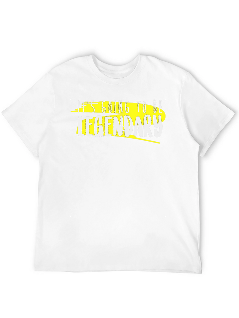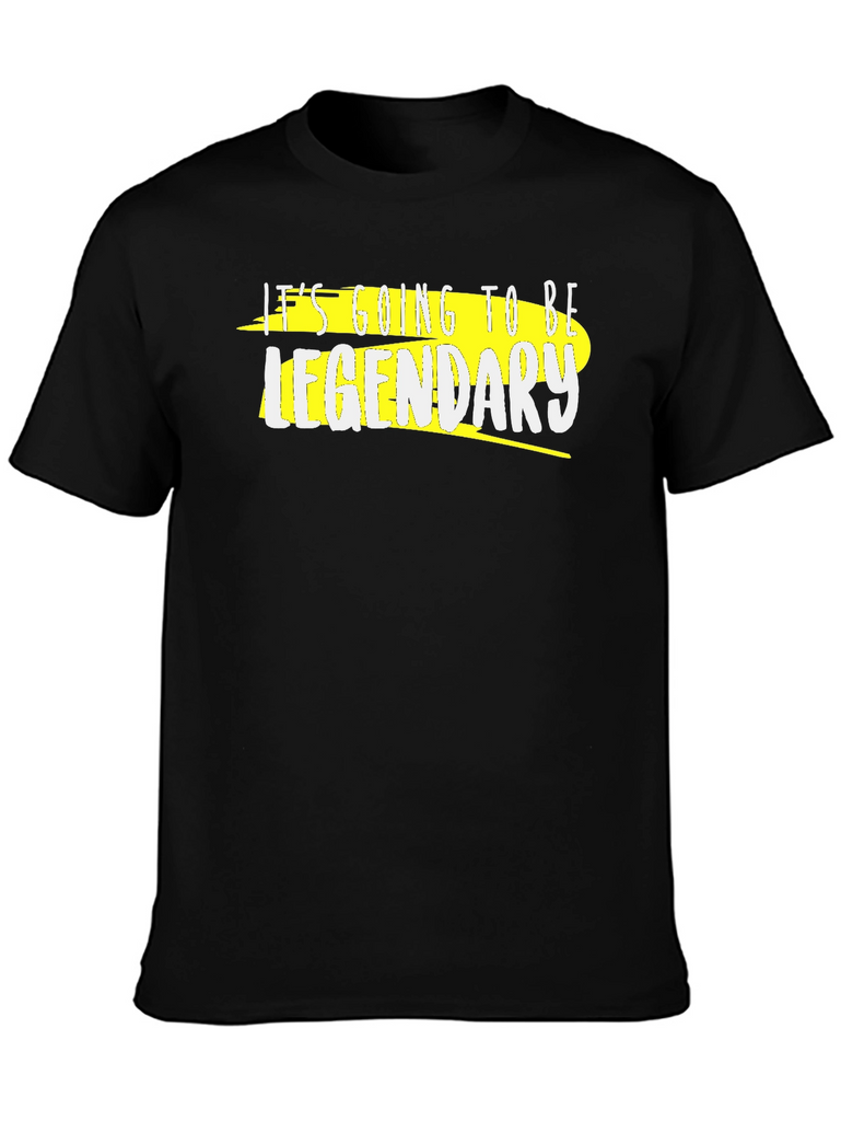 This black tee features a bold graphic print. The design includes the phrase "It's Going To Be Legendary" in stylized white lettering, underlined by a yellow streak for added visual impact. The shirt appears to be made from a soft, comfortable cotton blend, perfect for everyday wear. Its classic crew neck and short sleeves provide a relaxed fit. Ideal for casual outings, social gatherings, or simply expressing your confident attitude. Stand out from the crowd with this trendy and motivational graphic tee. A must-have addition to your wardrobe. Express yourself with this unique piece.