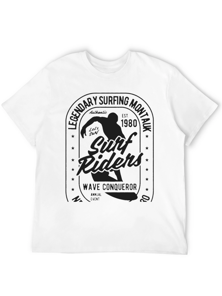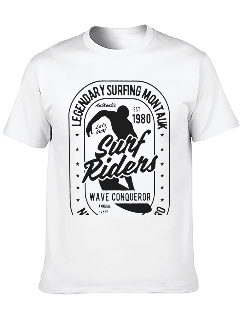 Ride the wave of style with this black t-shirt featuring a 'Legendary Surfing Montauk' design. The shirt showcases a vintage-inspired graphic with a surfer silhouette and the words 'Surf Riders' emblazoned across the chest. 'Wave Conqueror' further enhances the adventurous theme. Crafted from comfortable, breathable fabric, this tee is perfect for casual wear, beach outings, or surfing adventures. It is a stylish way to express your love for the sport and the iconic Montauk surf scene. Make a statement with this unique and eye-catching design. The black color makes it a versatile addition to your wardrobe.