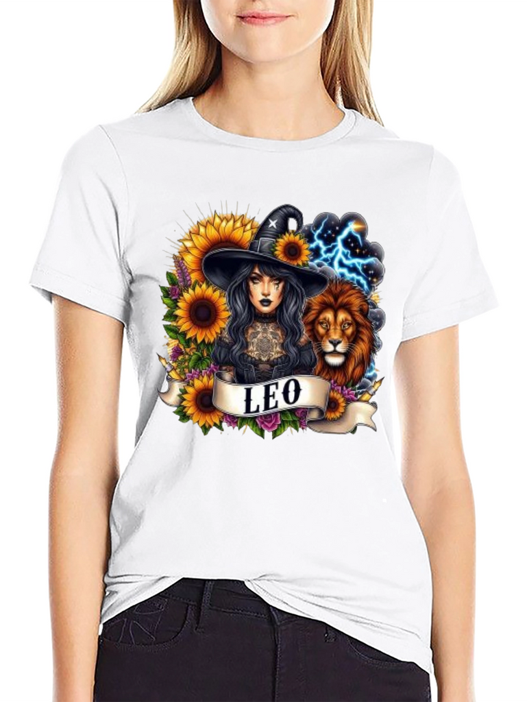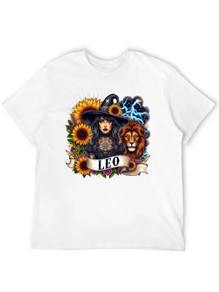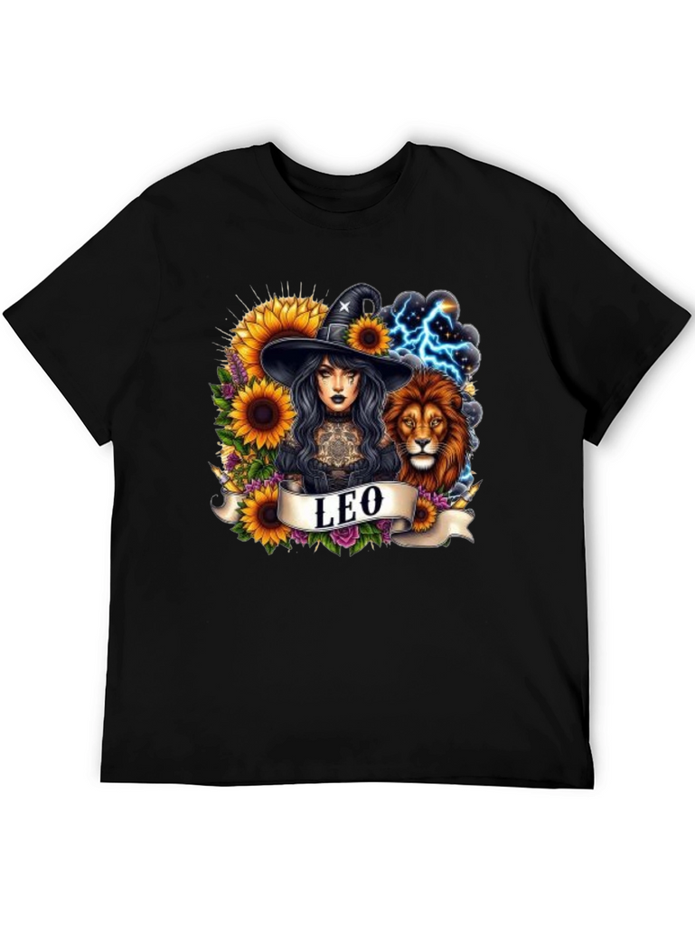 Show off your zodiac sign with this unique t-shirt! This black tee features a striking design with a witch wearing a hat, a majestic lion, sunflowers, and a banner with the text “Leo.” The vibrant graphics and bold design makes a great gift for any Leo. Perfect for everyday wear or a night out. Express your astrological pride in style! The design is printed on what appears to be a soft and comfortable black fabric. Available in multiple sizes.