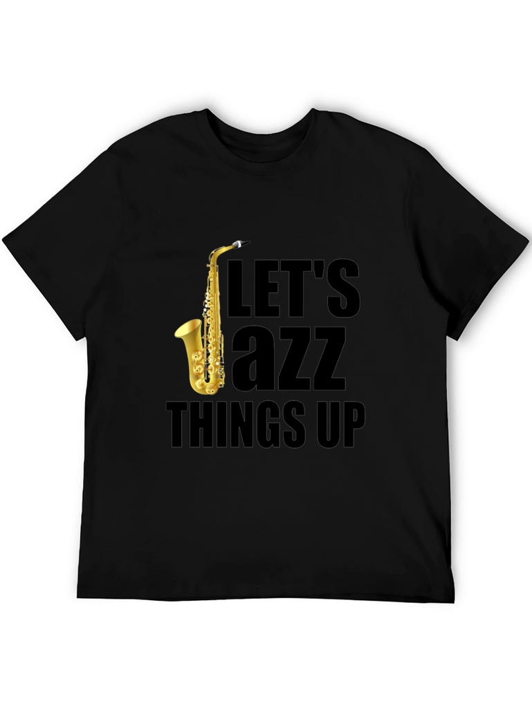This black t-shirt features a vibrant gold saxophone graphic paired with the playful phrase "Let's Jazz Things Up." The design is eye-catching and stylish, perfect for music lovers and those who appreciate a touch of humor in their wardrobe. Made from comfortable fabric, this tee is ideal for casual wear, music events, or as a unique gift for the jazz enthusiast in your life. It's a fun and fashionable way to express your personality and love for music.