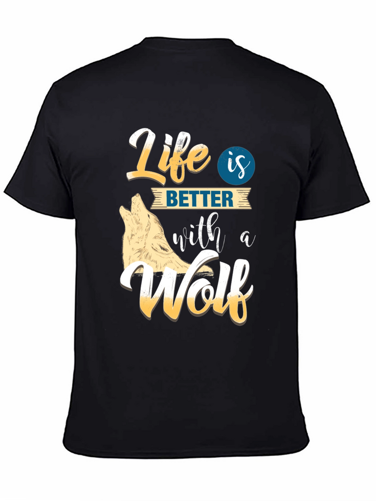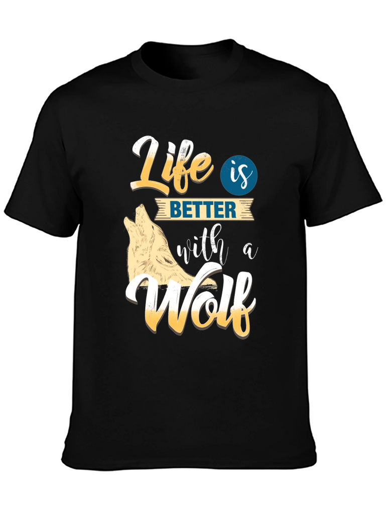 Show your love for wolves with this stylish and comfortable graphic t-shirt. The shirt features the phrase "Life is Better with a Wolf" in a decorative font, accompanied by an artistic wolf head graphic. Made from a soft, breathable fabric, this t-shirt is perfect for casual wear. Its classic black color makes it versatile to pair with jeans, shorts, or leggings. Express your wild side with this eye-catching tee. It’s a great conversation starter and a perfect gift for animal lovers and wolf enthusiasts. Wear it on hikes, casual outings, or while relaxing at home.