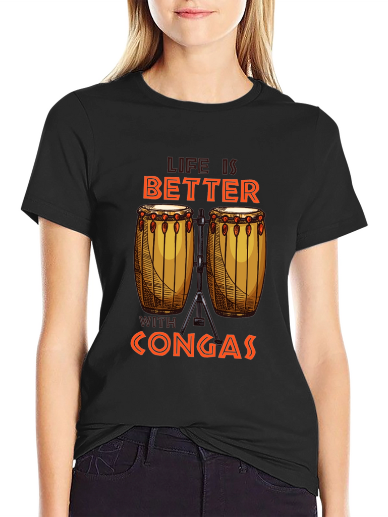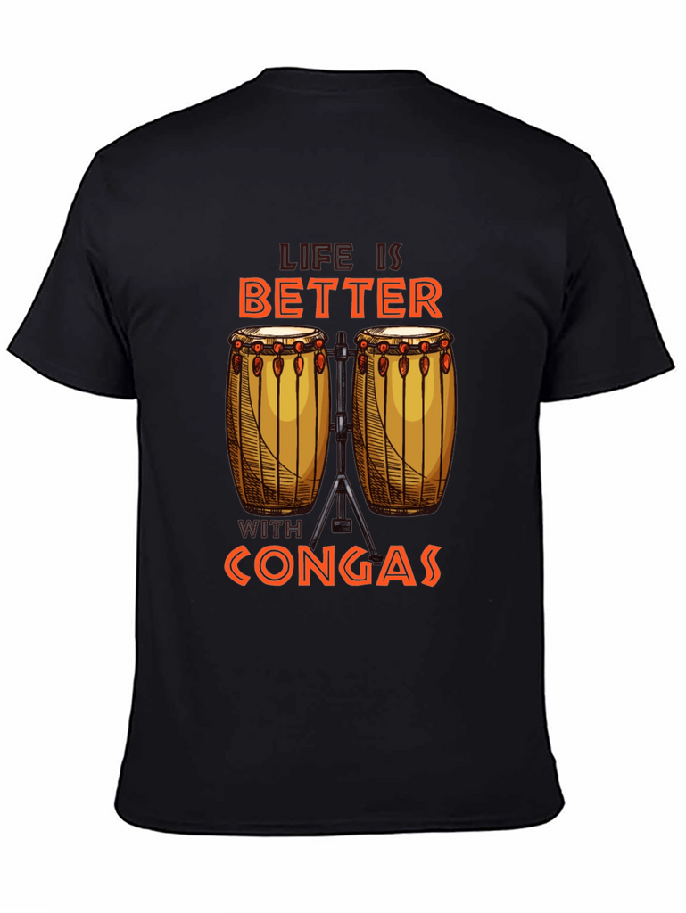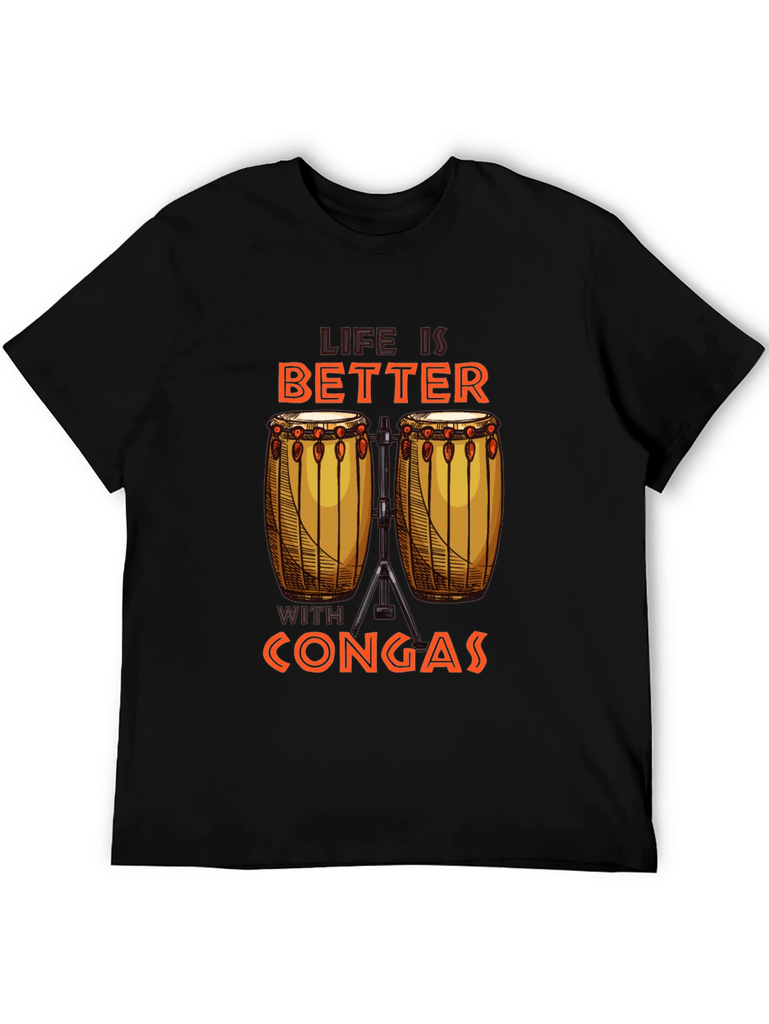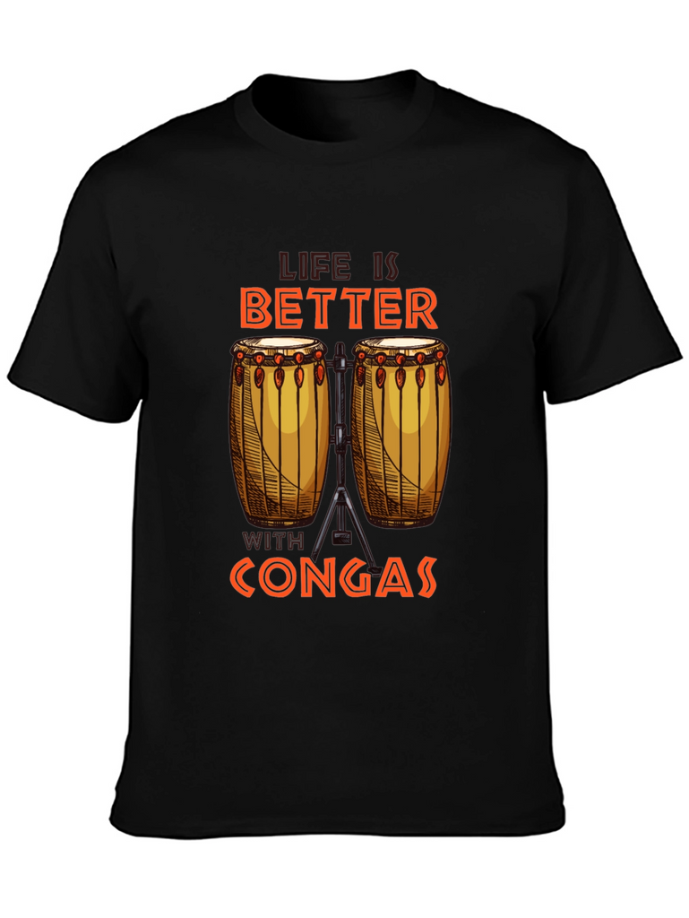 Showcase your love for music with this stylish black t-shirt. Featuring a vibrant graphic of conga drums and the phrase "Life is Better With Congas," this shirt is perfect for musicians, music enthusiasts, and anyone who appreciates a touch of rhythm in their life. Crafted from a comfortable fabric, this tee offers a relaxed fit that's ideal for everyday wear or casual gigs. The eye-catching design makes it a great conversation starter and a fun way to express your personality. Get ready to strike a chord with this unique and expressive t-shirt!