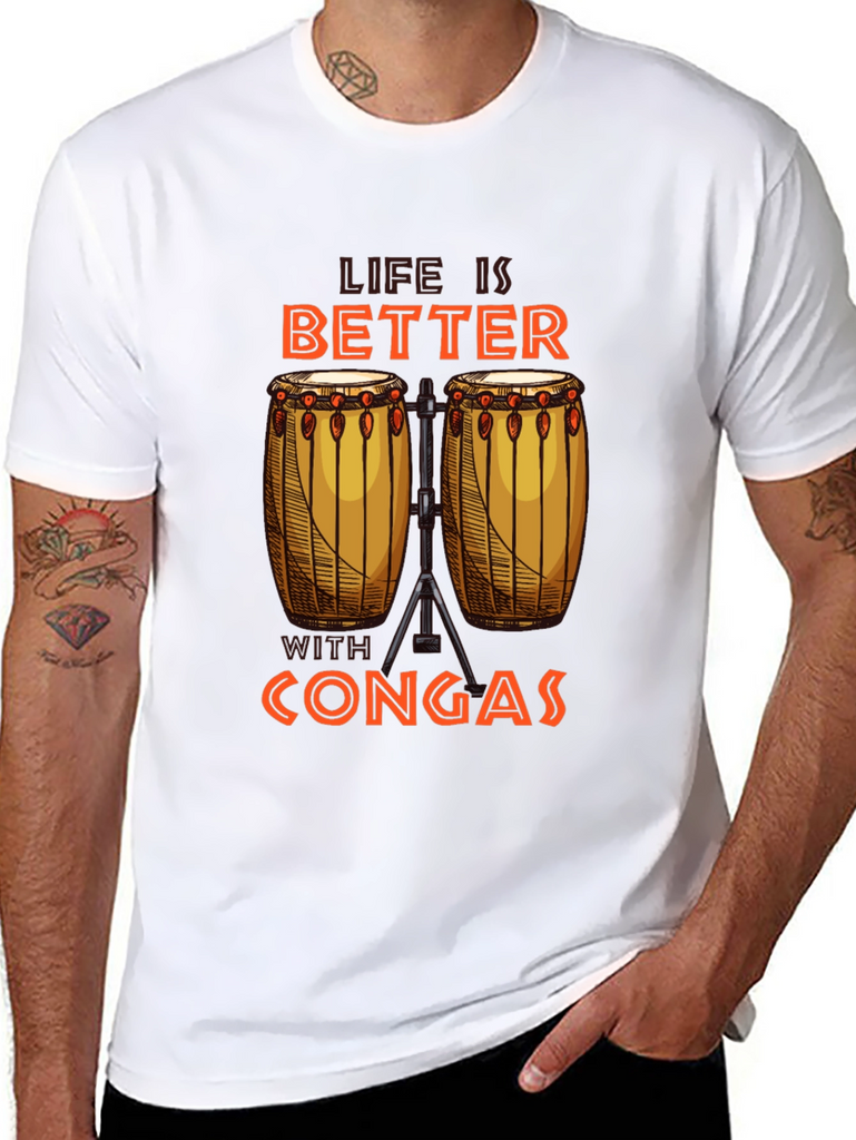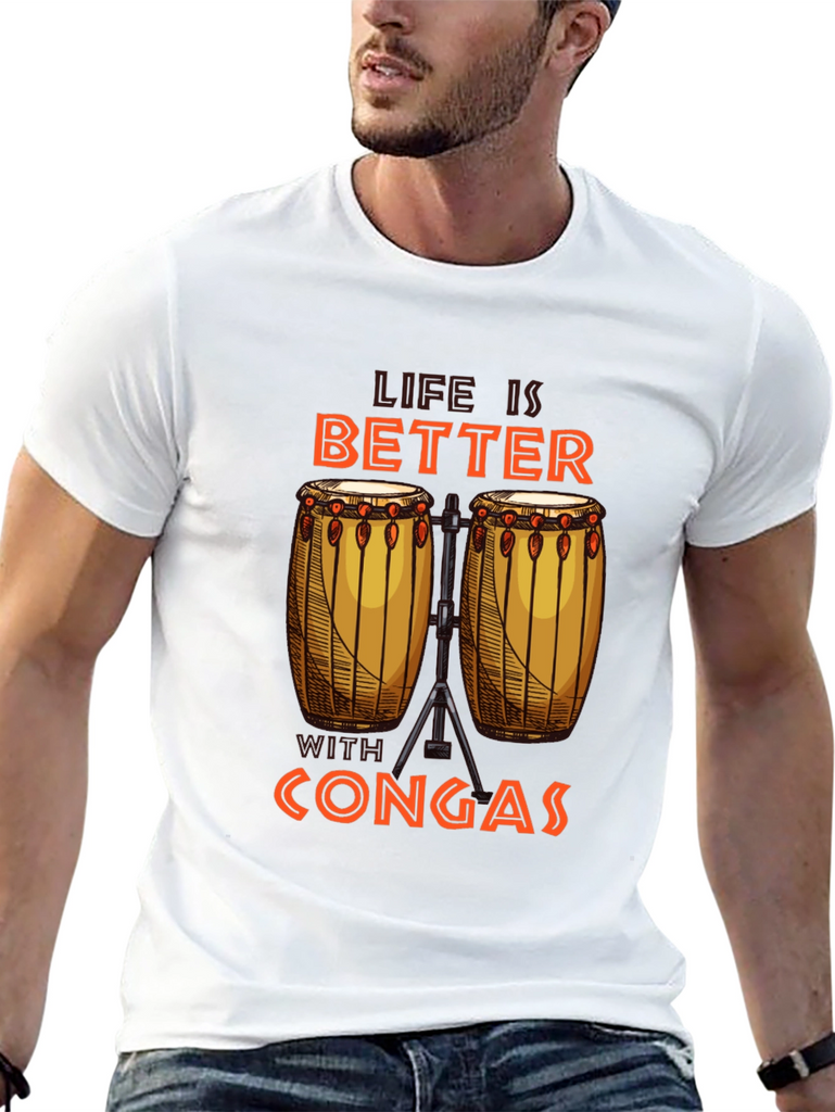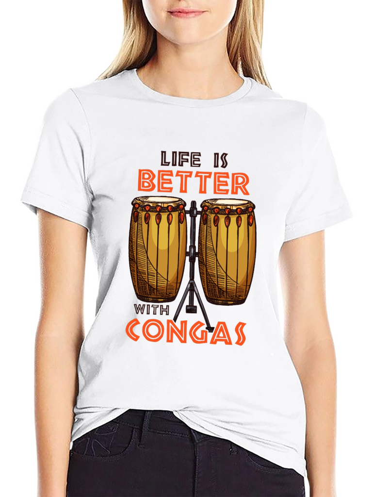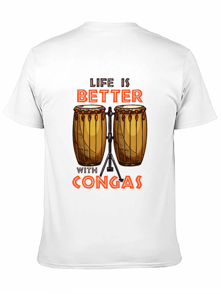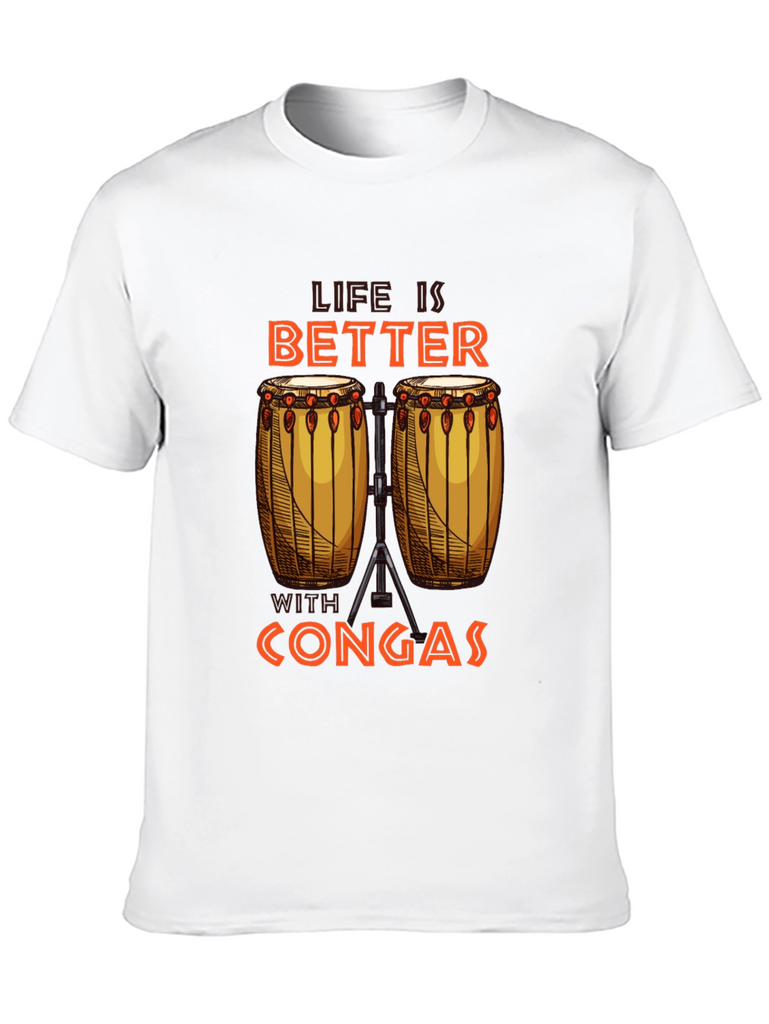 Showcase your love for music with this stylish black t-shirt. Featuring a vibrant graphic of conga drums and the phrase "Life is Better With Congas," this shirt is perfect for musicians, music enthusiasts, and anyone who appreciates a touch of rhythm in their life. Crafted from a comfortable fabric, this tee offers a relaxed fit that's ideal for everyday wear or casual gigs. The eye-catching design makes it a great conversation starter and a fun way to express your personality. Get ready to strike a chord with this unique and expressive t-shirt!