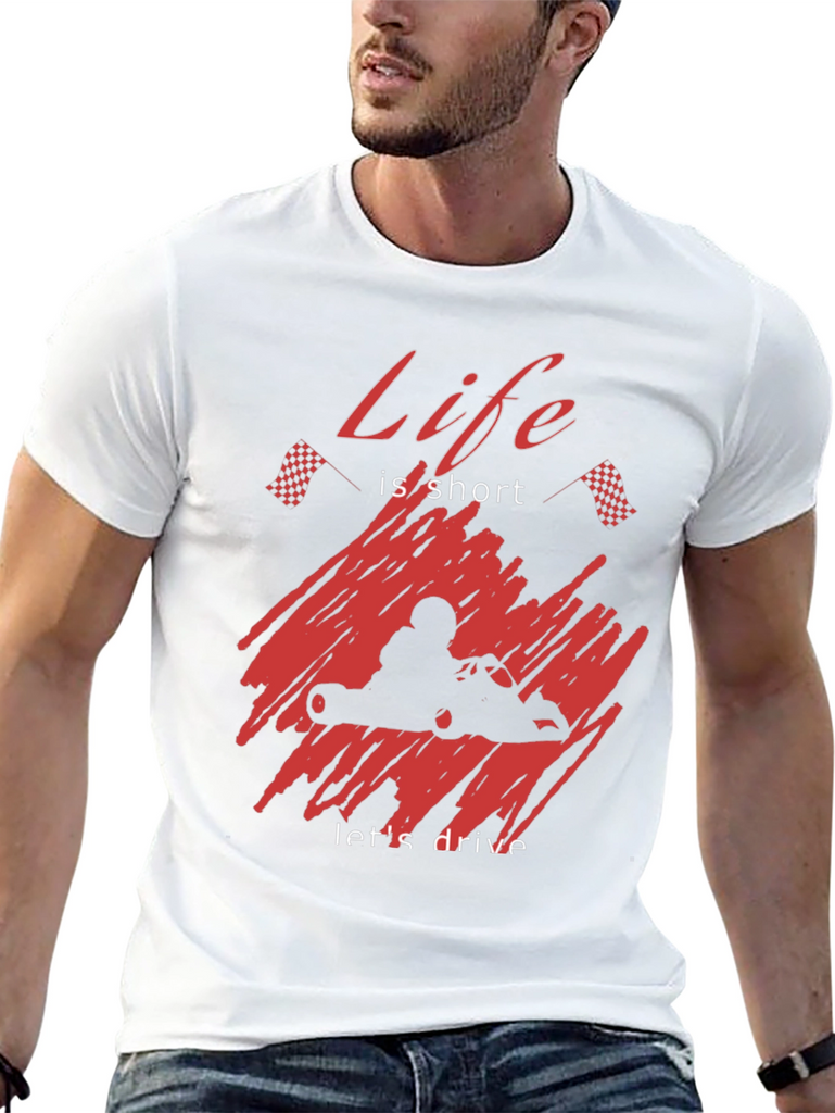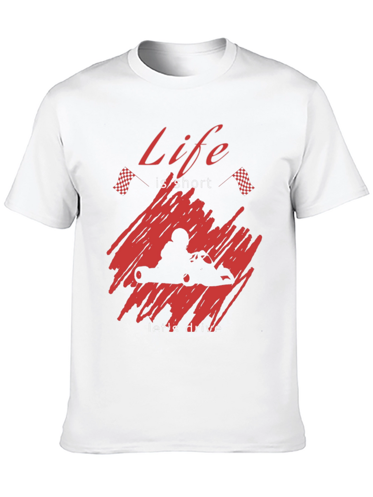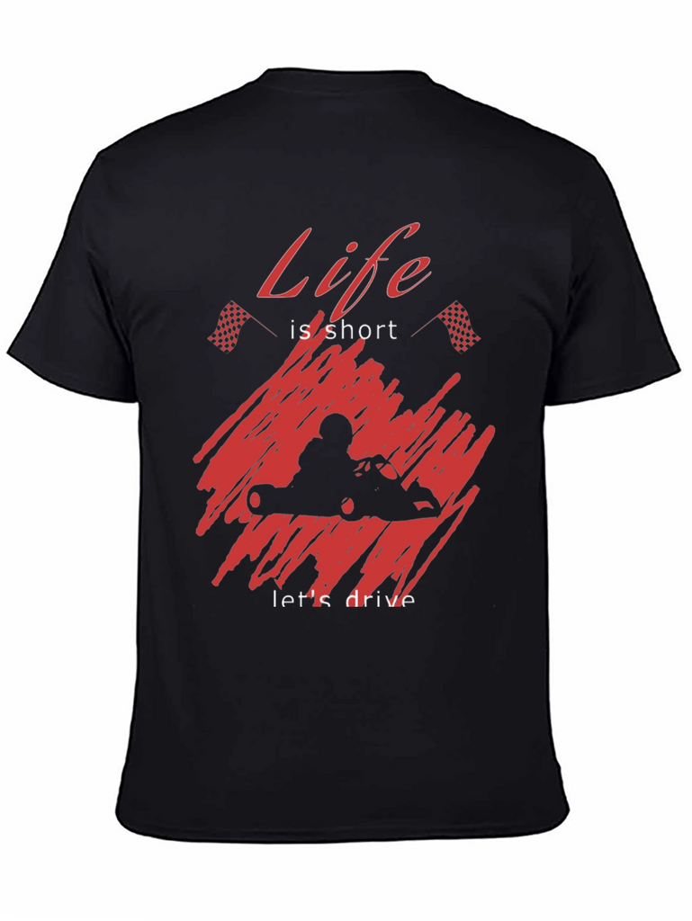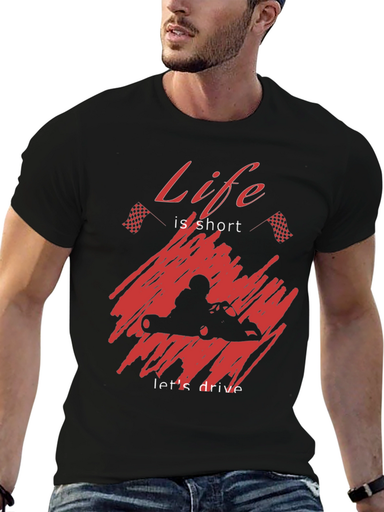 This stylish black t-shirt features a bold graphic design perfect for racing enthusiasts. The print showcases a go-kart silhouette overlaid on a striking red brushstroke background, accented with checkered flags. The phrase "Life is short, let's drive" adds a motivational touch. Made from comfortable fabric, this tee is ideal for casual wear, race days, or as a statement piece for anyone who loves the thrill of speed. It's a great way to express your passion for kart racing in a fashionable and unique way.
