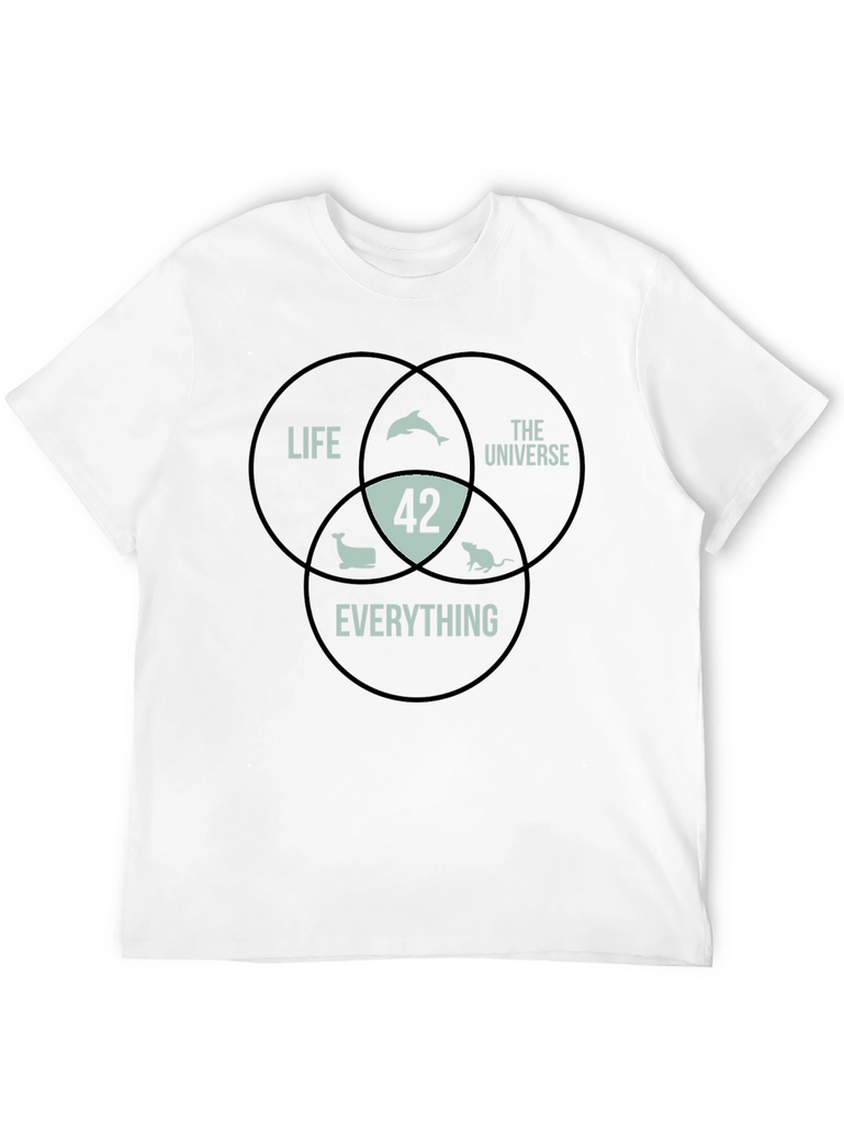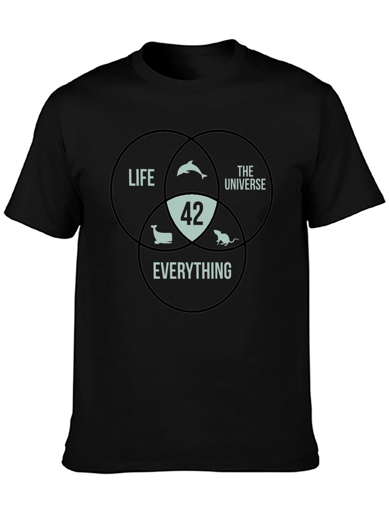This unique black t-shirt features a Venn diagram design with three intersecting circles labeled 'Life', 'The Universe', and 'Everything'. At the center of the diagram, where all three circles overlap, is the number '42'. The shirt is made from a comfortable-looking fabric and is ideal for fans of science fiction and humor. It's a great conversation starter and a stylish way to show off your geeky side. Wear it casually or dress it up for a unique look. Great gift idea for the geek in your life! This is a must-have for any fan.
