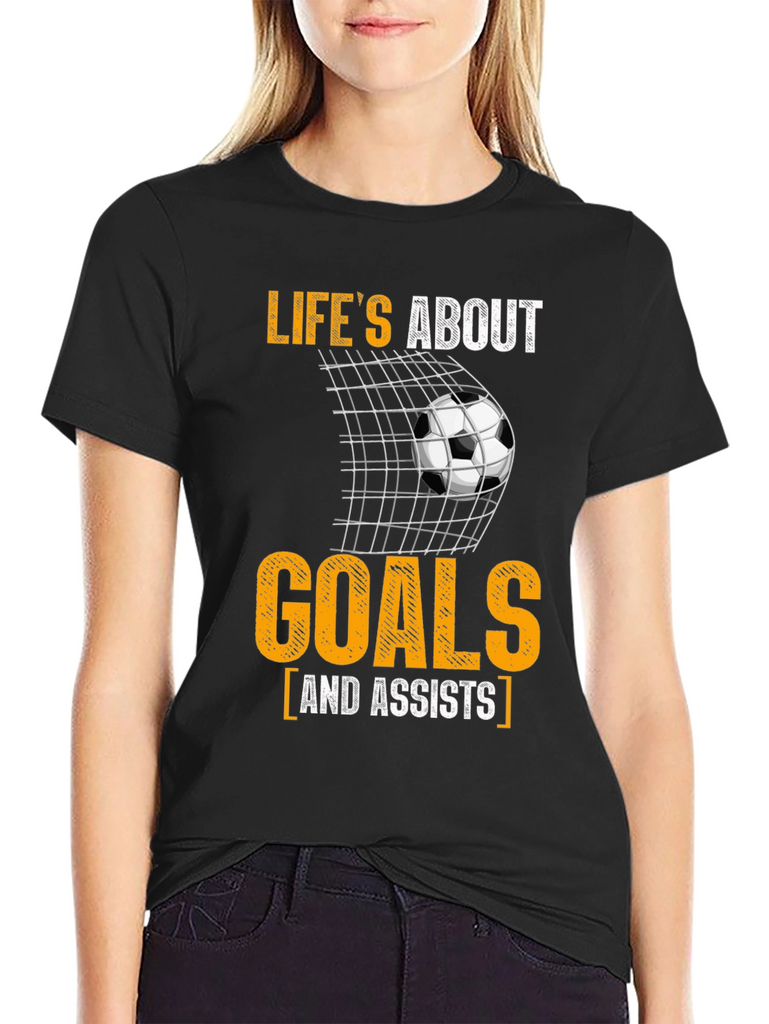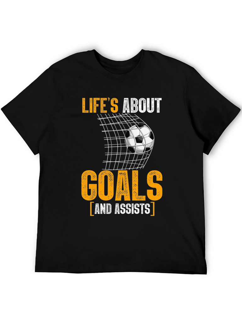 Score a goal with this unique t-shirt! This black tee features a bold graphic design with the phrase 'Life's About Goals & Assists', creatively displaying a soccer ball caught in a net. The graphic is primarily white and orange, providing a nice contrast against the dark fabric. Constructed from what appears to be a soft, comfortable cotton blend, this shirt is ideal for casual wear, sports practice, or showing your love for the game. Perfect for soccer players, fans, and anyone who appreciates a fun, motivational message. Get yours today and show the world what you're all about!