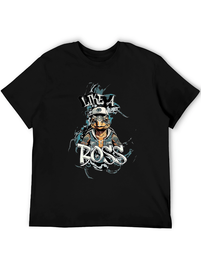 Show off your unique style with this bold black T-shirt featuring a cartoon turtle dressed as a 'Boss'. The cool design includes the words "Like a Boss" above the turtle image. Perfect for casual wear, this tee is a statement piece that adds a touch of humor and character to any outfit. Made with comfortable material for everyday wear.
