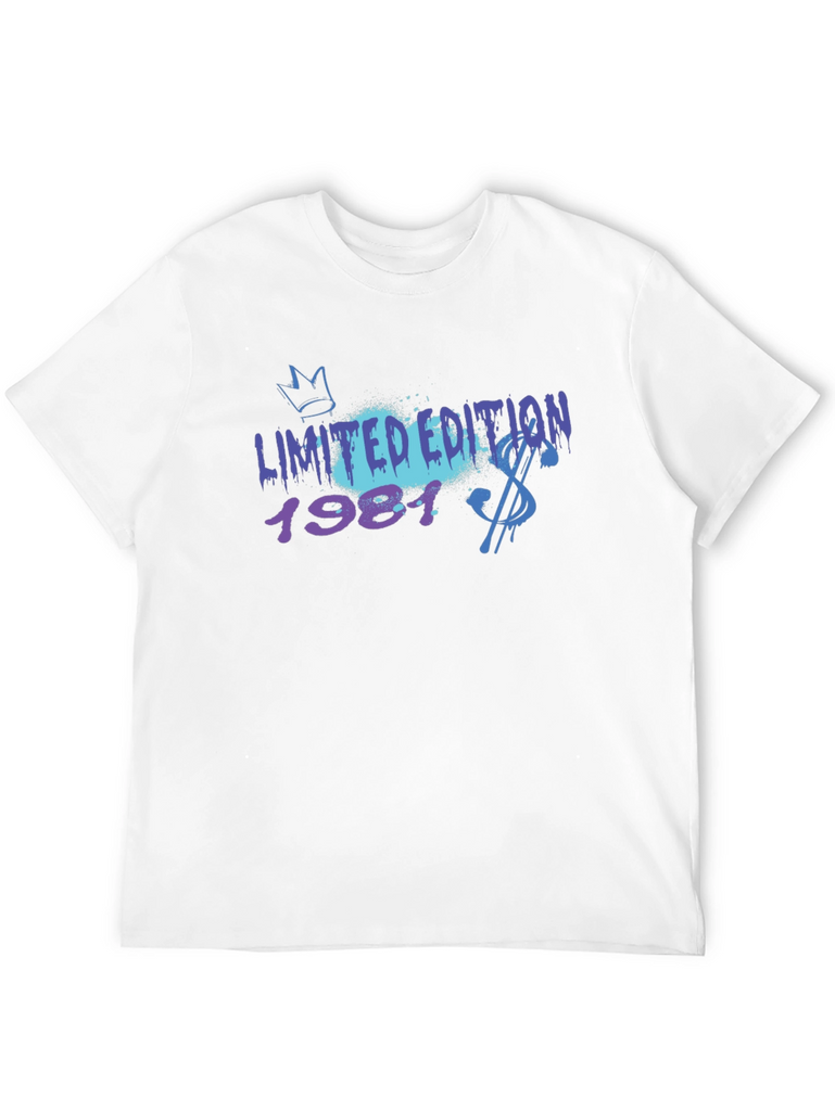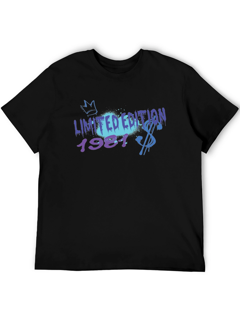 Rock a vintage vibe with this cool black t-shirt! The tee features a bold 'Limited Edition 1981' graphic with a graffiti-style design, incorporating a crown and a dollar sign. The print combines vibrant blue and purple hues for an eye-catching look. Made from comfortable material, this shirt offers a relaxed fit perfect for everyday wear. Show off your unique style and celebrate a special year with this trendy statement piece. Ideal for casual outings, concerts, or expressing your individuality.