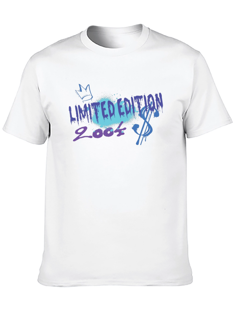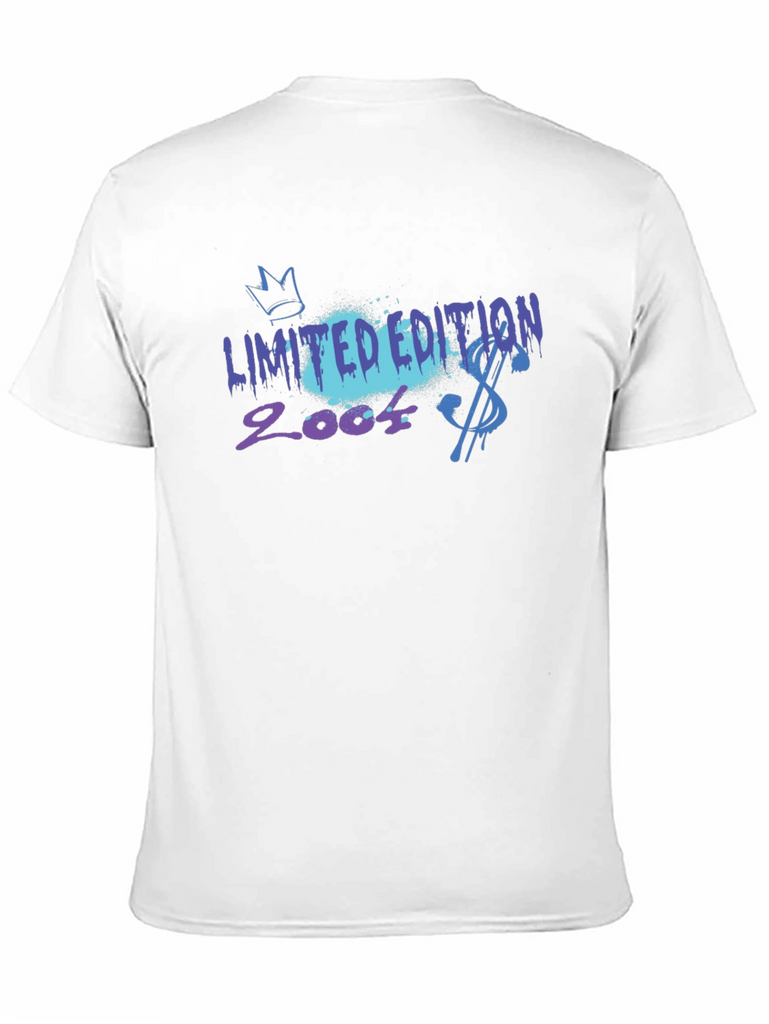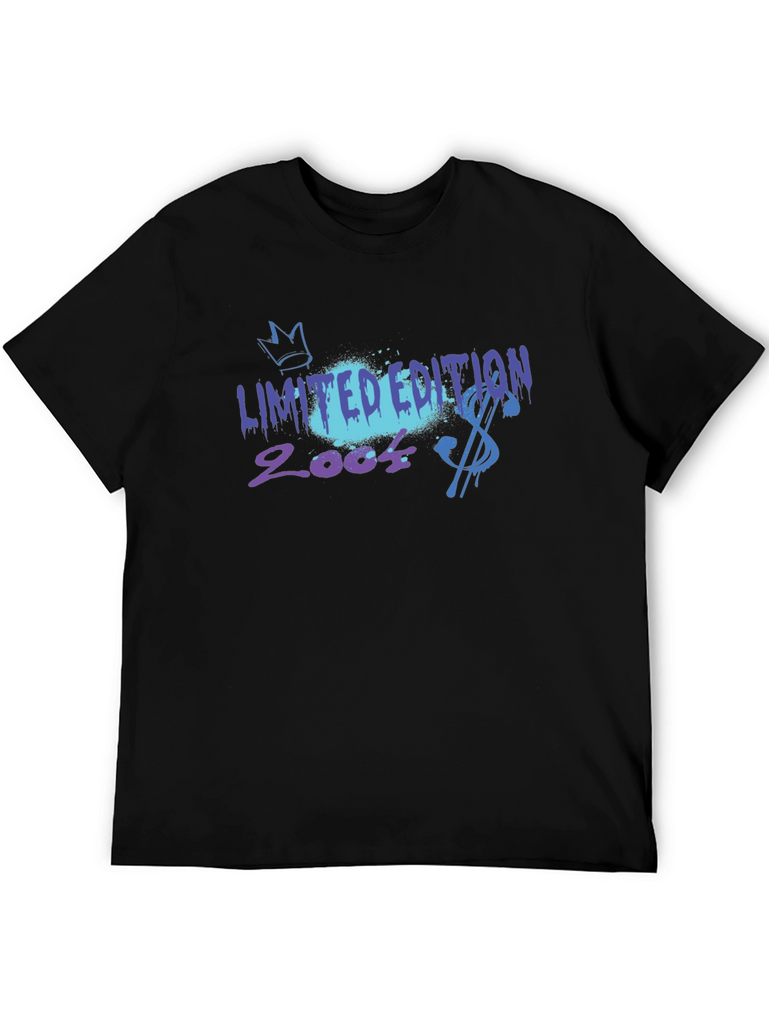Elevate your casual wardrobe with this stylish black t-shirt. Featuring a bold "Limited Edition 2004" graphic design, complete with a crown detail and dollar sign accent, this shirt adds an edgy touch to any outfit. The graphic is printed in shades of purple and blue, offering a cool, contemporary look. Made from comfortable, breathable fabric, this tee is perfect for everyday wear. Pair it with jeans or shorts for a relaxed yet fashionable style. Make a statement with this unique and eye-catching piece.