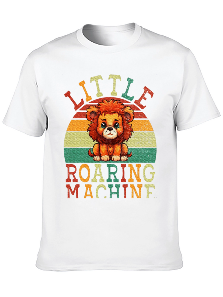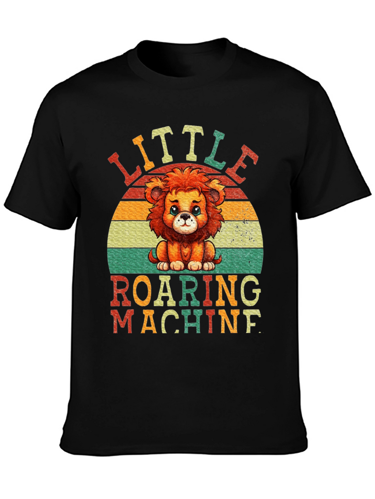 This adorable black t-shirt features a charming design of a cute lion cub sitting above the words "ROARING MACHINE" in a vintage-inspired font. The word "LITTLE" arches over the lion in a matching retro style. The design incorporates a multi-colored sunset-like arc behind the cub, adding a playful touch. Perfect for kids or anyone young at heart, this comfortable tee is sure to bring smiles. Its classic fit and soft fabric make it ideal for everyday wear or special occasions. Show off your playful side with this unique and eye-catching t-shirt. Let your inner roar be heard!