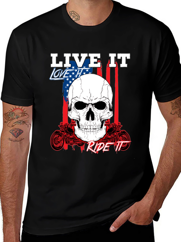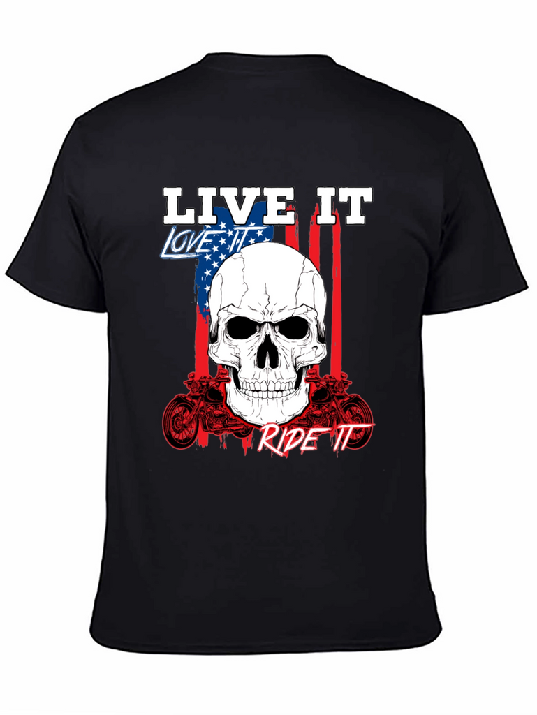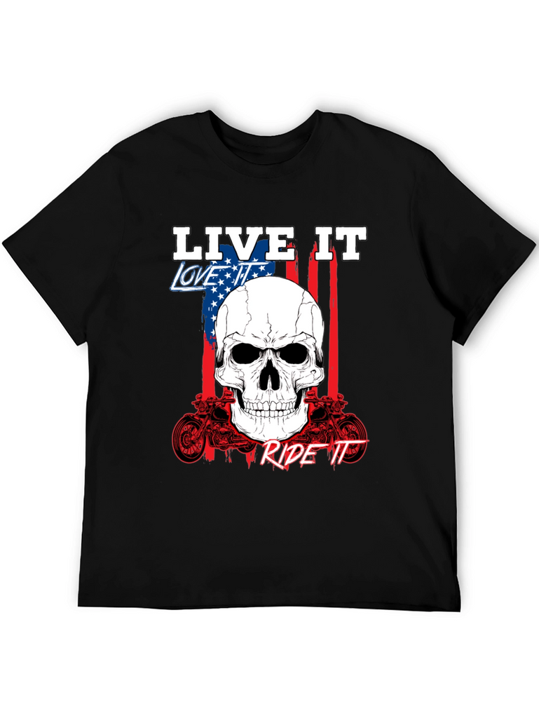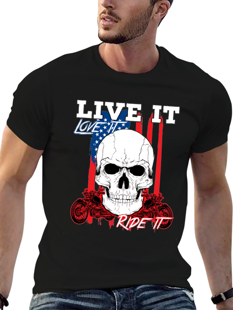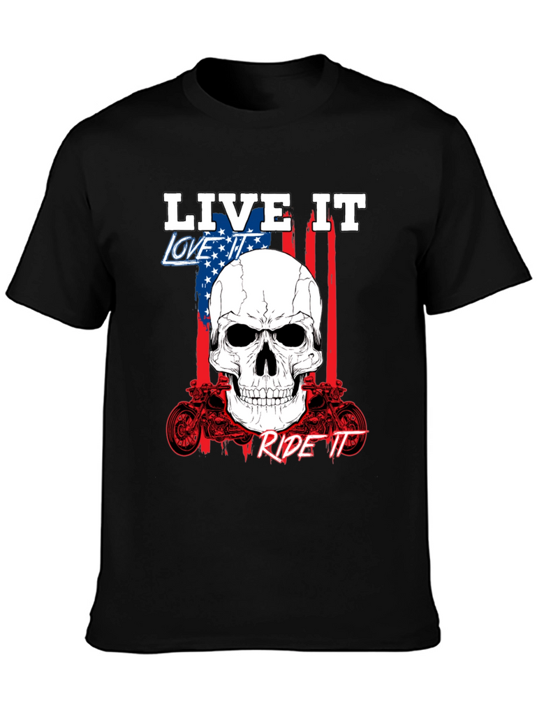 Show off your passion with this bold black graphic tee. Featuring a striking skull design overlaid on an American flag backdrop, this shirt embodies the spirit of freedom and adventure. The phrases 'Live It,' 'Love It,' and 'Ride It' are prominently displayed, completing the biker-inspired aesthetic. Crafted from comfortable fabric, it's perfect for everyday wear or hitting the open road. The detailed motorcycle graphics add an extra touch of rebellious style. Express yourself with this standout piece.