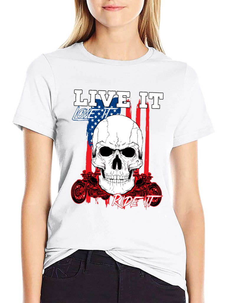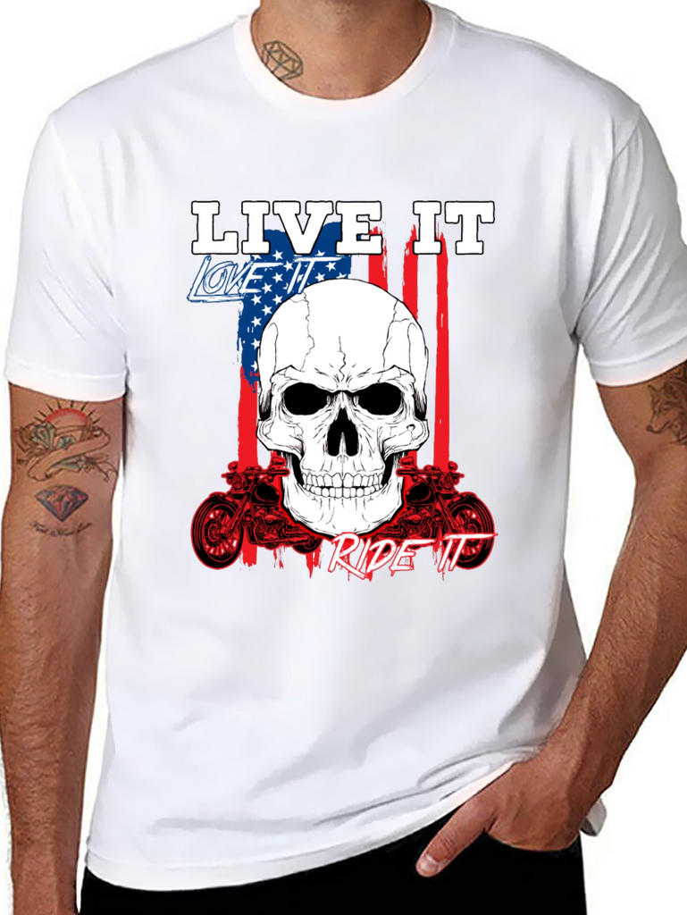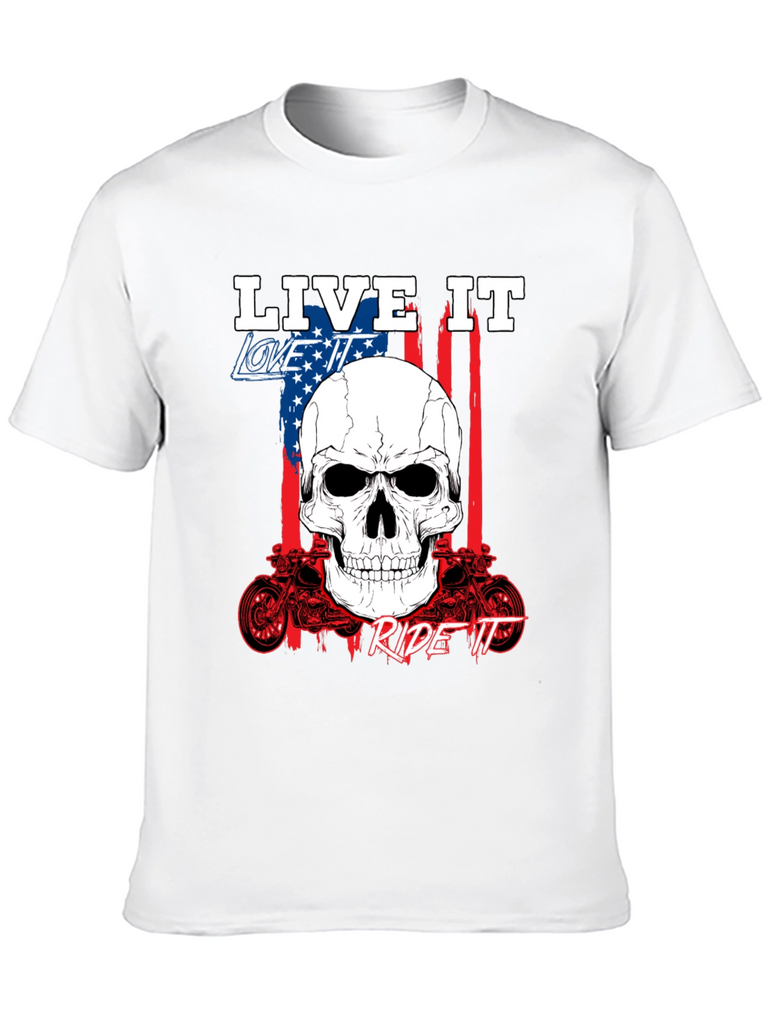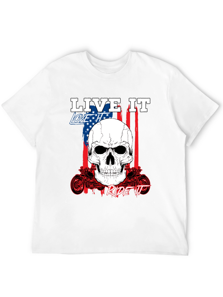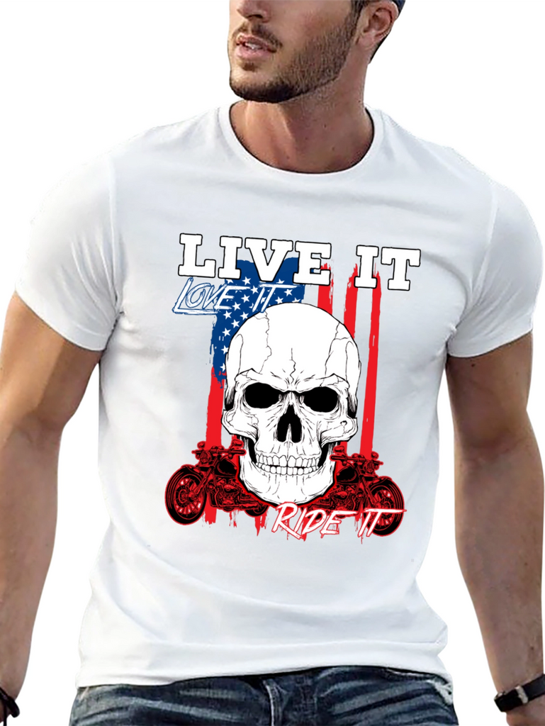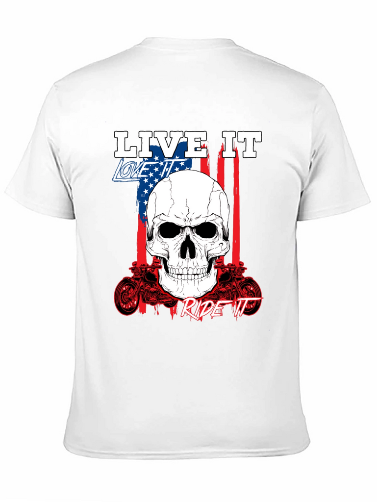 Show off your passion with this bold black graphic tee. Featuring a striking skull design overlaid on an American flag backdrop, this shirt embodies the spirit of freedom and adventure. The phrases 'Live It,' 'Love It,' and 'Ride It' are prominently displayed, completing the biker-inspired aesthetic. Crafted from comfortable fabric, it's perfect for everyday wear or hitting the open road. The detailed motorcycle graphics add an extra touch of rebellious style. Express yourself with this standout piece.