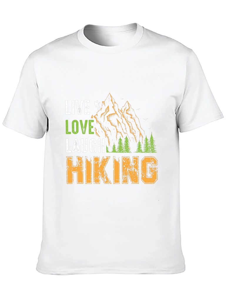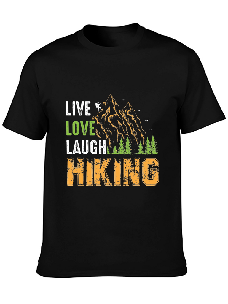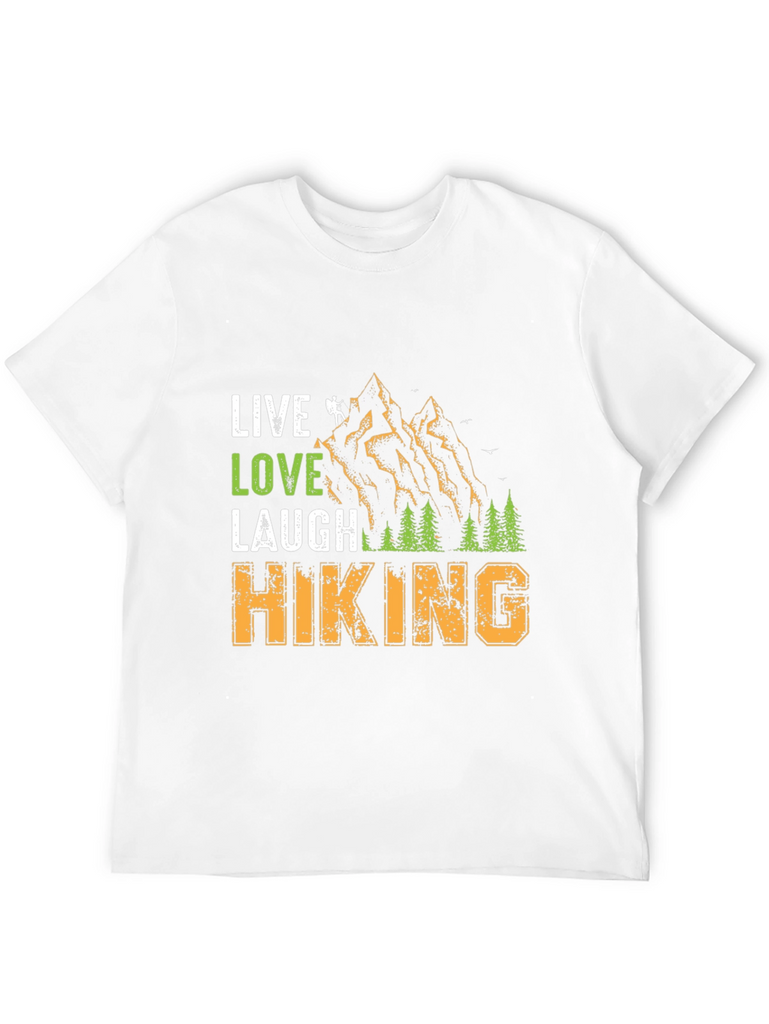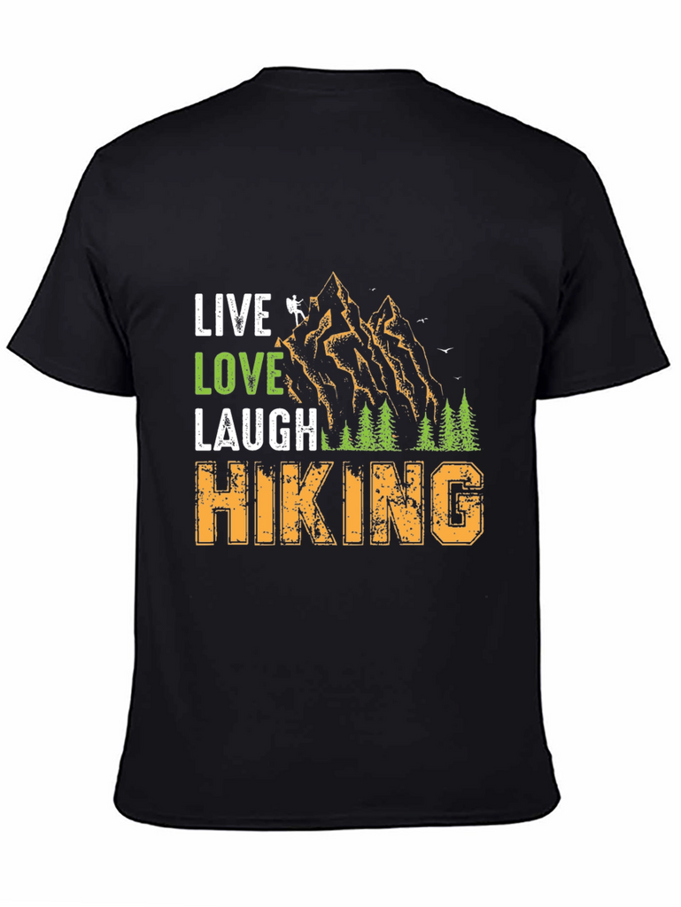 Embrace the call of the wild with this unique graphic tee. The design features "Live Love Laugh" stacked above a mountain landscape and the word "Hiking" below. The shirt is made from a comfortable, breathable fabric. This tee is perfect for nature lovers, hikers, and outdoor enthusiasts. Whether you're hitting the trails or relaxing at basecamp, let this shirt be a reminder of your passion for adventure. It's a great conversation starter and a stylish way to express your love for the great outdoors.