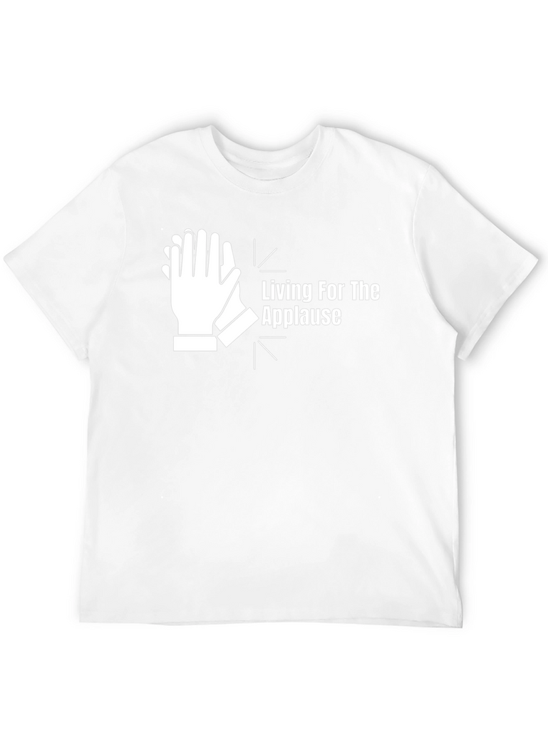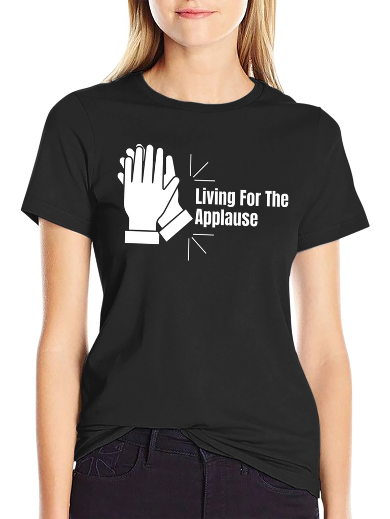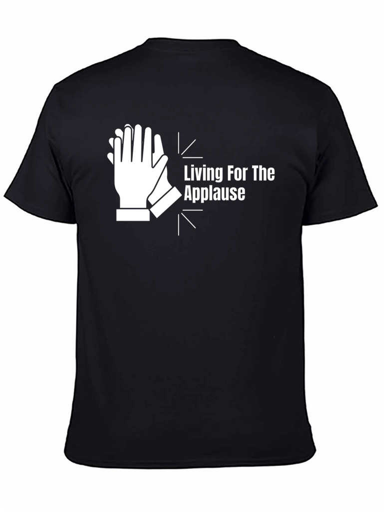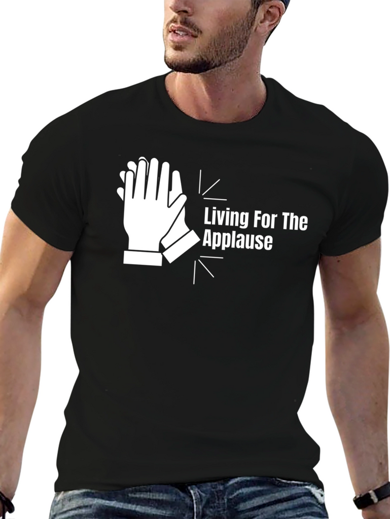 Show your love for the stage with this "Living for the Applause" graphic t-shirt. Made from comfortable, breathable fabric, this black tee features a bold white design of clapping hands. The eye-catching graphic and witty slogan are sure to turn heads and spark conversations. Ideal for performers, music lovers, or anyone who appreciates a good ovation. Perfect for casual wear, concerts, rehearsals, or simply expressing your passion for the spotlight.