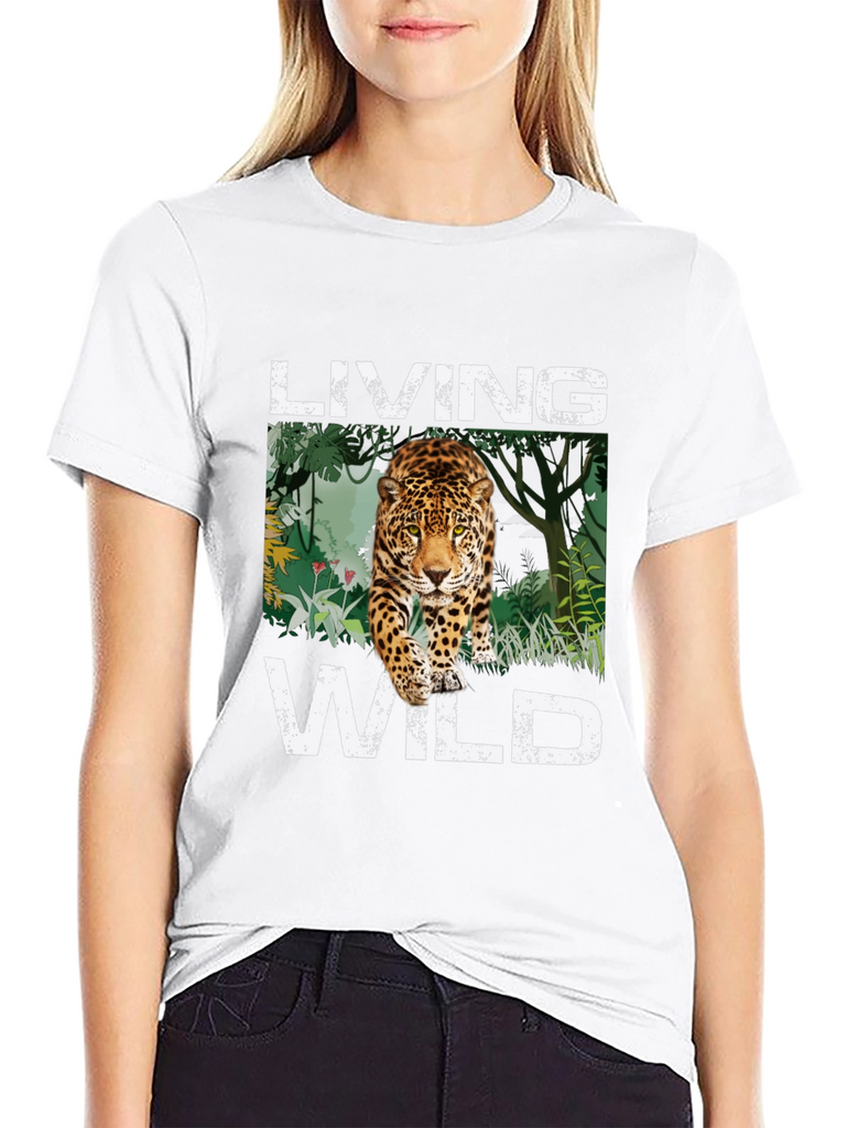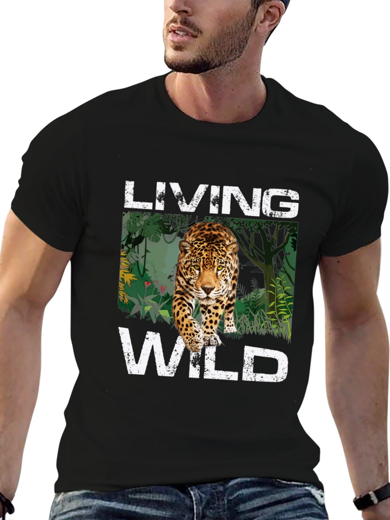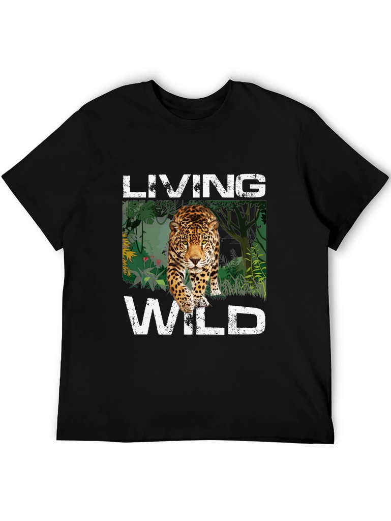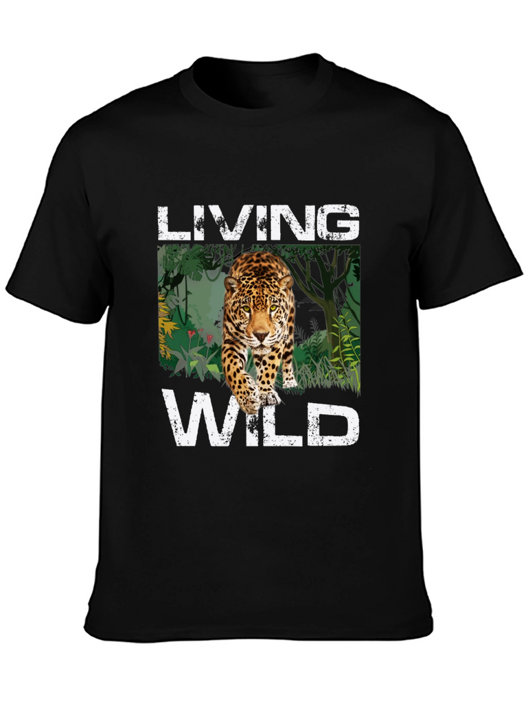 Unleash your wild side with this stylish black t-shirt! Featuring a vibrant graphic of a jaguar prowling through its jungle habitat, this tee makes a bold statement. The words "LIVING WILD" are printed in a distressed font above and below the central image, adding a touch of rugged charm. Perfect for casual wear, outdoor adventures, or simply expressing your love for wildlife. This comfortable and eye-catching tee is a must-have addition to any wardrobe. Grab yours today and showcase your untamed spirit!