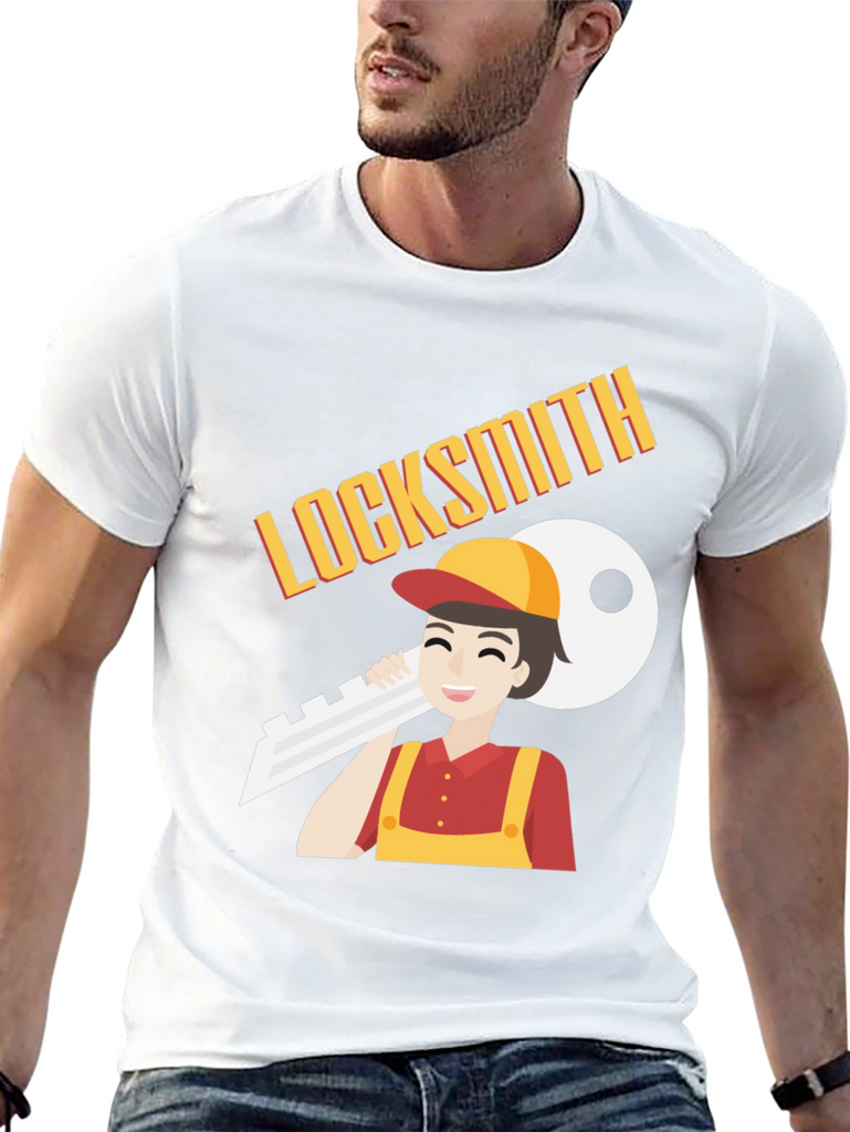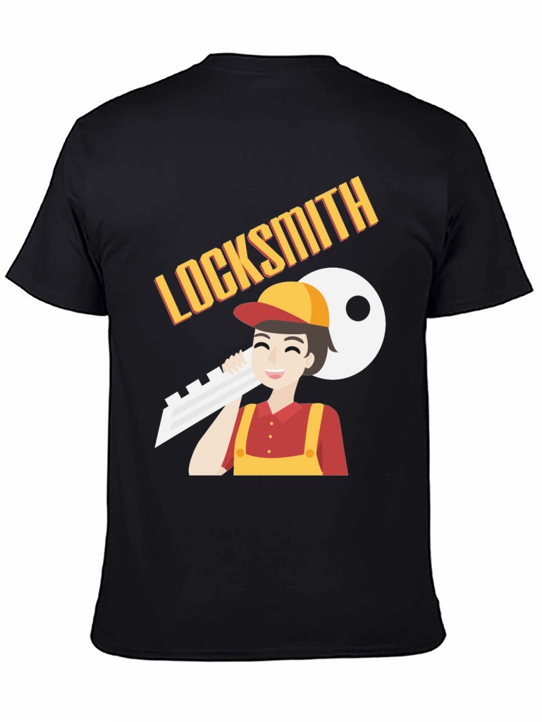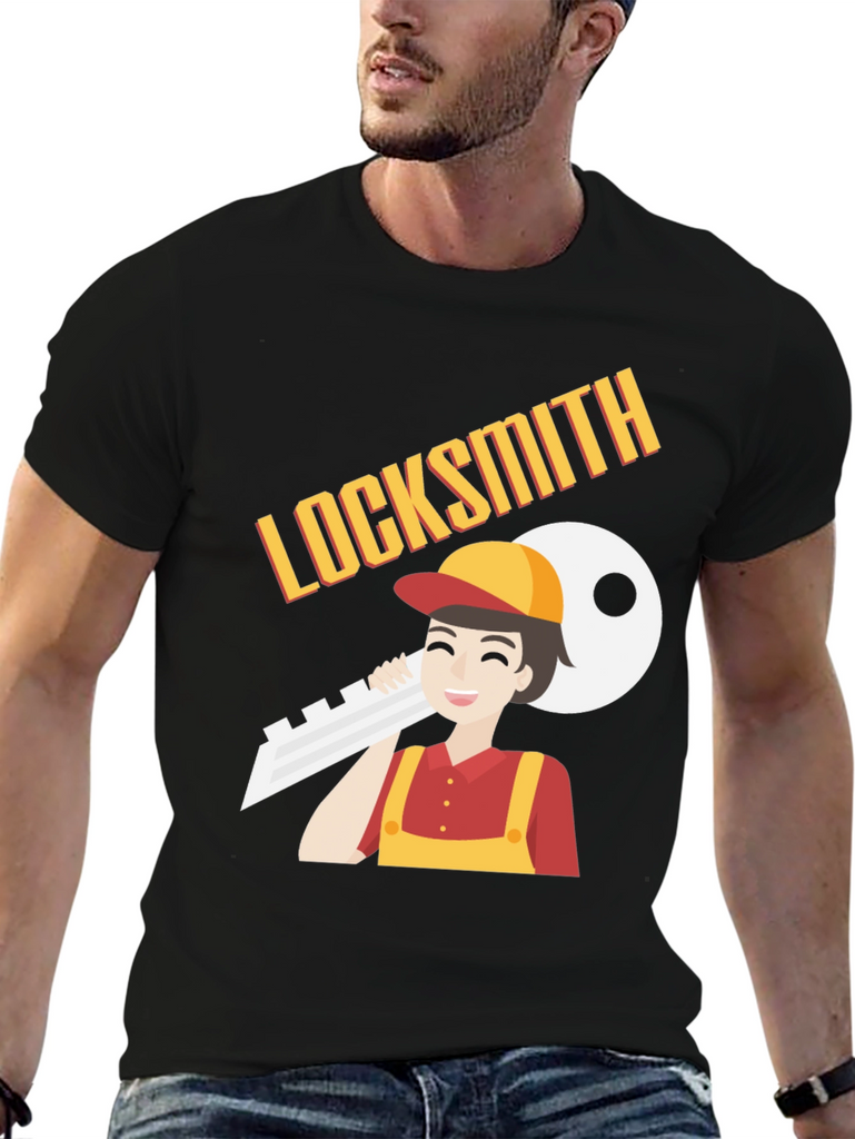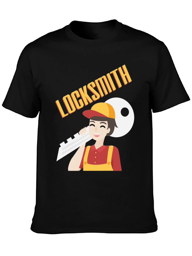 Show off your locksmith skills with this unique graphic tee! The black t-shirt features a cartoon image of a locksmith holding a large key. The vibrant colors of the print include red, yellow, and white, creating a fun and eye-catching design. Made from comfortable materials, this shirt is perfect for everyday wear, whether you're on the job or off duty. This locksmith t-shirt is a great conversation starter and a must-have for anyone in the trade. Make a statement with this stylish and practical addition to your wardrobe!