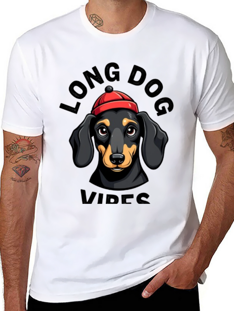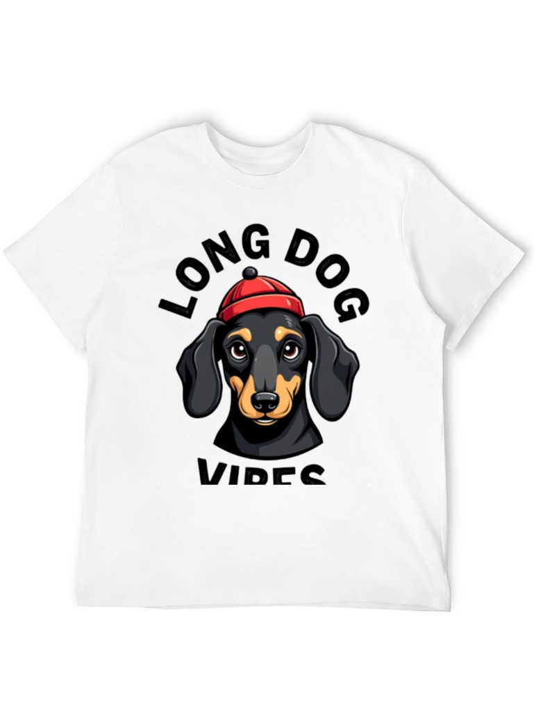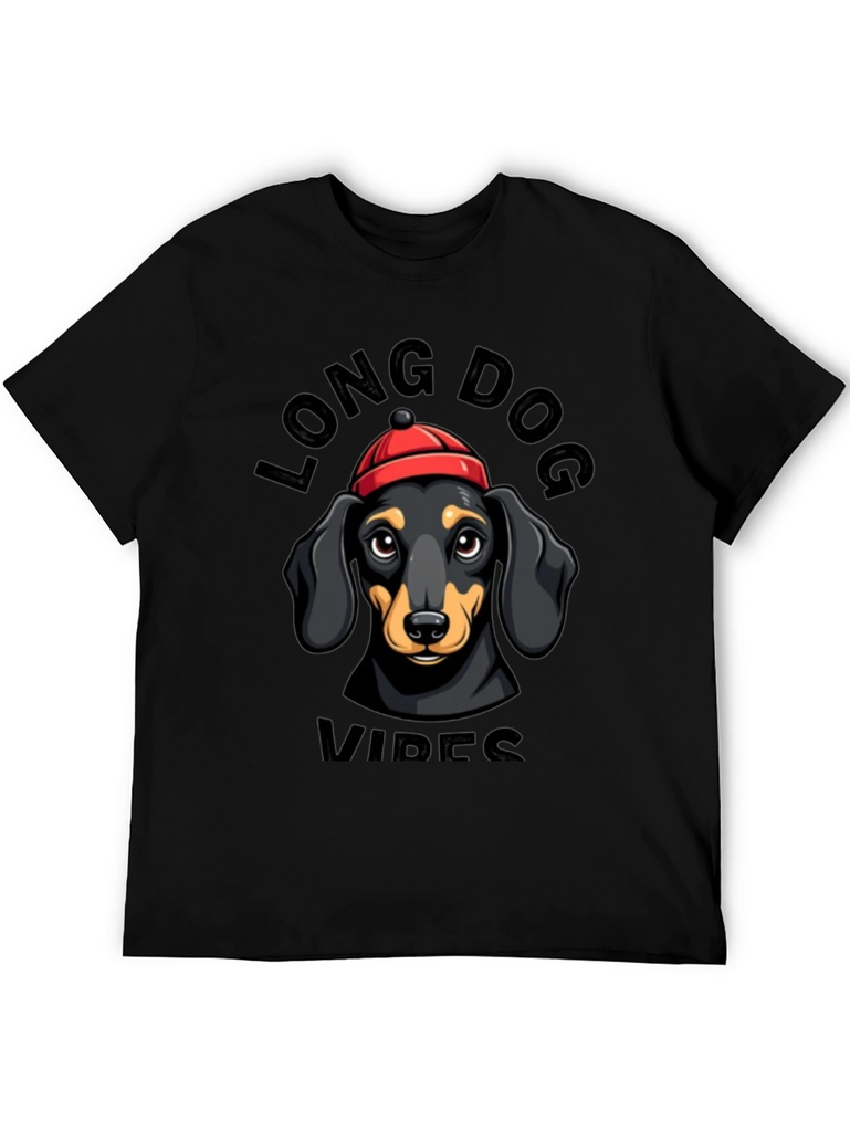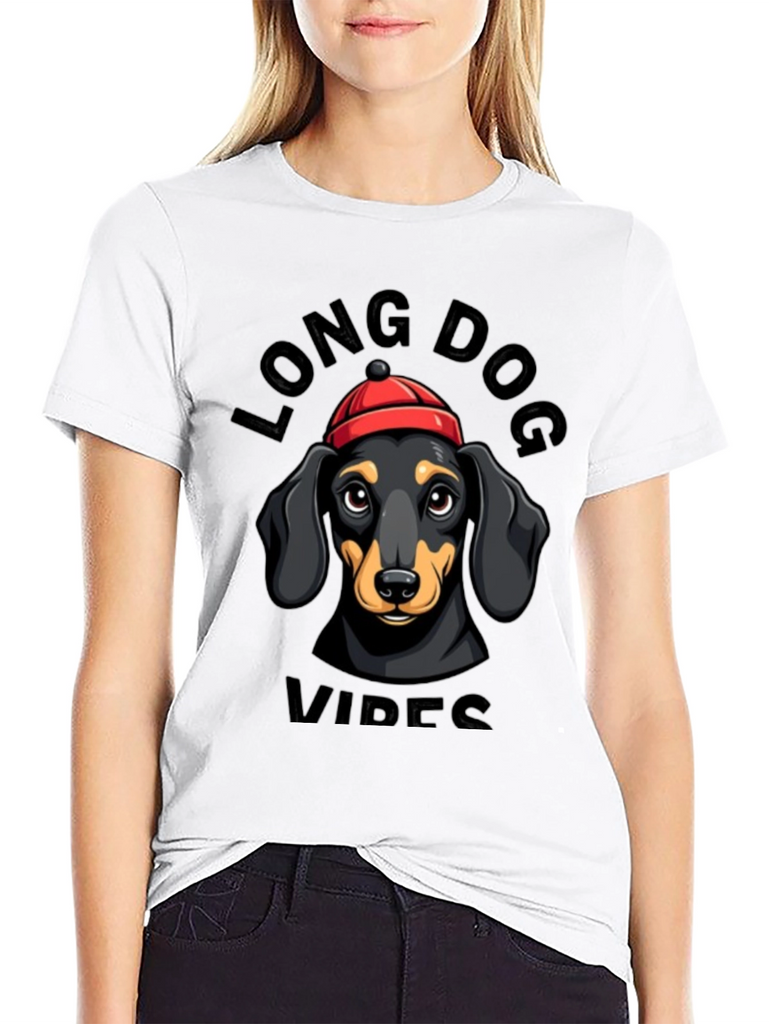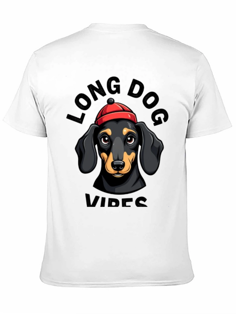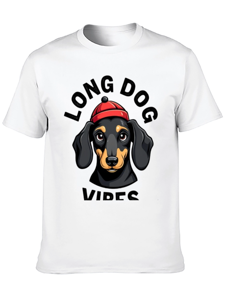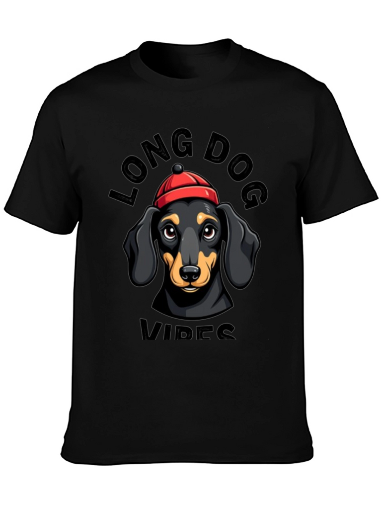 Show off your love for dachshunds with this unique "Long Dog Vibes" t-shirt. The shirt features a cartoon-style graphic of an adorable dachshund wearing a red beanie. The design is printed on a comfortable black t-shirt. Perfect for casual wear, dog walks, or as a fun gift for dachshund owners. This tee is sure to turn heads and spark conversations. Express your passion for your favorite breed with this stylish and eye-catching shirt.
