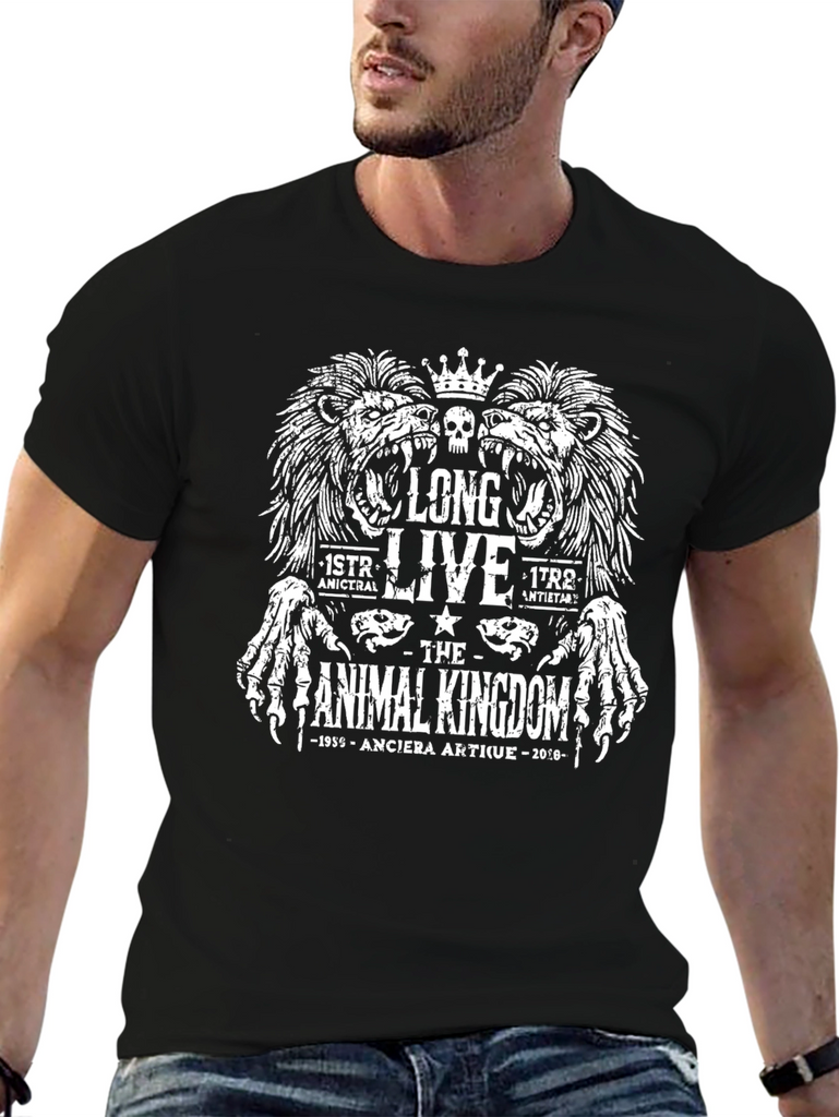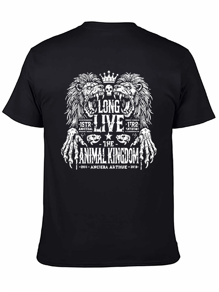 Show your love for the Animal Kingdom with this eye-catching black graphic t-shirt. The striking white design features two roaring lions under a crown with skull designs, and above the text "Long Live The Animal Kingdom" in bold, gothic-inspired lettering. The design also includes "1955-Anciera Artique-2010." Made from what appears to be a soft, comfortable cotton blend, this tee is perfect for casual wear. Its unique and detailed graphic makes it a great conversation starter. Ideal for animal lovers, fans of unique designs, or anyone looking to add a touch of edgy style to their wardrobe.