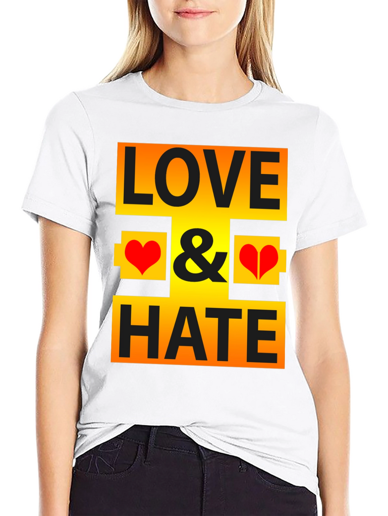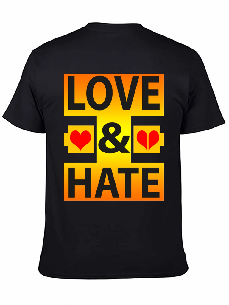 Show your emotions with this bold black t-shirt featuring a striking 'Love & Hate' graphic design. The design incorporates vibrant orange rectangles surrounding the words "Love" and "Hate", separated by a stylized ampersand (&) and heart shapes. Made from a soft, comfortable fabric, this tee offers a relaxed fit that's perfect for everyday wear. The eye-catching graphic is sure to spark conversations and showcase your unique style. Whether you're expressing your inner feelings or simply making a statement, this t-shirt is a must-have addition to your wardrobe. Ideal for casual outings, concerts, or just lounging around. This Love and Hate graphic tee makes a great gift for friends or family.
