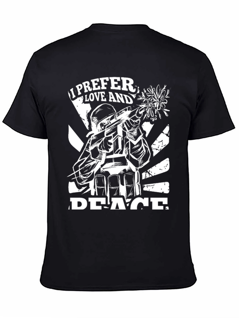 Embrace a powerful message with this striking black graphic t-shirt. The design features a soldier holding a rifle, juxtaposed with delicate flowers, underscored by the bold statement "I PREFER LOVE AND PEACE." The graphic is printed in crisp white, providing a high contrast against the black fabric. This tee is perfect for those who want to make a statement about their values. Wear it to casual events, rallies, or as an everyday reminder of the importance of peace and understanding. Made from comfortable materials for lasting wear and style.