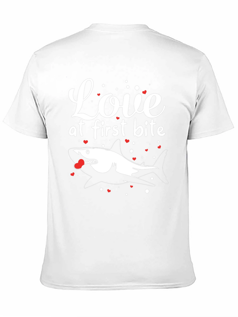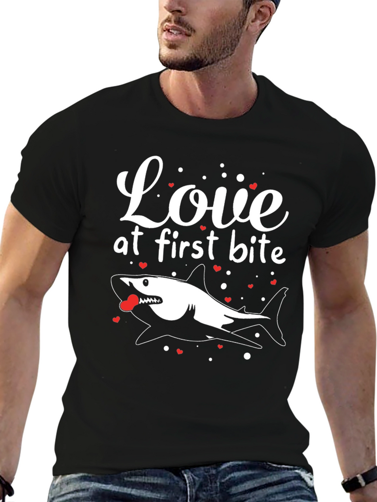 Show your love with this unique Valentine's themed T-shirt. This black, short-sleeved tee features a charming design with the text 'Love at first bite' and a cute shark graphic. The design incorporates playful hearts for a festive touch. Perfect for casual wear, Valentine's Day parties, or as a fun gift for shark lovers with a sense of humor. Made from a soft, comfortable fabric for all-day wear. Express your affection with this creative and eye-catching shirt!