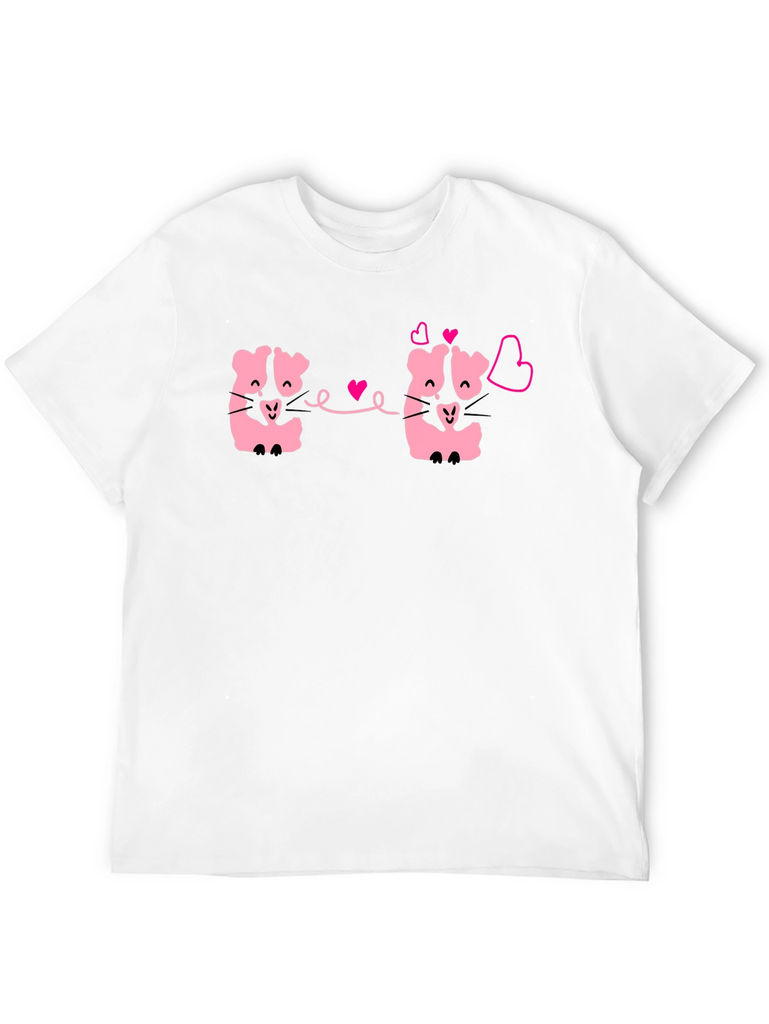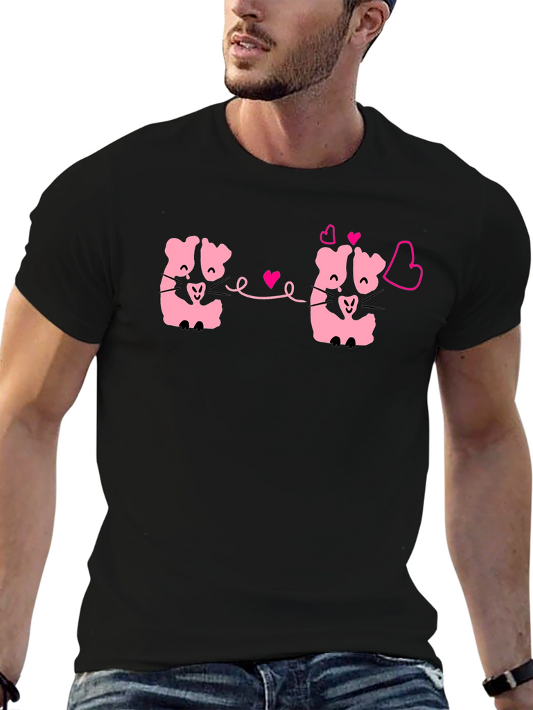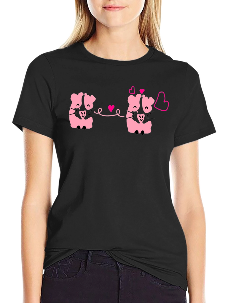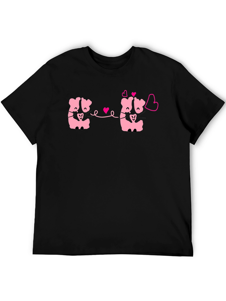 Show your love with this adorable black t-shirt! Featuring two cute pink bears connected by a string of hearts, this tee is perfect for Valentine's Day or any day you want to spread some love. The charming design adds a playful touch to your wardrobe. Made from a comfortable, breathable fabric, it's ideal for casual outings, lounging at home, or as a sweet gift for someone special. Let this delightful bear design bring a smile to your face and warm your heart.