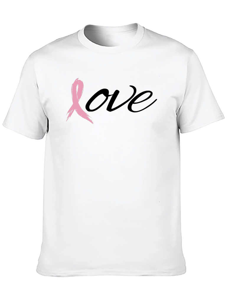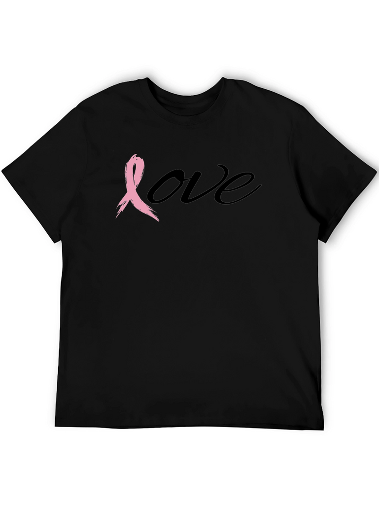 Show your support with this stylish black t-shirt featuring a pink breast cancer awareness ribbon integrated into the word "love." The shirt has a classic fit with short sleeves and a crew neck. The simple design makes it perfect for raising awareness, attending charity events, or everyday wear. The dark background allows the pink ribbon to stand out, making a clear and powerful statement. This is a comfortable and fashionable way to show your solidarity and support for breast cancer awareness. Wear it proudly and spread a message of hope and love.