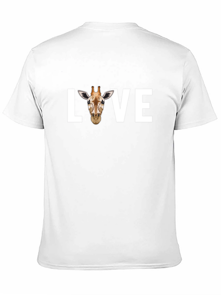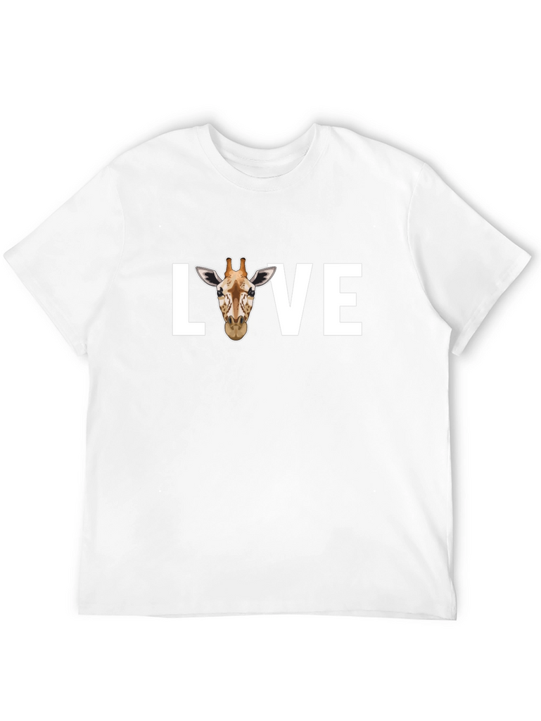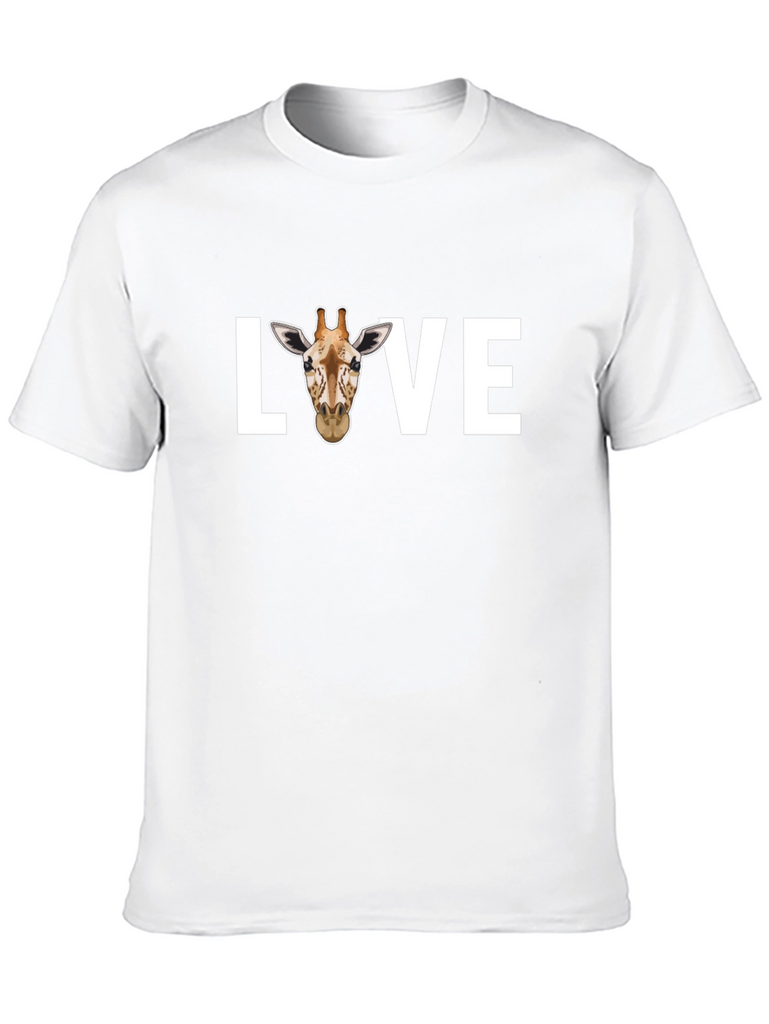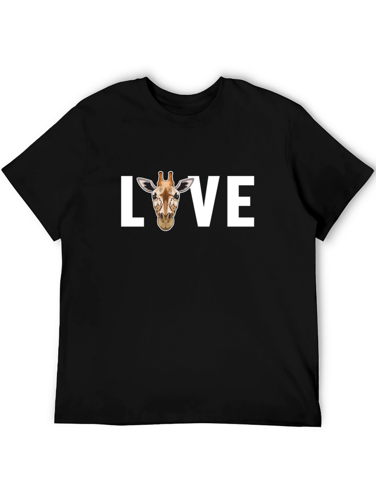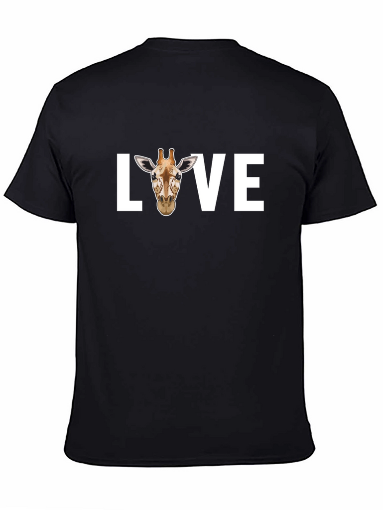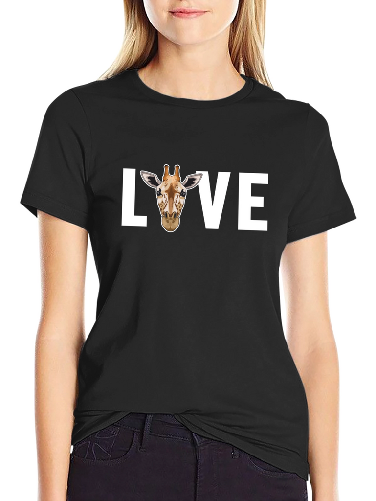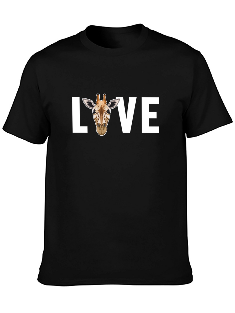 Show your love for giraffes with this stylish black t-shirt. The shirt features the word "LOVE" in bold white letters, with a detailed giraffe head replacing the "O", giving it a playful and unique design. Made from a soft, comfortable cotton blend, this tee is perfect for casual wear and makes a statement. The classic black color ensures it pairs well with a variety of outfits. Wear it to the zoo, on a casual date, or just lounging around – it's sure to spark conversation and show off your fun side! A great addition to any animal lover's wardrobe.