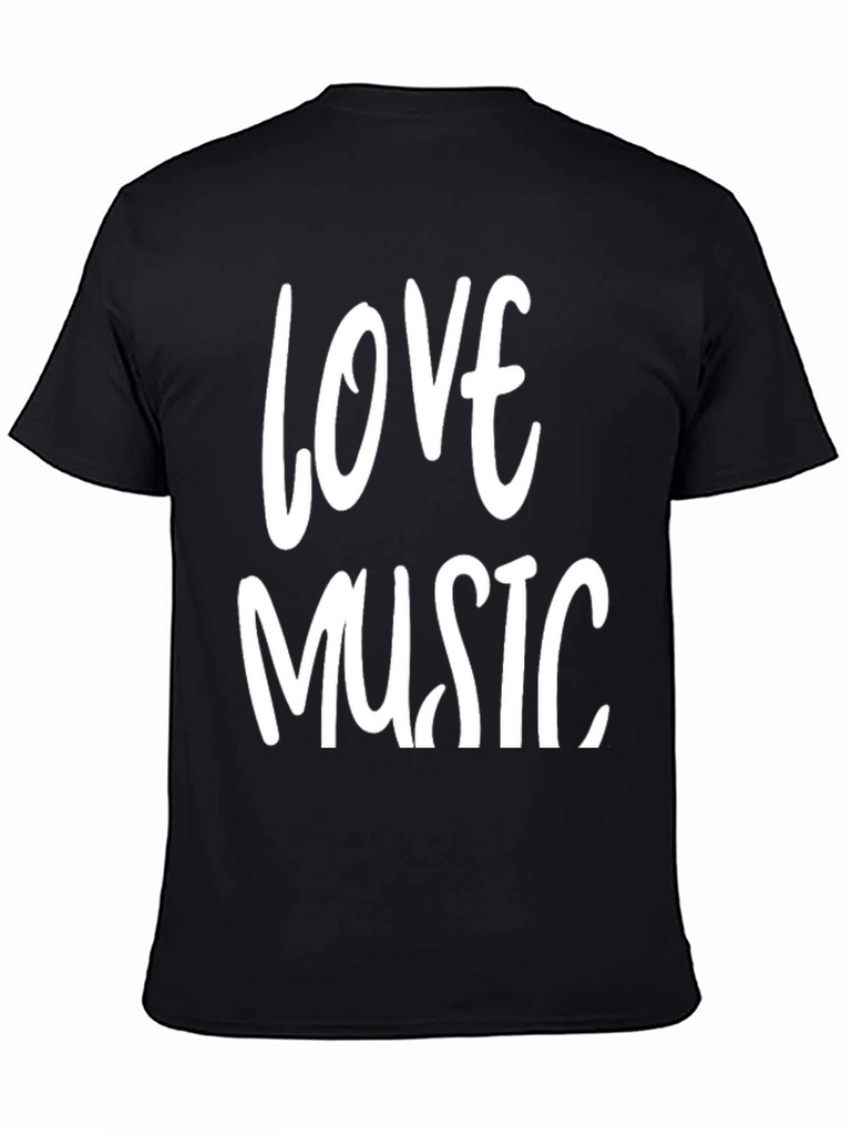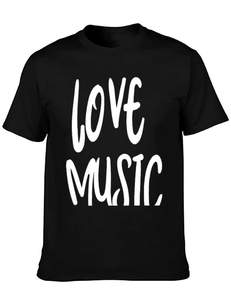Showcase your passion for music with this stylish black graphic tee. The shirt features the phrase "Love Music" in a bold, white, eye-catching font. Made from a soft, comfortable fabric, this t-shirt is perfect for everyday wear. Its classic fit and short sleeves make it ideal for casual outings, concerts, or simply expressing your love for music. The black backdrop ensures the white lettering pops, making a statement. A must-have for music enthusiasts who appreciate comfortable and fashionable apparel. Get yours today and let your love for music shine!