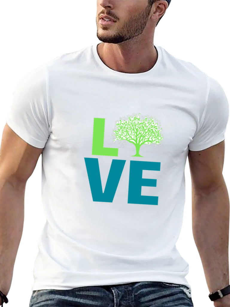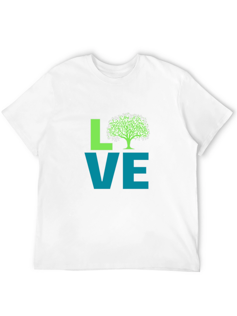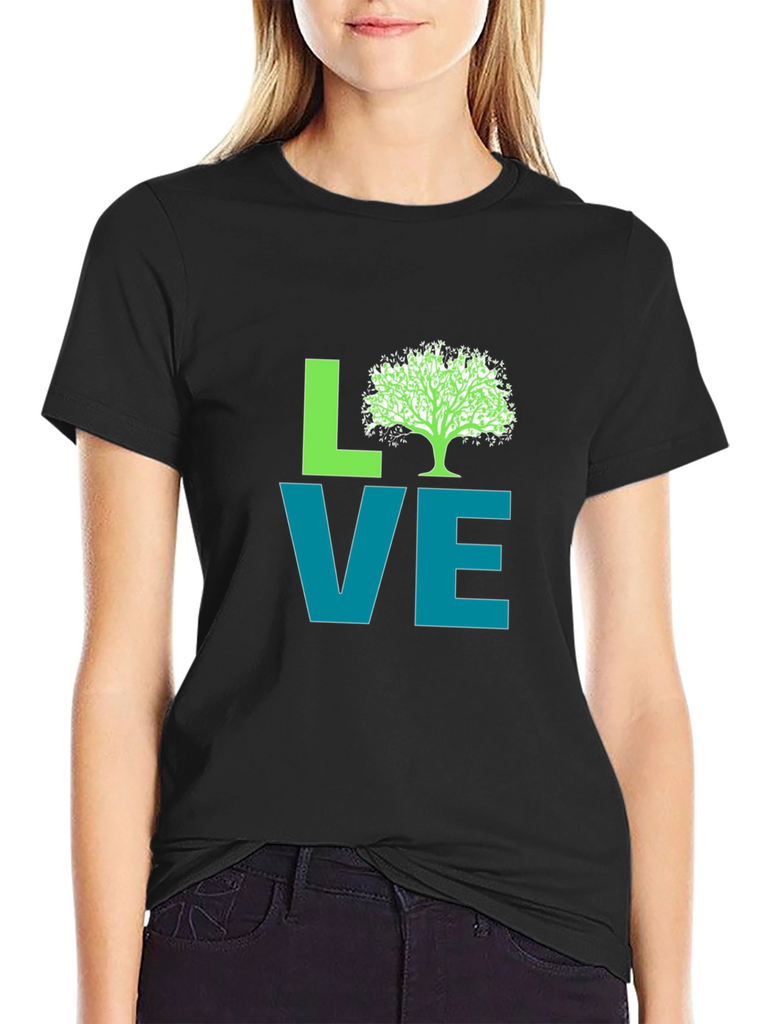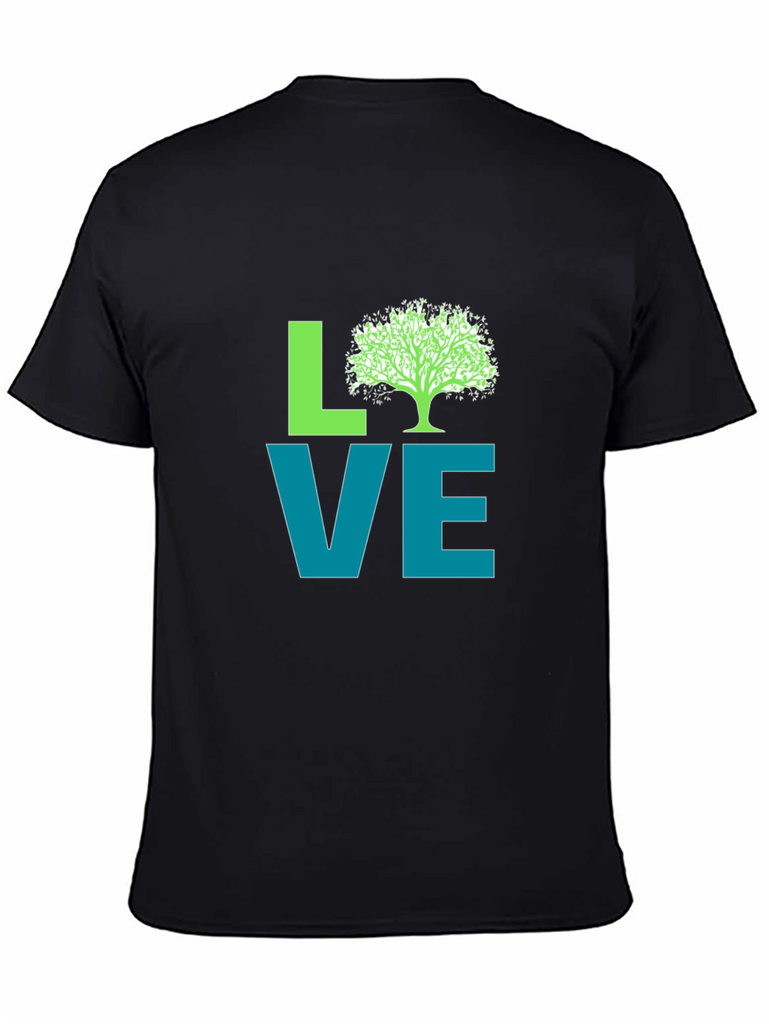 Show your love for nature with this stylish black graphic tee. The shirt features a creative design incorporating the word "LOVE", with a vibrant green tree taking the place of the "O". The letters "L" and "E" are a cool teal. Made from a soft, comfortable fabric, this tee is perfect for everyday wear. Whether you're hiking in the woods or just relaxing at home, this shirt is a great way to express your passion for the environment. Get yours today and spread the love of nature!